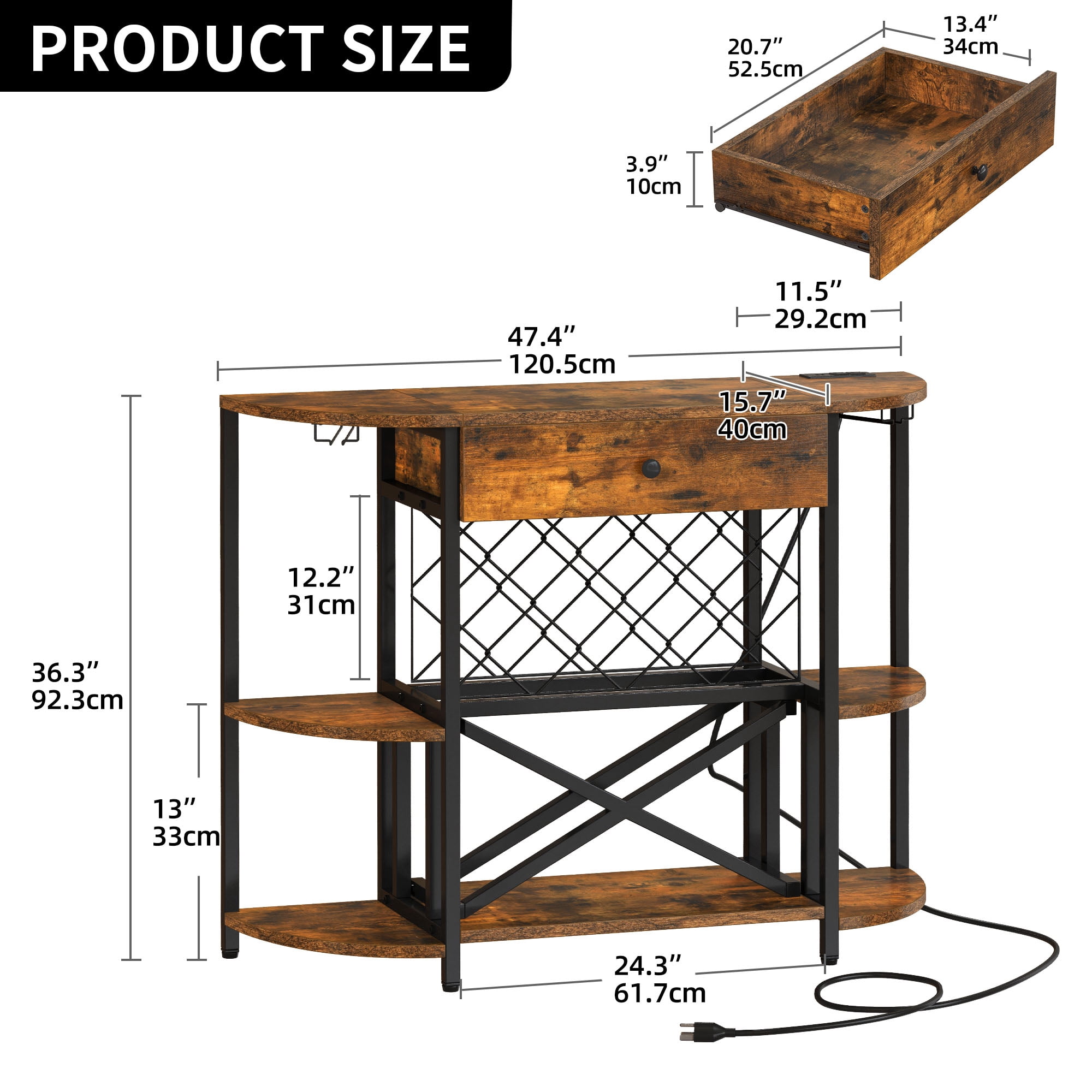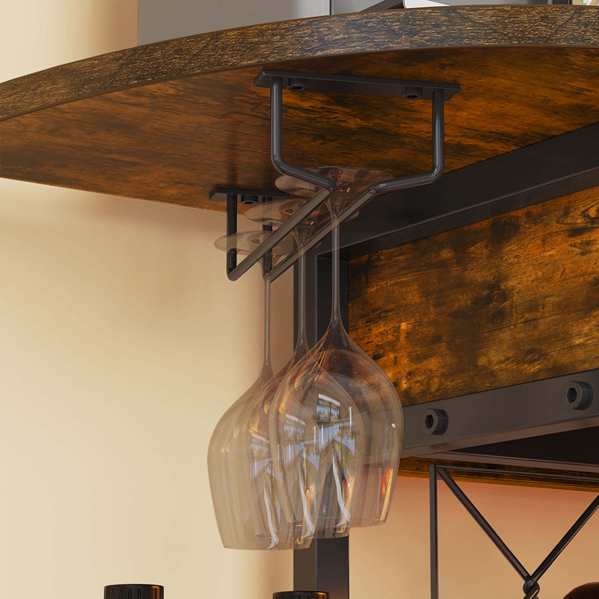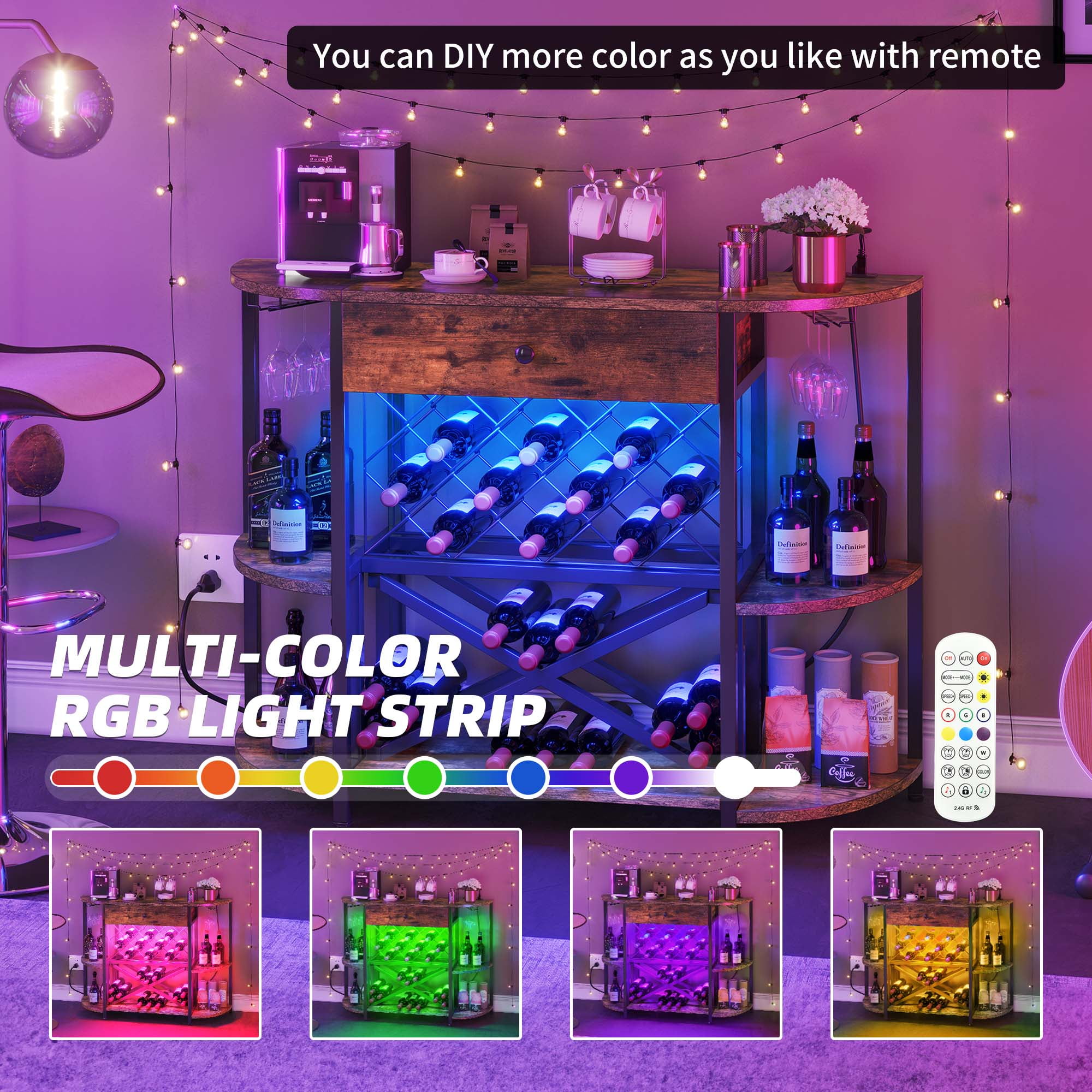 Practical Socket Design: Our coffee bar is intelligently designed with convenient power outlets, including 2 AC plugs and 2 USB ports. This allows you to effortlessly use household appliances like coffee machines and bread makers, as well as charge your devices such as phones and tablets. Vibrant LED Ambient Lights: Elevate the ambiance of any gathering with our mini bar table featuring colorful LED lights. With the convenience of a remote control, you can effortlessly create a mesmerizing atmosphere that leaves a lasting impression on your guests, making every party unforgettable. Effortless Assembly: Our liquor bar cabinet is designed for easy assembly. With detailed instructions featuring clear visuals and labeled parts, you can have it put together in approximately 40 minutes. Enjoy the convenience of a stylish and functional bar without the hassle of complicated assembly processes. Perfect Size for Wine Bar: Measuring at 47.4″ D * 15.7″ W * 36.3″ H, our bar table is an ideal size for wine bars and small spaces. The unique semi-circular and X-shaped door design adds a touch of aesthetic appeal, while the built-in wine rack and glass holders provide ample storage space for all your bar and kitchen essentials. Durable & Sturdy Construction: Crafted from durable engineered wood and reinforced with a sturdy metal frame, our bar cabinet ensures superior strength and durability. Capable of supporting up to 200 lbs, it provides a stable and secure platform for your drinks. Additionally, adjustable footpads ensure stability on any type of flooring while keeping your beverages safe and secure.