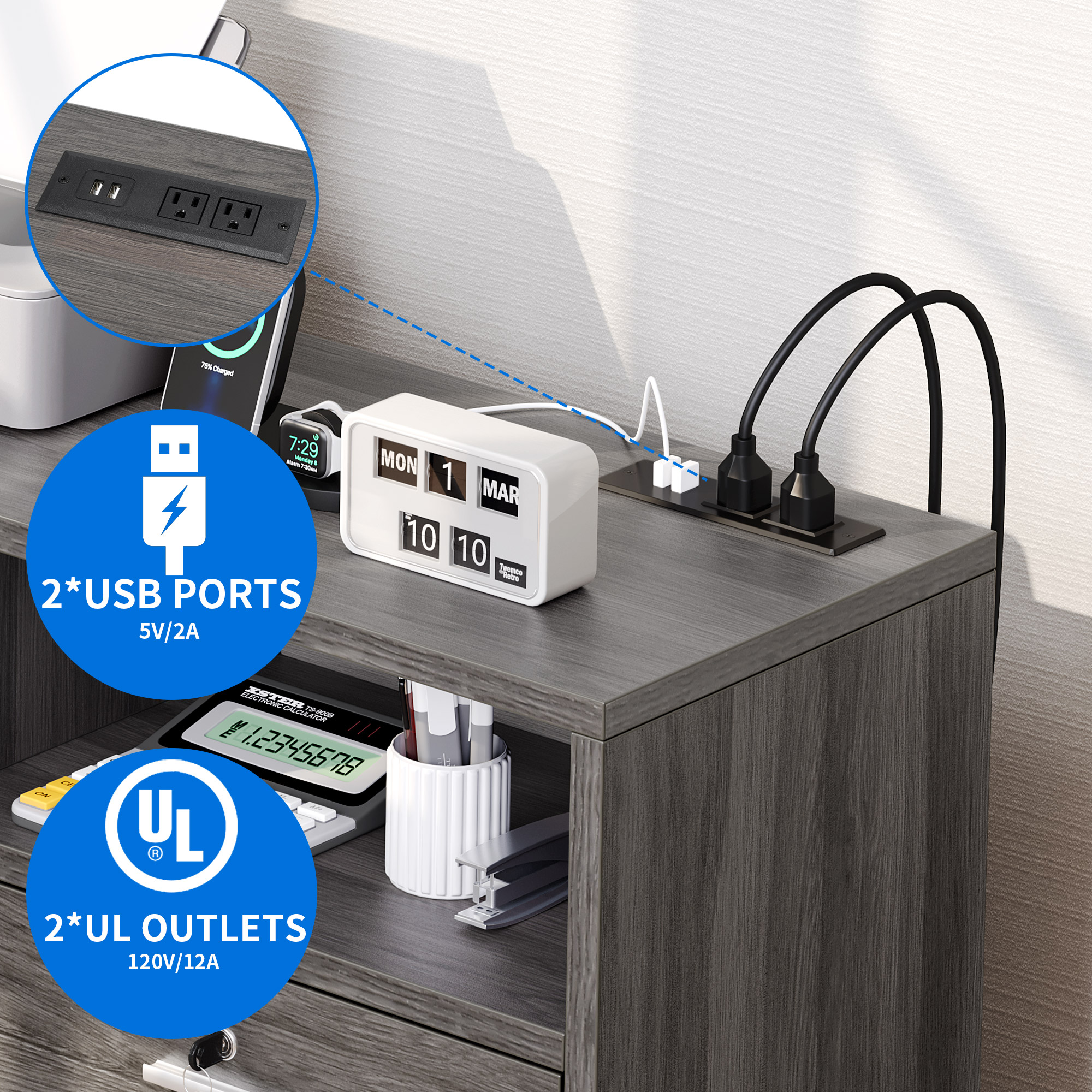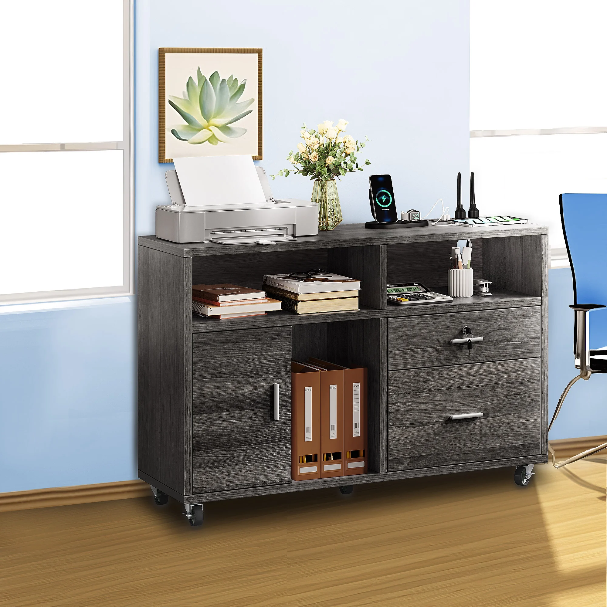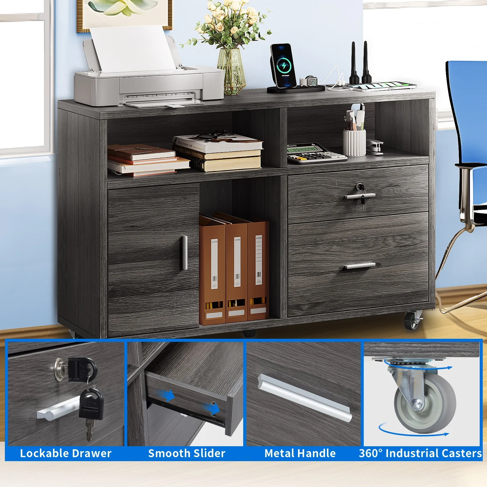 Dextrus Wood File Cabinet with Charging Station and Lock, 2 Drawer Mobile Lateral Filing Cabinet, Gray