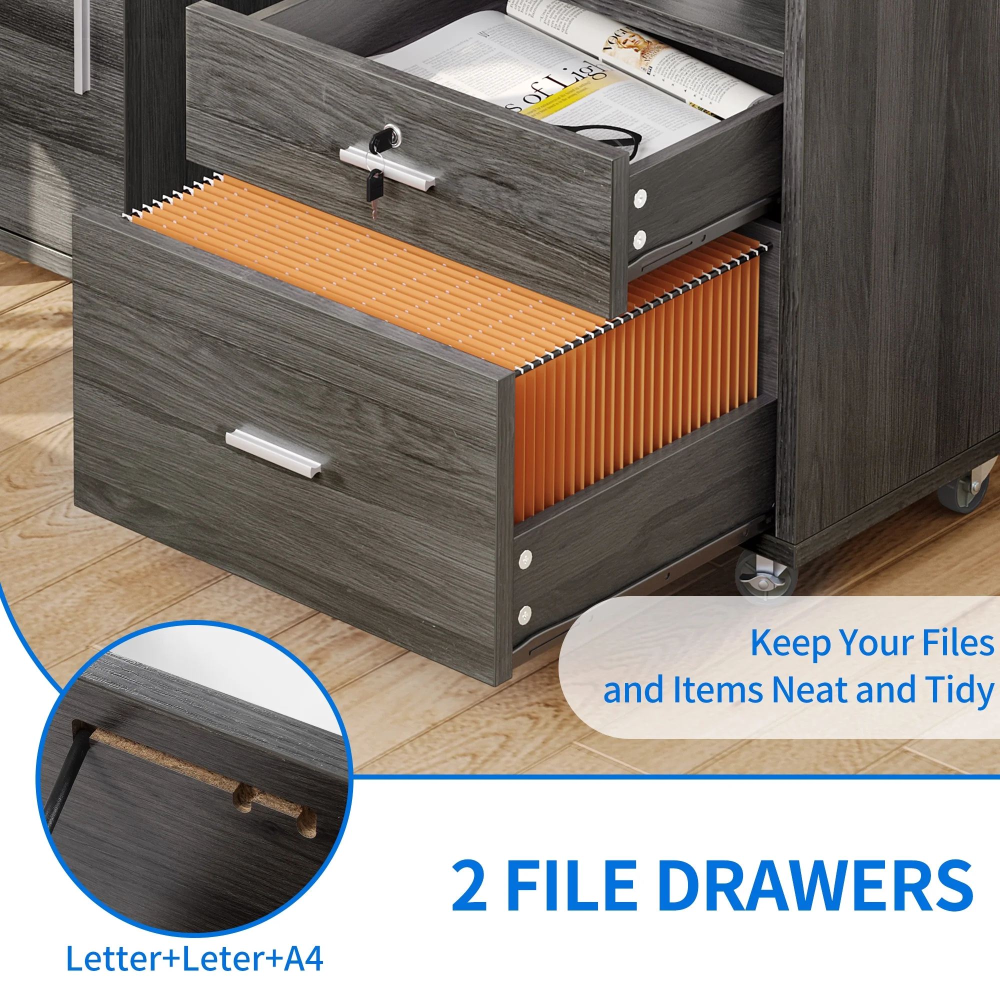 Secure Document Storage: The bottom drawer of this storage cabinet features removable hanging bars and can be locked, providing a secure storage solution for A4 letter and legal-sized documents. Versatile and Stylish: This storage cabinet is not only functional but also adds a touch of style to any office or home. Its modern design blends well with any decor, making it a versatile choice for organizing office machinery, files, and supplies. Ample Storage Space: With a wide desktop for a printer or plants, 3 open storage compartments for binders and baskets, and 2 drawers for files and other items, this cabinet provides ample storage space to keep your workspace organized and clutter-free. Sturdy and Easy to Move: Made with 0.63” thick boards and equipped with 5 sturdy industrial casters, this file cabinet is built to last. It can hold up to 100 lbs and is easy to move around, allowing you to rearrange your workspace as needed. Easy Assembly and Excellent After-Sale Service: The cabinet comes with all the necessary hardware and clear instructions for quick and easy assembly. In case of any issues, our dedicated after-sale service team is ready to assist you and ensure your satisfaction. Durability and Stability: Crafted with thick P2 wooden board, this file cabinet is built to last and can support up to 110lbs. The addition of an anti-tip metal buckle ensures stability and allows you to secure the cabinet to the wall for extra peace of mind.