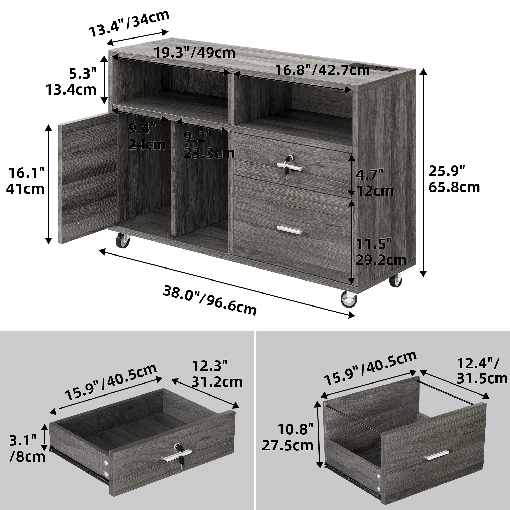 The Wood Lateral File Cabinet is a handy piece for your home office. It’s mobile, so you can move it around easily, and it has space for all your file sizes, including A4, letter, and legal. It also works as a printer stand and has shelves for books or decorations. You can charge your devices with the 2 USB ports and outlets it has. The cabinet rolls on all directions and locks to keep your documents safe. Made of good wood, it looks great and is a useful addition to your office. Specifications: Color: Grey,White Material: Engineered Wood Overall Size: 13.4″D x 38″W x 26″H Number of Drawers: 2 Number of Doors: 1 Item Weight : 63.49 pounds Room Type: Entryway, Bedroom, Living Room, Home Office Assembly Required:Yes Package Included: 1 x File Cabinet 1 x Instructions 1 x Accessory Kit