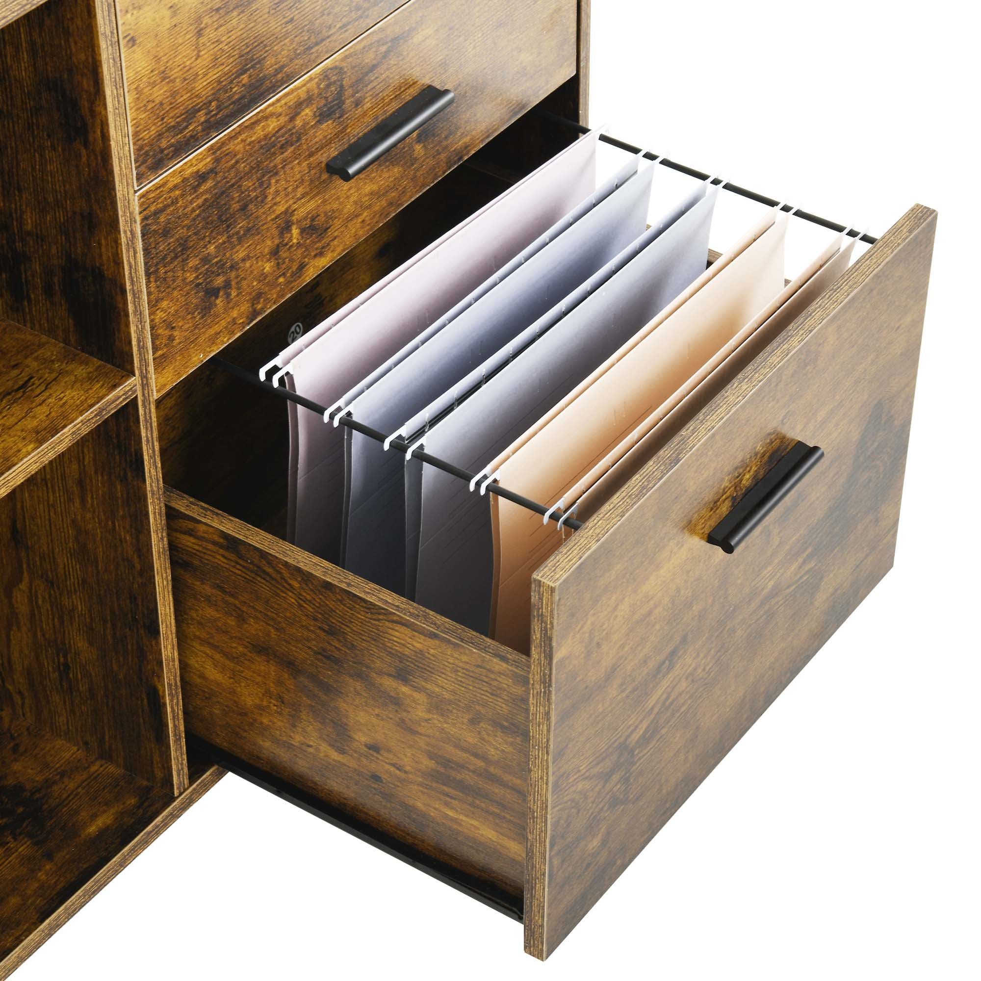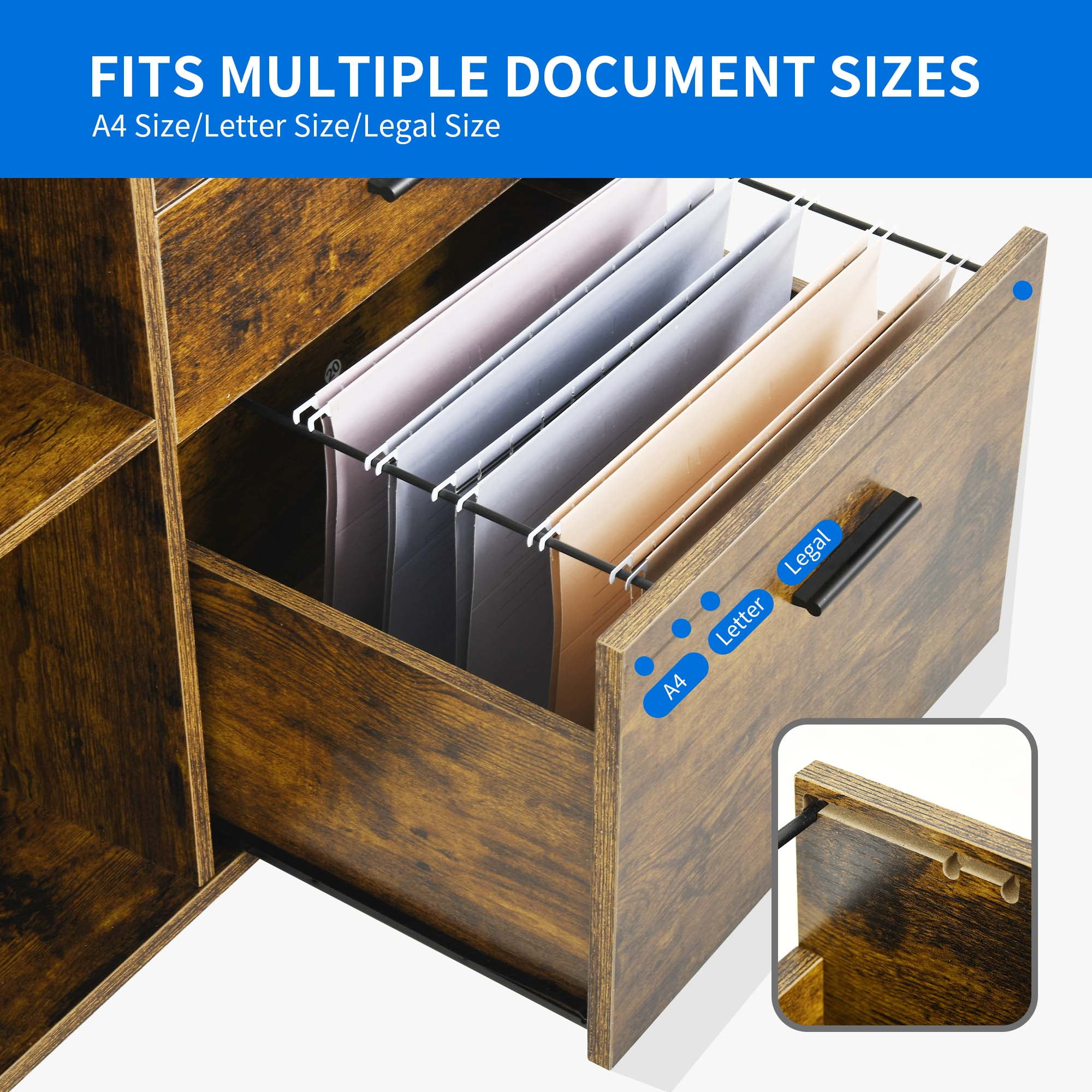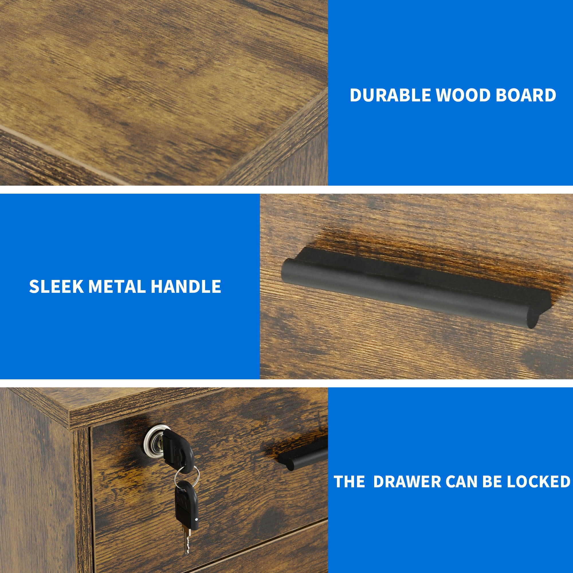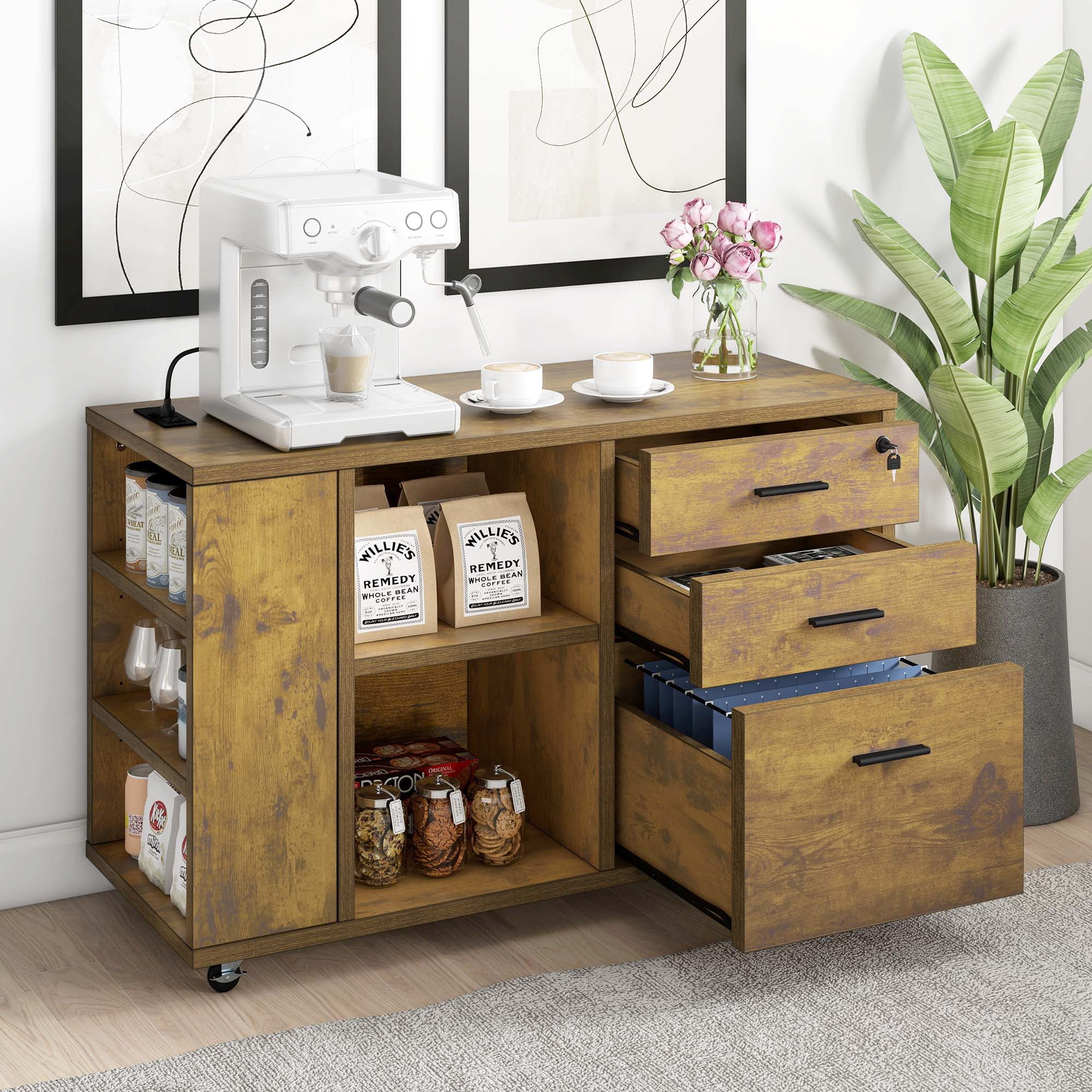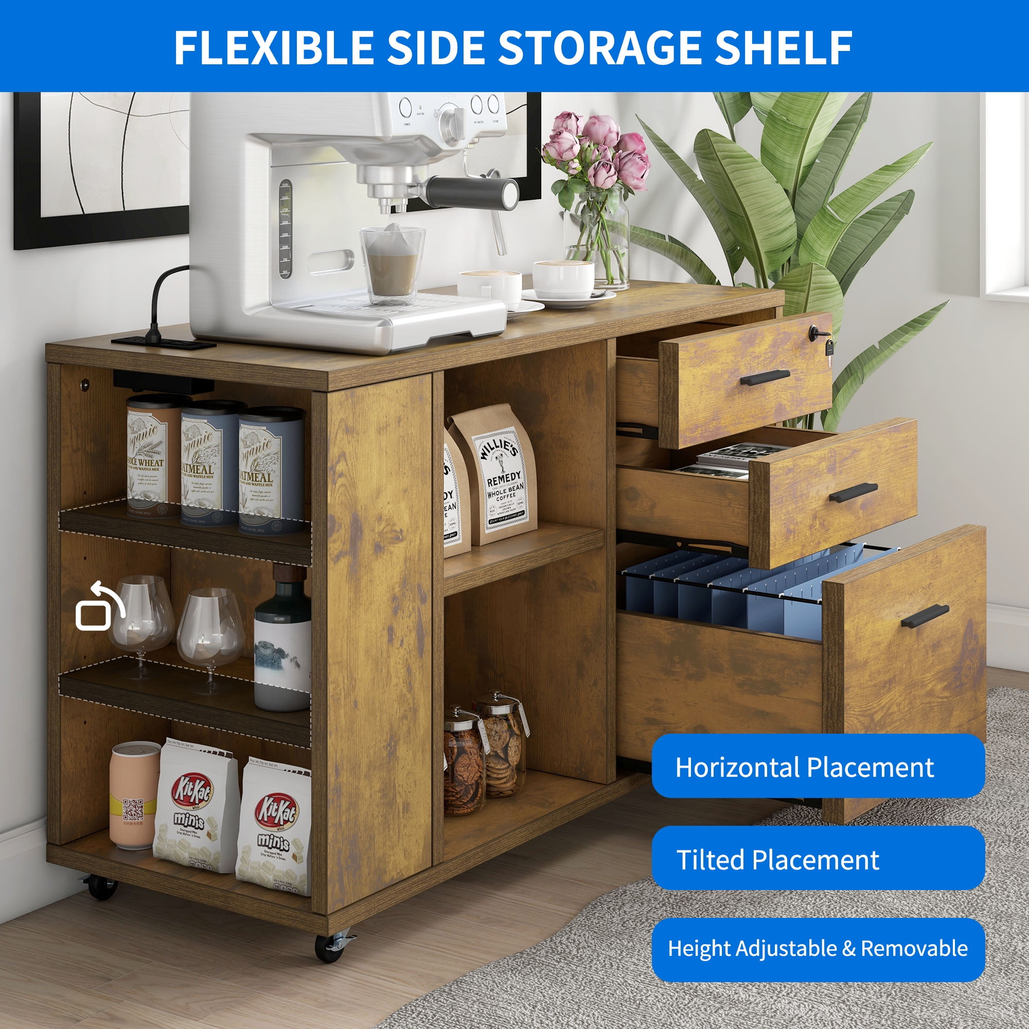 Convenient Charging: With 2 UL-Listed outlets, 2 USB ports, and a 6.5-foot power cord, this wood file cabinet allows you to easily charge multiple devices such as printers, lamps, phones, iPads, and laptops simultaneously while working or studying. Adjustable Storage: The three side storage shelves can be flexibly installed in horizontal or tilted positions, and their height can be adjusted to accommodate items of different sizes, providing versatile storage options for your various essentials. Organized & Secure: The bottom file drawer includes hanging bars for A4, letter, and legal-sized files, ensuring they stay organized and easily accessible. The top drawer is lockable, offering privacy and security for your personal belongings. Mobility & Stability: Equipped with 5 sturdy industrial casters, this office storage cabinet can be effortlessly moved around to suit your needs. Two of the casters have brakes to keep the cabinet in place, while the center wheel provides additional support and stability. Streamlined Organization: Featuring 3 drawers and open storage shelves, this office organization solution allows you to store and access a wide range of office supplies and files, helping you declutter your space and keep everything within easy reach. Filing cabinet Rolling File Cabinet 3-drawer organizer file