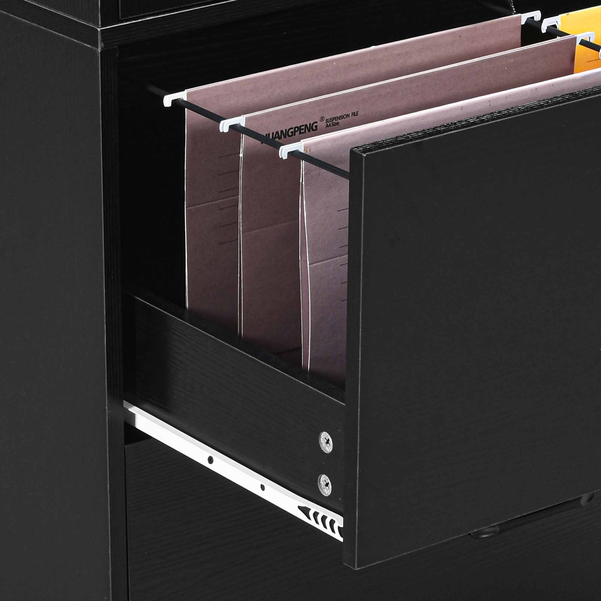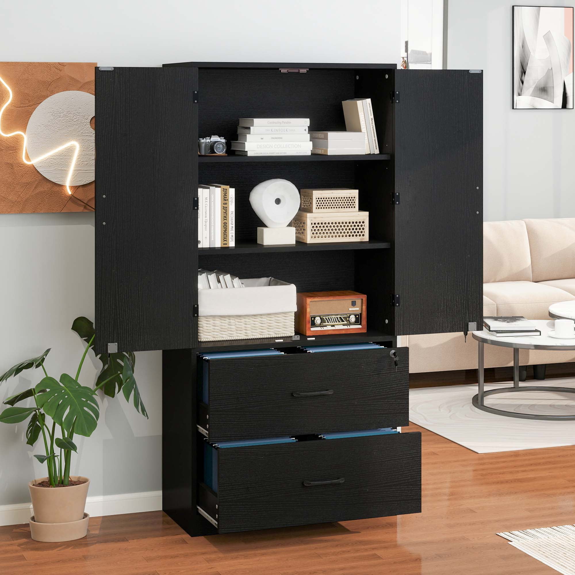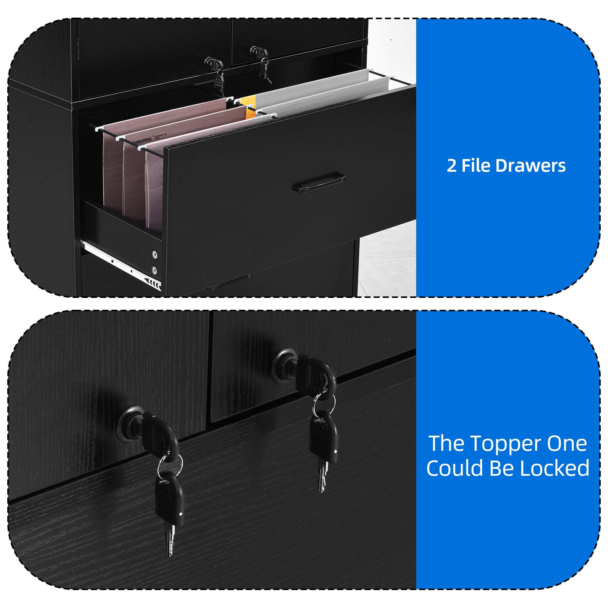 Dextrus Wood File Cabinet with Lock & 2 Drawers, Lateral Filing Cabinets with Doors, Black