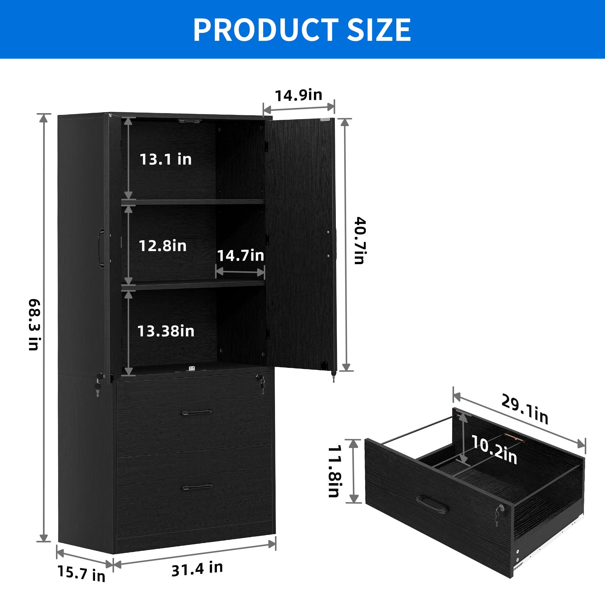 Stable and Safe: Constructed with thick MDF wooden board, this office storage cabinet provides a solid and stable structure. The included anti-tip metal buckle allows you to secure it to the wall, enhancing stability and safety. Spacious Storage Capacity: With dimensions of 15.74″”D x 31.49″”W x 68.11″”H, this cabinet offers ample storage space for toolboxes, storage boxes, documents, and other items. The adjustable shelves inside provide flexibility for organizing your belongings. Secure File Organization: The bottom drawer of this mobile storage cabinet is equipped with lockable features and removable hanging bars, allowing you to securely store A4, Letter, and Legal-sized documents while maintaining easy access. Smooth and Convenient Access: Each drawer is designed with two sturdy ball-bearing slides, ensuring smooth opening and closing for easy file retrieval. The sleek metallic pull handles add a modern touch to the overall design. Strong and Reliable: Crafted from solid wood, this cabinet offers durability and strength. The upper shelves can support up to 180 pounds, while the lower drawers can accommodate approximately 110 pounds, ensuring it can handle your storage needs with ease.