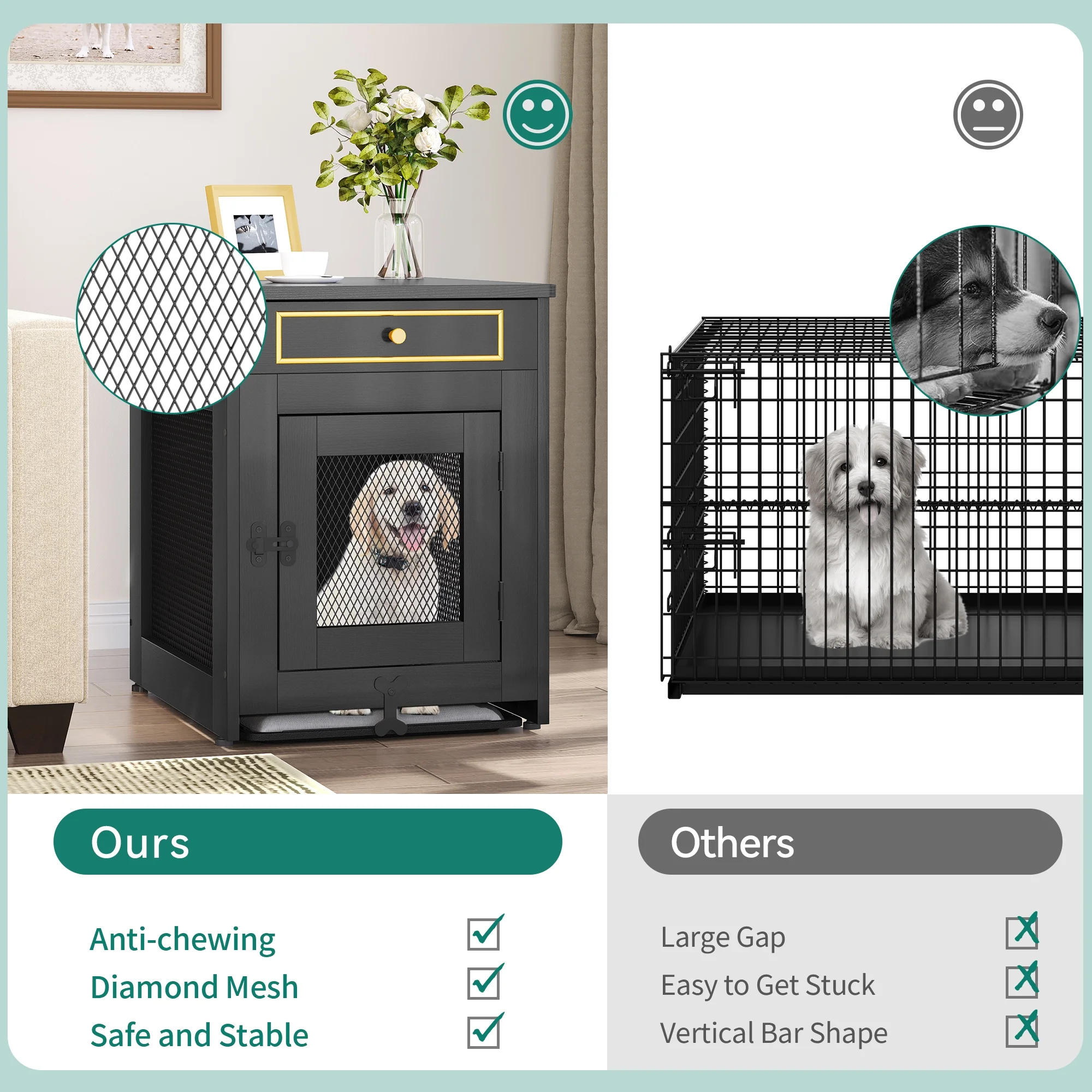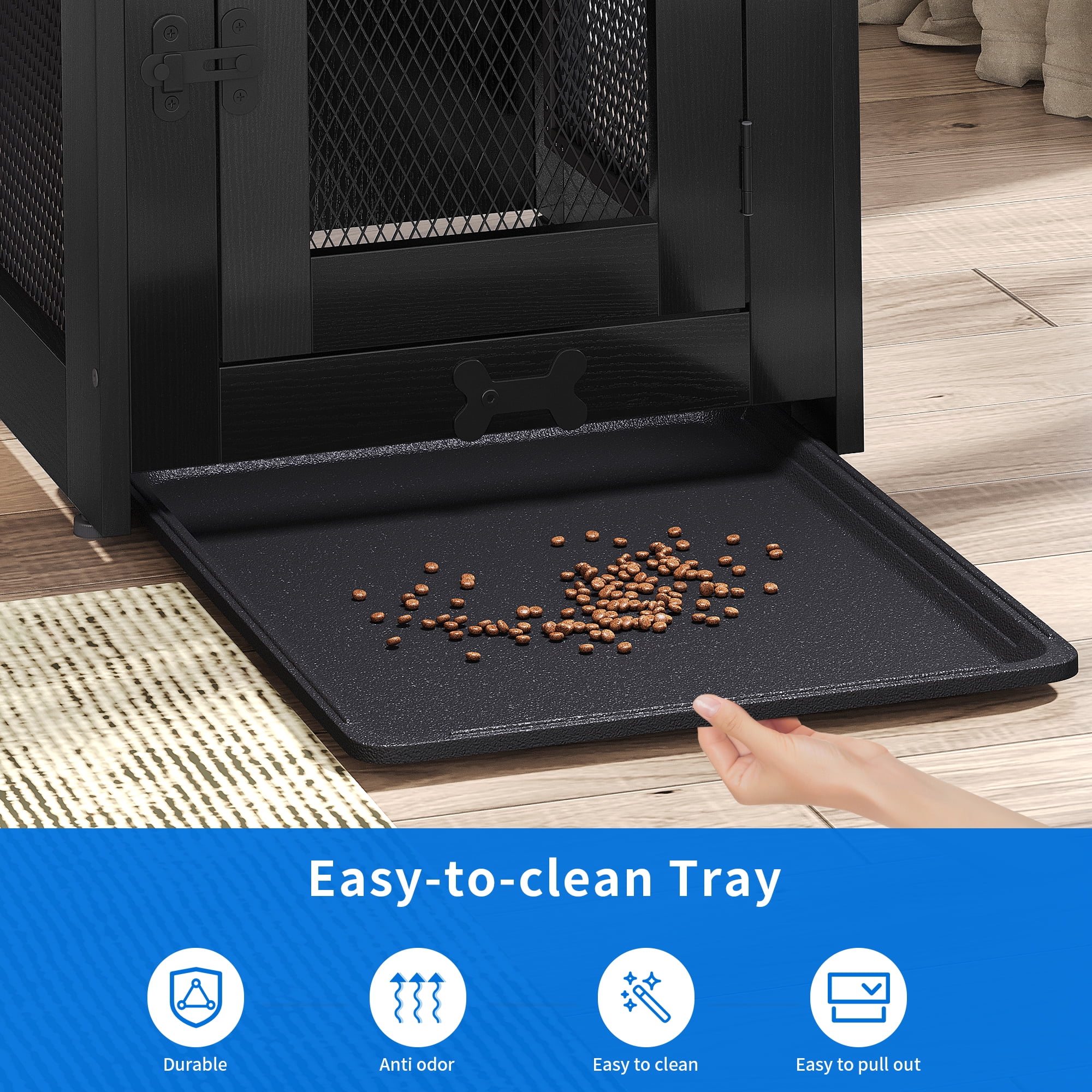 Stylish and Versatile: This dog crate furniture boasts a simple design and retro colors that effortlessly blend with various interior styles. Elevate your indoor decor while expressing your personal style with this sleek and fashionable piece. 3-in-1 Functionality: Not just a dog cage, this versatile furniture serves multiple purposes. Use it as a stylish side table, bedside table, or coffee table. The spacious top panel offers ample room to display family photo frames, plants, or night lights, adding a touch of charm to your space. Safety and Stability: Rest assured knowing that the slat box design features an anti-slip mat, providing enhanced stability and floor protection. Inside the dog crate, premium diamond-shaped iron wire mesh ensures the safety of your furry friend by preventing chewing or escape attempts. Easy-to-Clean Tray: Keeping your dog’s living environment clean is effortless. The removable tray at the bottom allows for easy cleaning and management. Simply pull it out and clean away any dog hair, dirt, or food residue, ensuring a hygienic space for your pet. Size Reminder: The internal dimensions of the slat box measure 18″ x 24″ x 16.5″, making it suitable for small dogs weighing 11-25 pounds, such as Schnauzers, Maltese, Yorkshire Terriers, and Corgis. Provide your beloved companion with a cozy and secure retreat.
