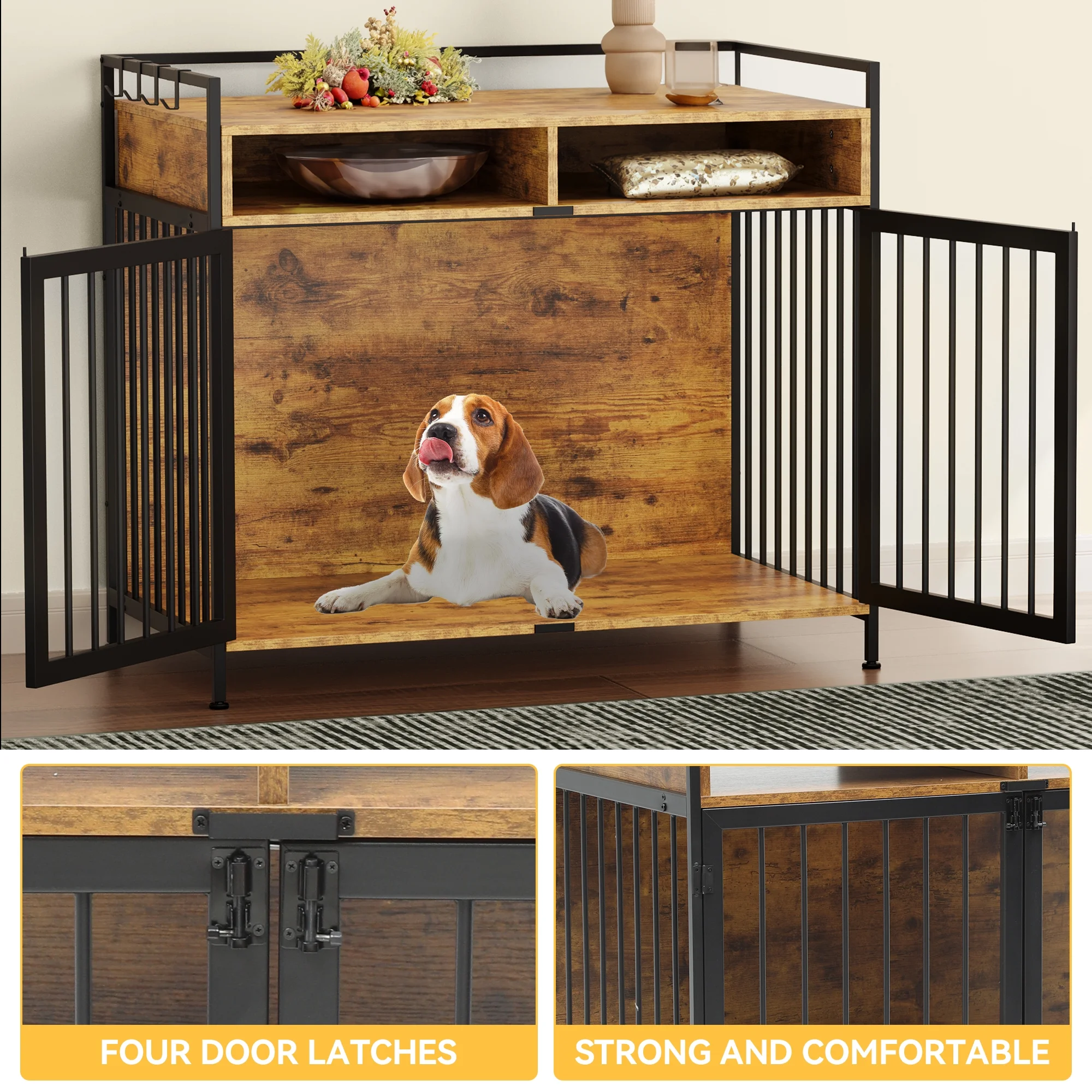 Multi-functional Dog Cage: The heavy duty dog crate comes with 2 large drawers that can conveniently store dog food; Can be used as a side table or coffee table, with a wide top to place decorations or small and medium-sized plants. Also features metal guardrails to prevent items from falling; Comes with four hooks to hang lightweight items. Double Door Design: Our 2-in-1 dog cage coffee table has 2 openings to facilitate your pet’s easy entry and exit; Both doors are equipped with metal latches to securely lock your dog in the cage and prevent them from running around. Strong and Durable: The coffee table dog cage is designed with wire mesh and durable, pressed wood; Features sufficient ventilation space to provide a longer service life; Compared to traditional dog cages, this is safer, more stable, comfortable, and aesthetically pleasing; Can bear a maximum weight of 110lb. Dimensions and Style: The overall size of the kennel furniture is 40.9″ L x 25.1″ W x 31.8″ H, it’s suitable for providing small and medium dogs with spacious living space; Fashionable appearance and retro style will perfectly harmonize with your room. Easy to Install: Our double door dog house is equipped with all hardware and necessary tools; Can be easily and quickly assembled in just 30 minutes according to the instructions in the packaging; If you have any questions, please contact us directly to provide you with a satisfactory solution.