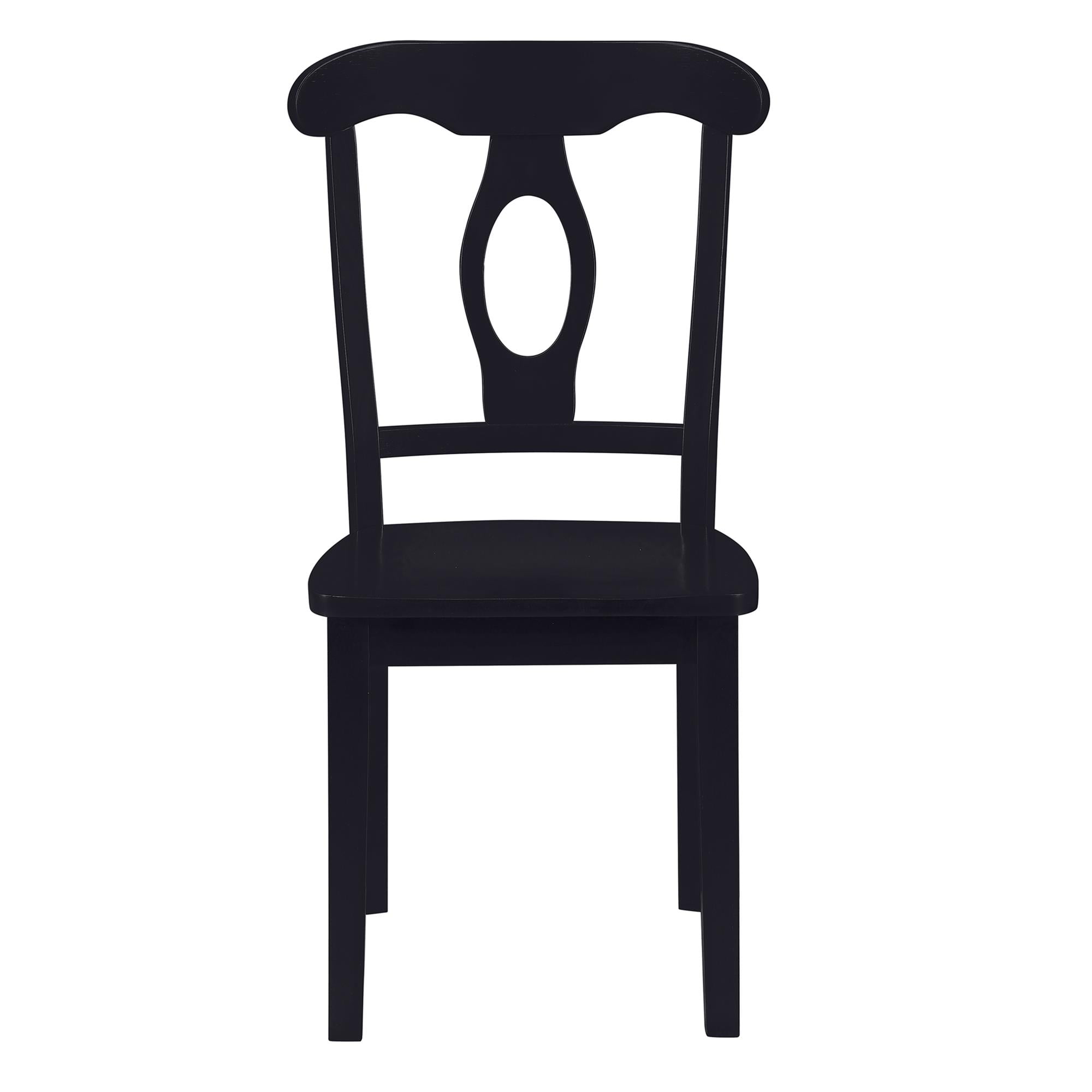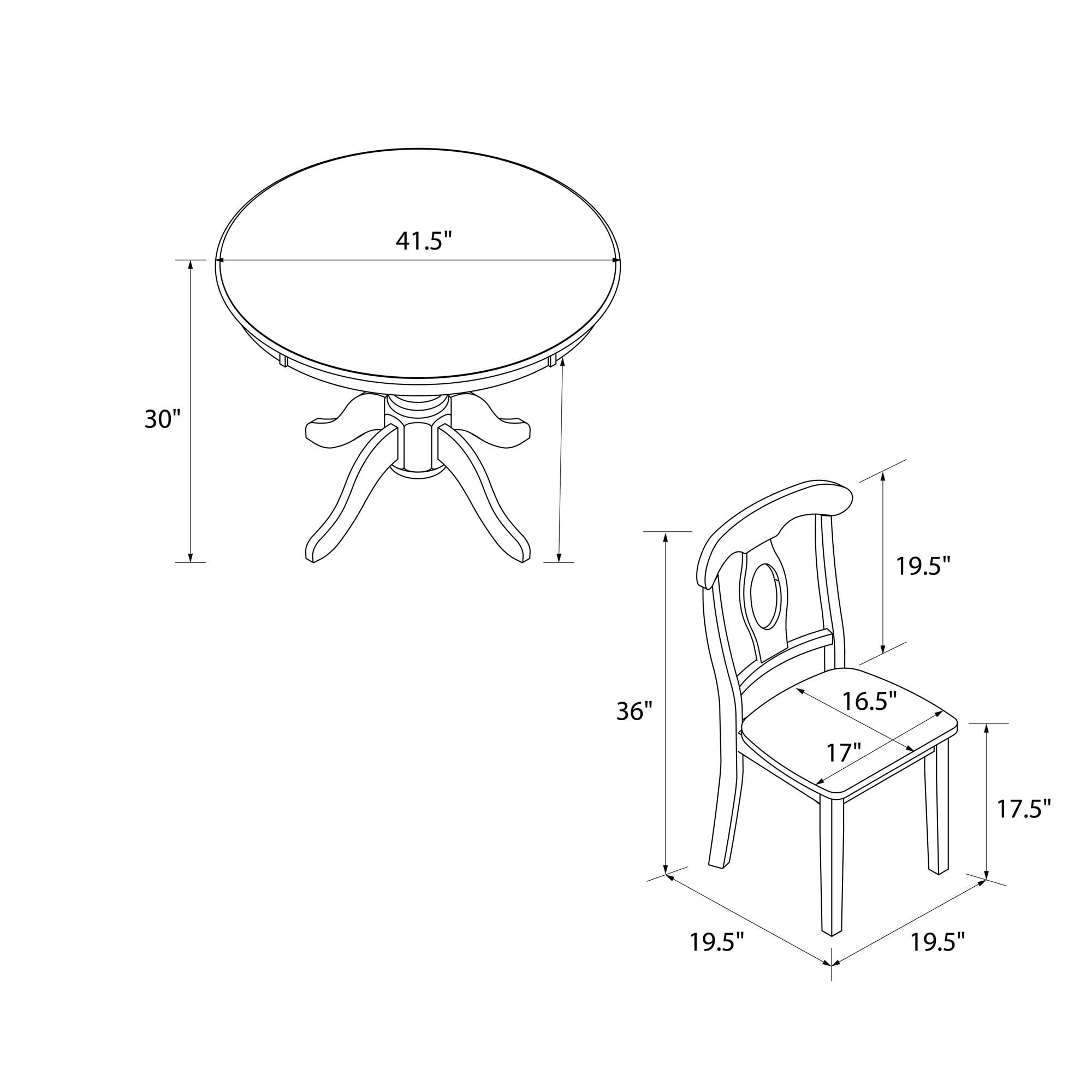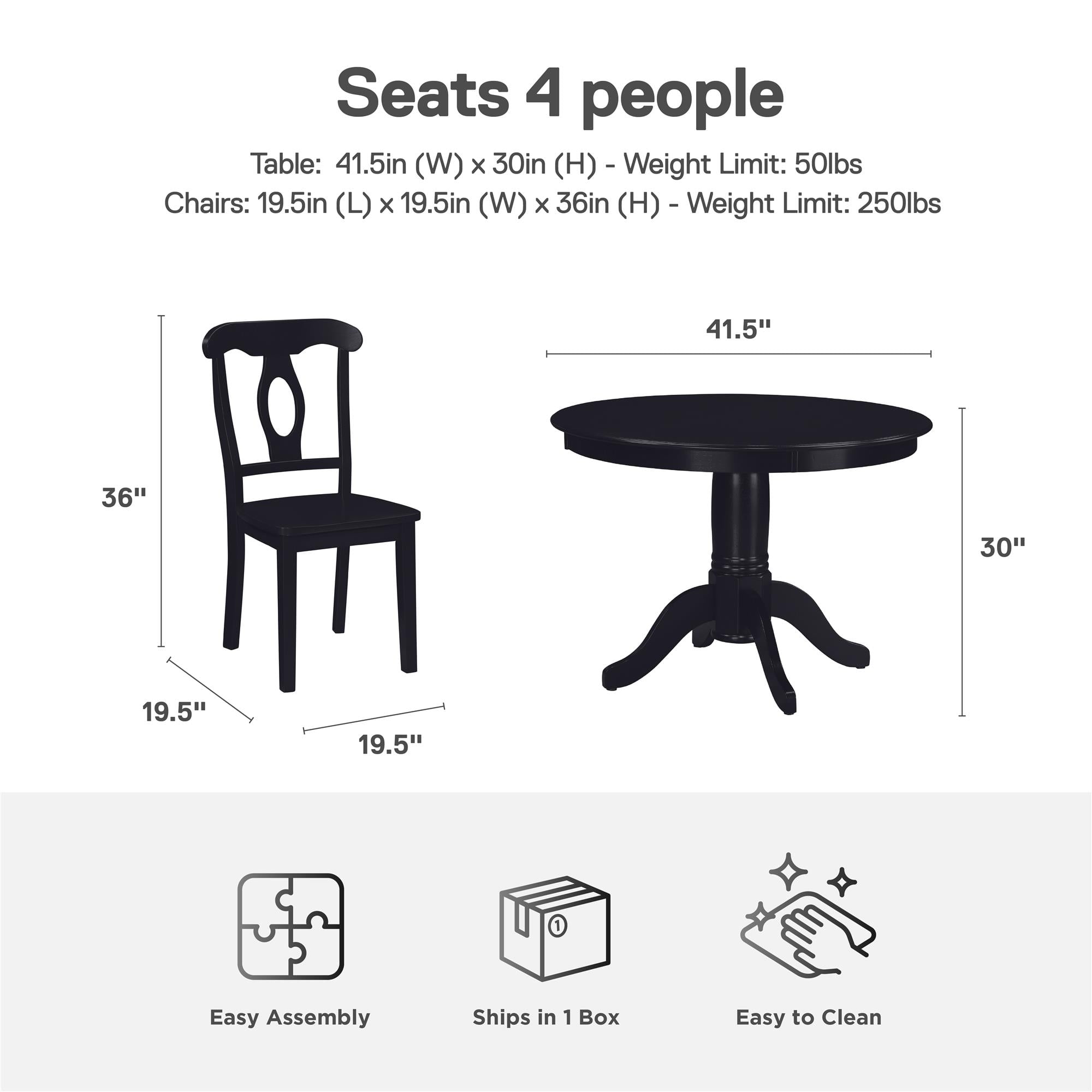 Unleash the beauty of heritage with our wood crafted 5-Piece Traditional Dining Set that includes 4 Napoleon style dining chairs and 1 round pedestal table all finished in classic black and designed to fit small space dining room and kitchen areas Great as a dinette set for apartment or condo living, our dining furniture bundle easily seats 4 people at the dining table for breakfast, lunch, or dinner and makes hosting guests for game nights simple with comfortable and classic seating Sturdy and durable with combined solid wood and MDF construction, the smooth beveled edge tabletop is 18mm thick, the pedestal base has decorative fluted accents, and floor glider caps fitted under the dining chair legs prevent hardwood scratches Ships in one easy to handle box with all parts, tools, and instructions included for hassle-free assembly. Easy to clean exterior – simply wipe away dust, debris, or spills with a dry cloth Dining set dimensions: (Table): 41.5″ Día x 30″ H. (Chair): 19.5″ W x 19.5″ D x 36″ H. Weight limit (Table): 50 lbs. Weight limit (Chair): 250 lbs. Net weight: 111 lbs. 1-year limited warranty