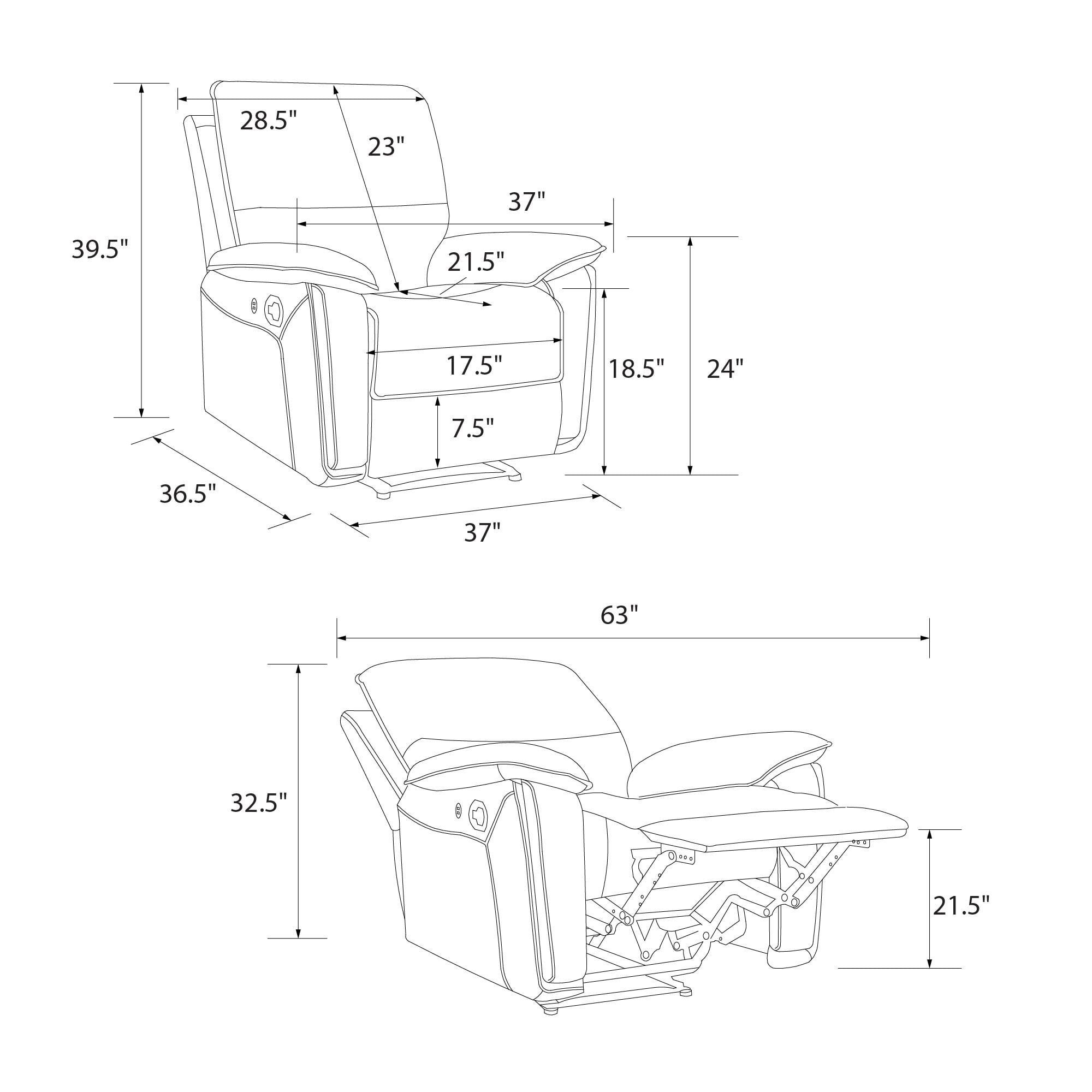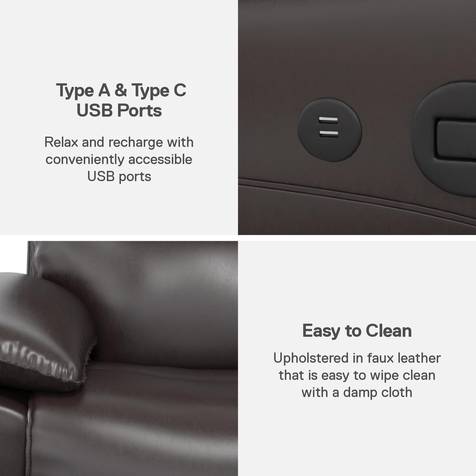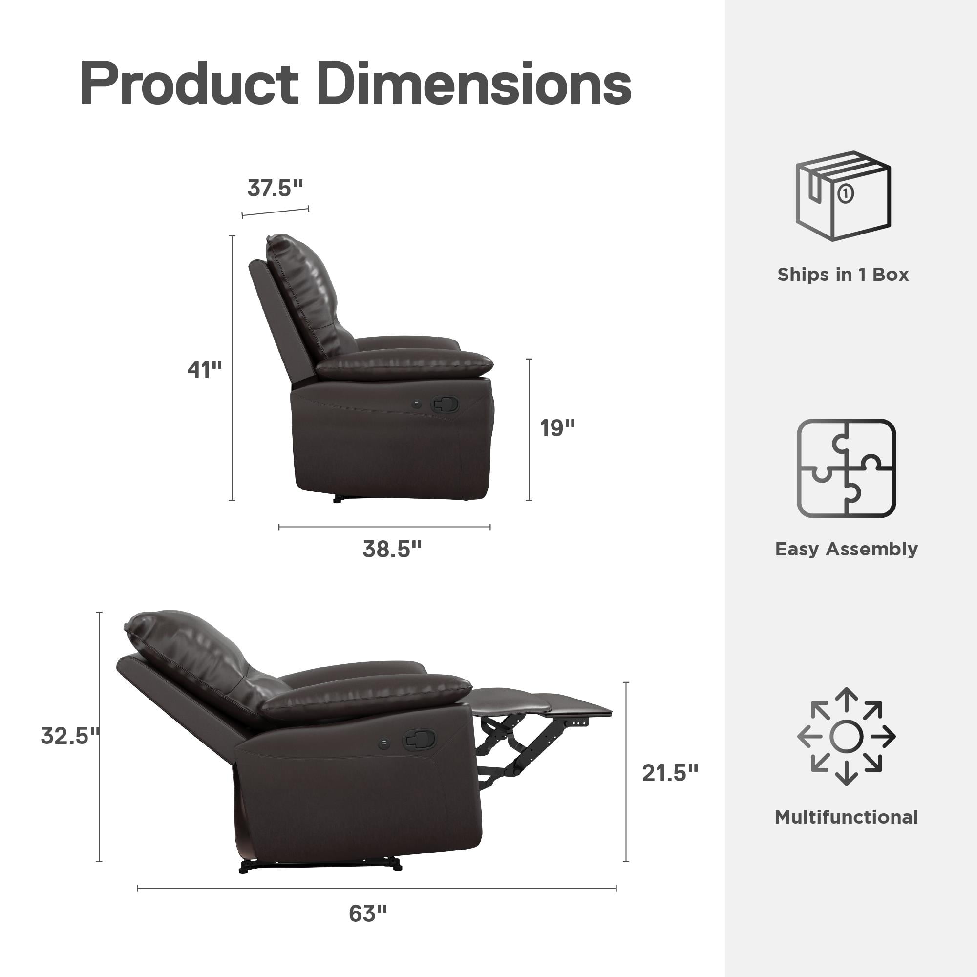 DHP Beau Recliner with Dual USB Port, Faux Leather, Dark Brown Convert your den into a soothing home theater paradise with this extravagant recliner chair with plush armrests that includes a dual port USB charging station for powering up your smart phone, tablet, or laptop in maximum comfort Upholstered in buttery faux leather with a cushy high backrest, the manual reclining function operates easily with the pull of a lever discreetly located on the exterior arm to allow laid back positioning and leg relaxing footrest capability Its strong metal base and wood frame construction is long lasting, and its pocketed coil foam padded seat cushion with sinuous spring foundation allows extended moments of down time without the fear of sagging Arrives in one easy to handle box with all parts, tools, and instructions included for quick straightforward assembly within 15 minutes. Fabric resists stains and easily wipes clean with a damp cloth Recliner dimensions: (Sitting) 37″L x 36.5″W x 39.5″H. (Reclining) 37″L x 63″W x 32.5″H. Net weight: 69.5 lbs. Weight limit: 300 lbs. Shipping dimensions: 35.5″L x 30″W x 25.5″H. Gross weight: 84 lbs. 1-year limited warranty