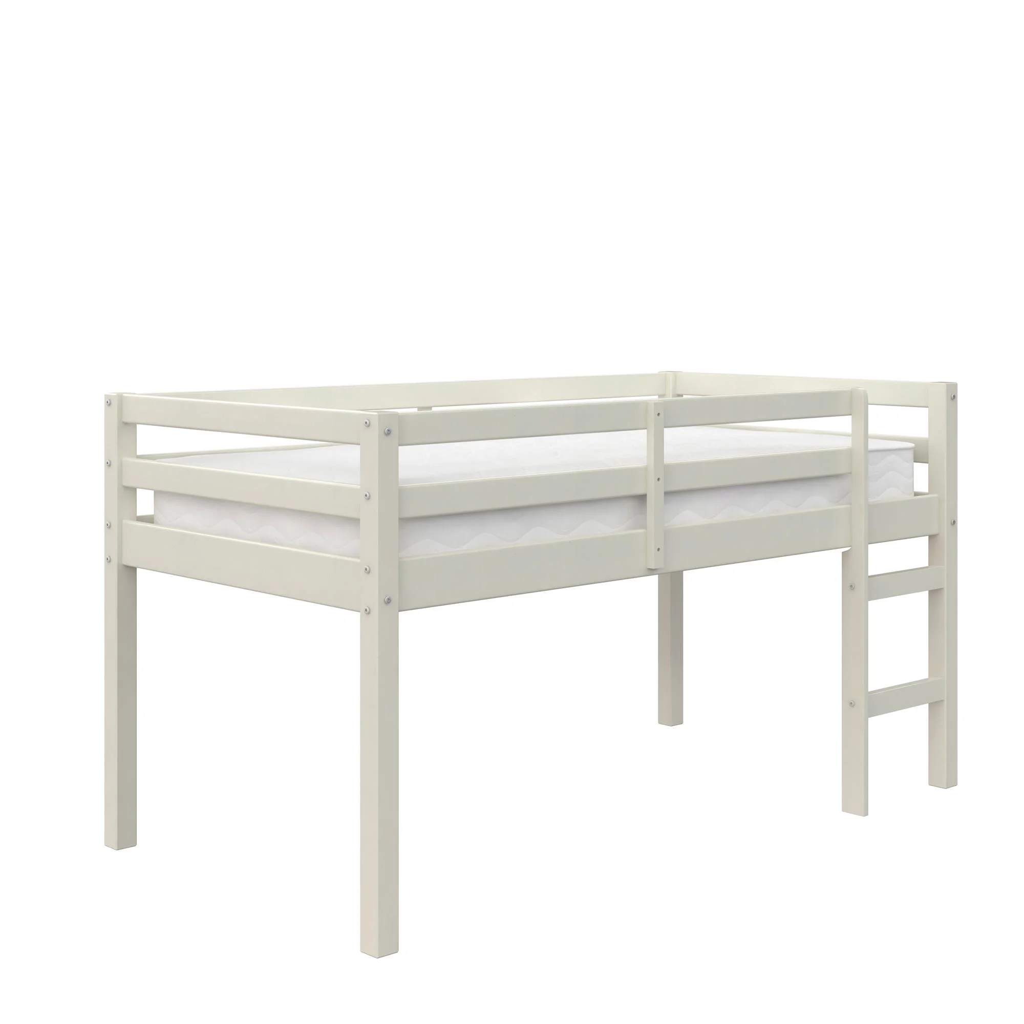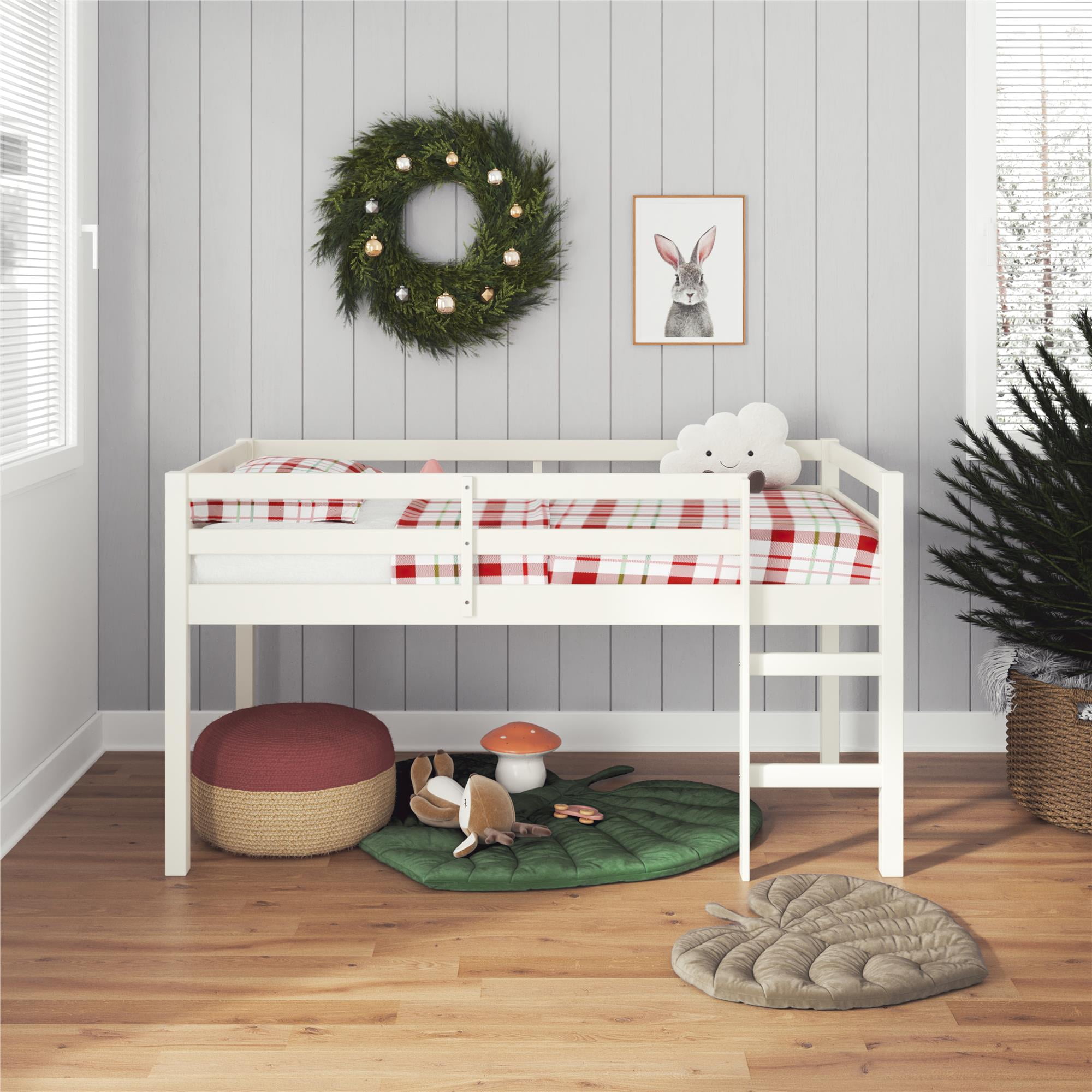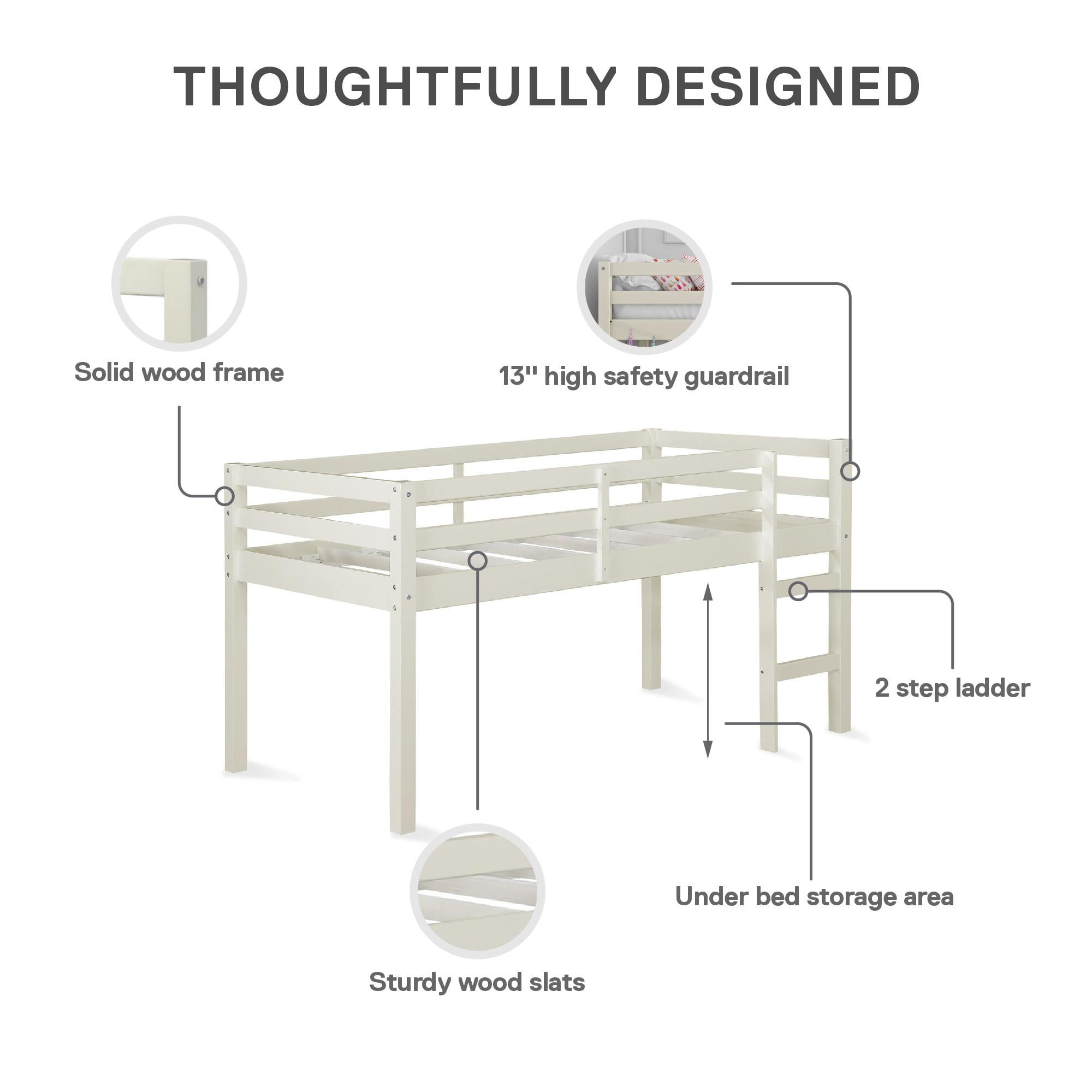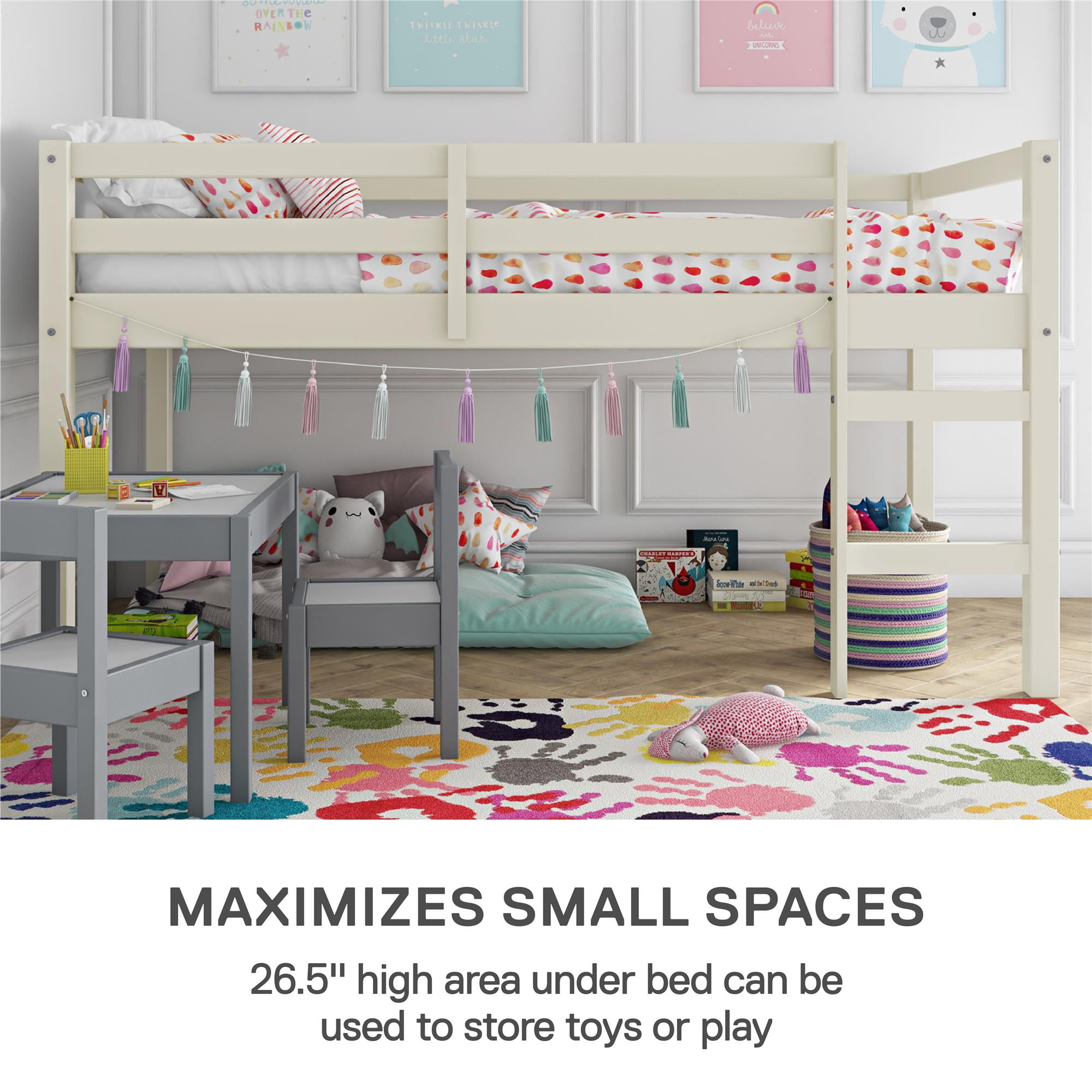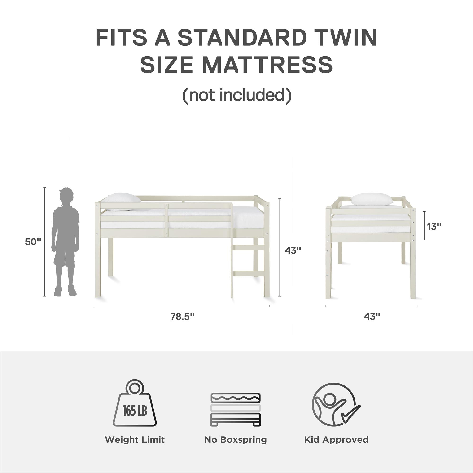 Space Saving Junior Twin Loft Bed: Designed to maximize bedroom space for kids, this low profile modern loft bed is the perfect size for children with an easy to reach top bunk and a 26.5″ high area under the bed for storage, play, or a reading nook Built for Safety: The solid pine wood bed frame incudes an integrated 2-step ladder and 13″ guard rails for upper bunk safety. Assembled dimensions: 78.5″L x 43″W x 43″H. Max bed weight limit is 165 lbs. Intended for kids no less than 4 years of age Inclusive Design: This low height twin loft bed accommodates short ceilings and is minimalist yet contemporary to blend with all styles of decor for boys and girls alike, making it a great addition to kids’ bedrooms or small space guest rooms No Box Spring Needed: Wood slats support your mattress without the need for a box spring. The secured slats and raised sides keep your mattress in place and prevent it from sliding. Fits 1 standard twin size 6″ innerspring mattress (sold separately) Stress-free Assembly: Tools and easy-to-follow instructions are included in box. Contact customer support by email or live chat to easily order any replacement parts if required. Enjoy a 1 year limited warranty. Must be aged 4 and above for top bunk use