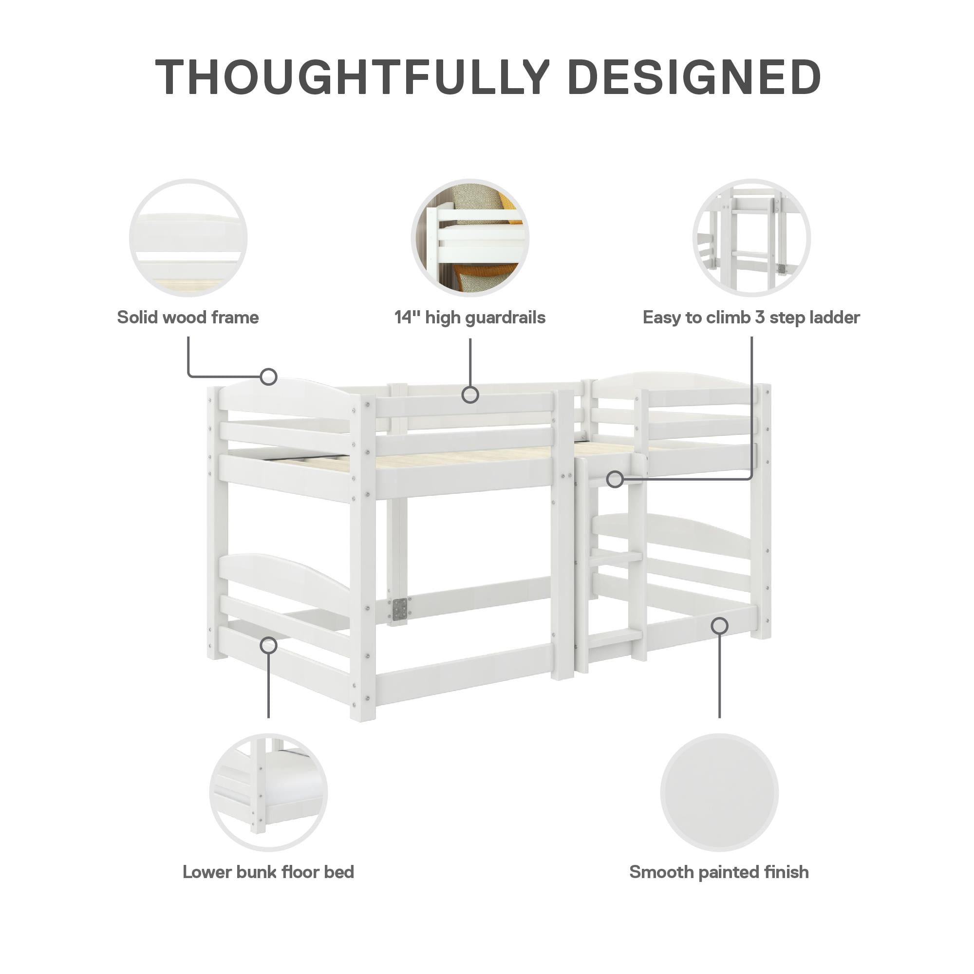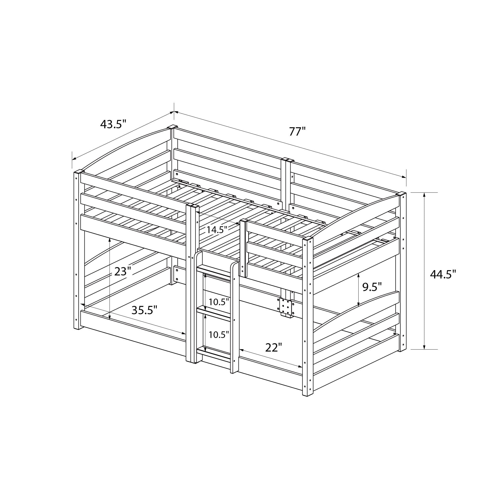 Perfect for Little Adventurers: Our split design twin over twin bunk bed is ideal for boys and girls, bringing fun and functionality to any kids’ bedroom! The low bunk bed enables easy access, letting kids and teens quickly climb into bed for rested sleep Optimal Safety: Extra-tall 14″ guardrails on the top bunk boost protection and allow for the use of a suggested 6″ depth spring twin-size mattress (sold separately). The low-to-ground layout and easy access 3-step ladder makes our twin bunk bed a safe bet Complete Comfort: The bottom bunk area serves as a cozy floor bed and fits any twin-size mattress (sold separately), making it ideal as a junior bunk bed for growing kids. Siblings, sleepovers, and small spaces – our kids’ bunk bed handles every situation Strong Spruce Style: The solid wood bunk bed frame has a sturdy build and a classic paint finish worthy of any contemporary decor. Plus, the 13 robust wooden slats support up to 200 lbs. on the upper bunk without the need of a bulky box spring foundation Uncomplicated Setup: Take advantage of a 1-year limited warranty. Everything needed is included in box for hassle-free assembly. Platform bed frame: 77″L x 43.5″W x 45″H. Net weight: 95 lbs. Kids must be aged 6+ for top bunk use and 3+ for bottom bunk use