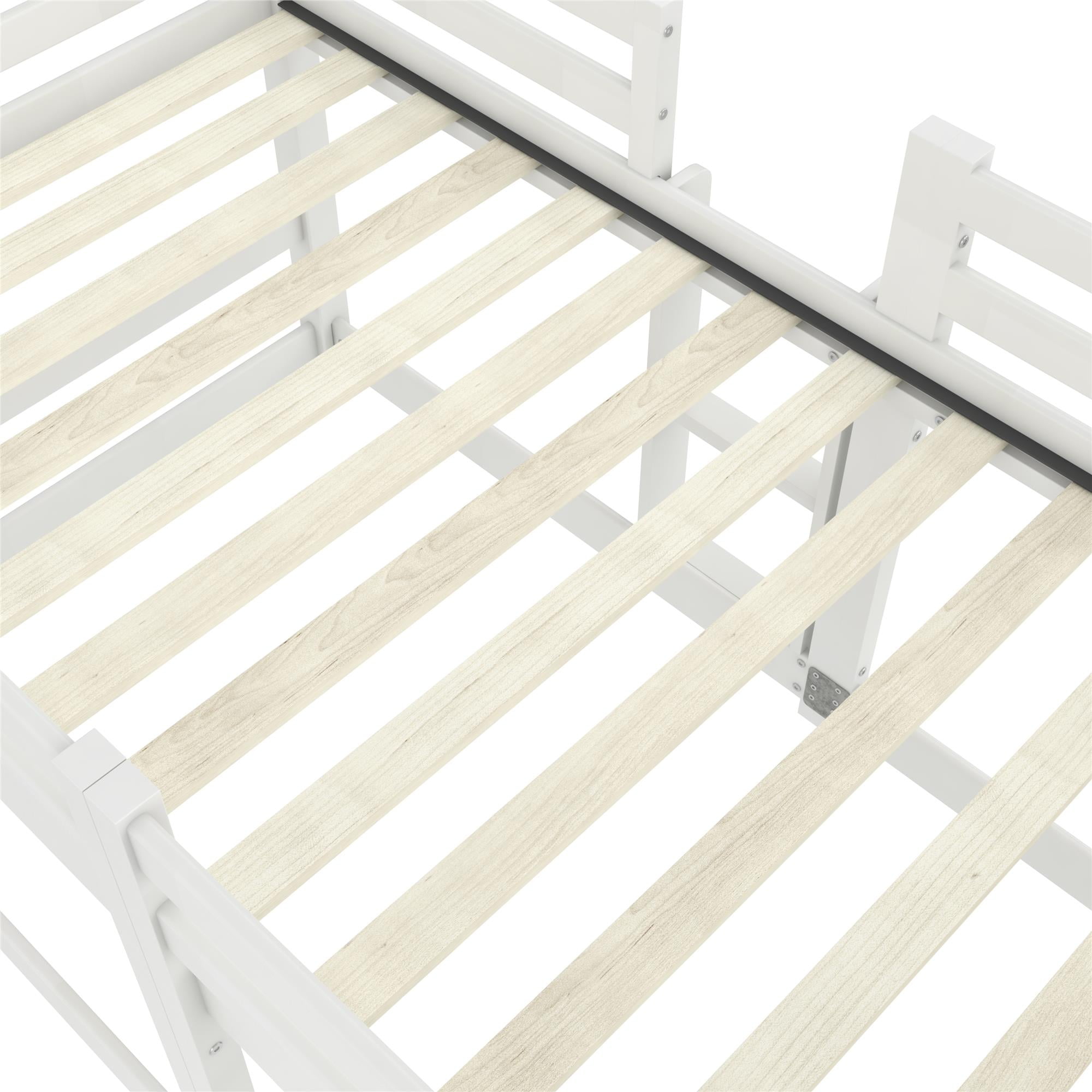 Give your little adventurers the gift of great sleep with the DHP Birley Twin over Twin Bunk Bed. Its low-to-the-ground design ensures easy twin bunk bed access, making bedtime a breeze for your young kids and teens. Our stylishly painted solid wood bunk bed features 14-inch guardrails on the top bunk, providing enhanced safety, and includes a sturdy three-step ladder for secure access. Versatility is key with this junior bunk bed, optimizing your kid’s bedroom with a bottom bunk that doubles as a cozy floor bed–ideal for siblings, sleepovers, or growing children. Our kids’ bunk bed has a low bunk bed design, perfect for small spaces and rooms with low ceilings. The strong spruce wood platform bed frame fits two twin-size mattresses (not included), with the upper bunk being able to accommodate a 6″ spring mattress thanks to 13 sturdy wooden slats that support up to 200 lbs. without a box spring foundation. Children must be at least 6 years old to use the top bunk and 3 years old to use the bottom bunk.