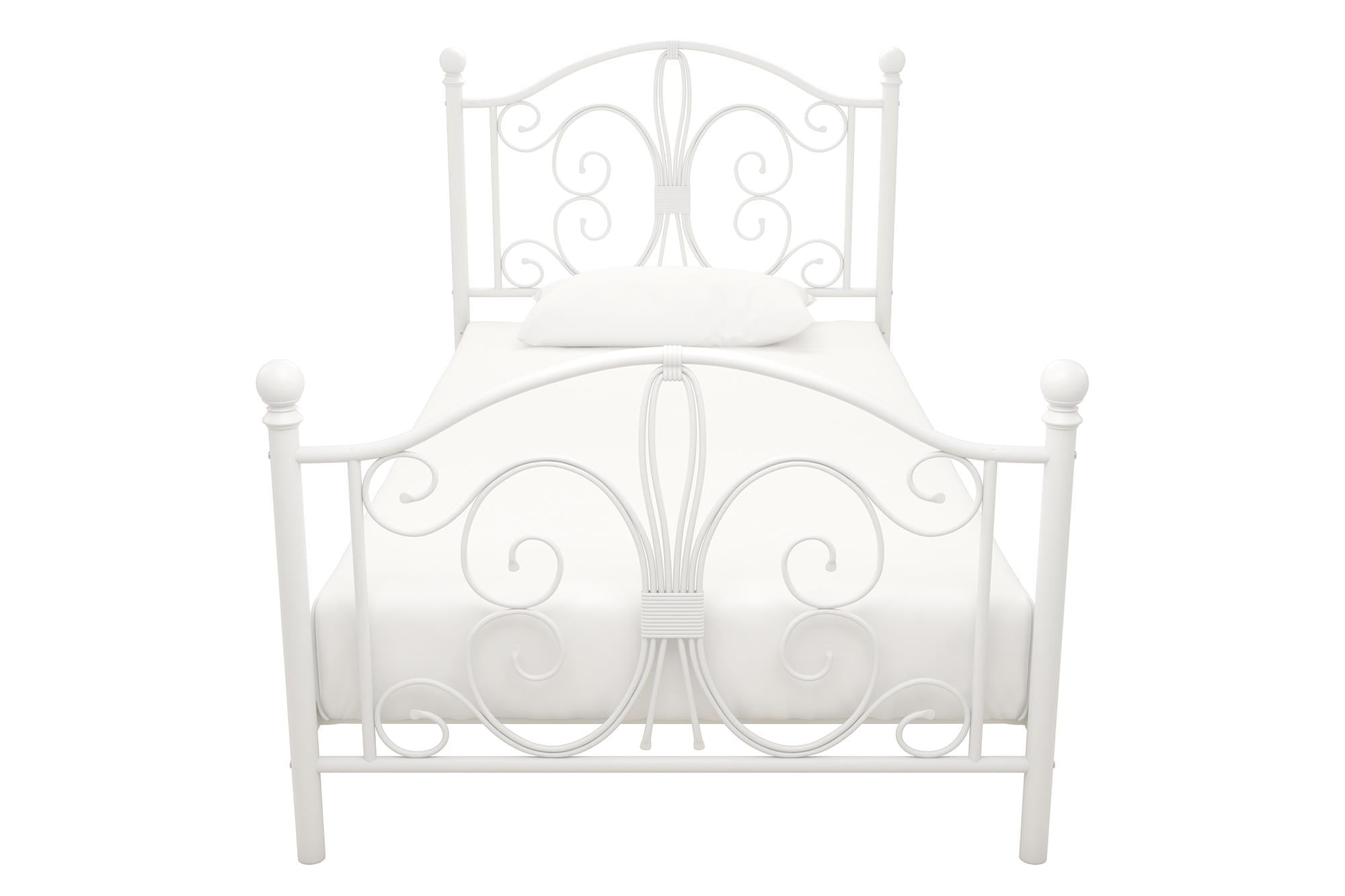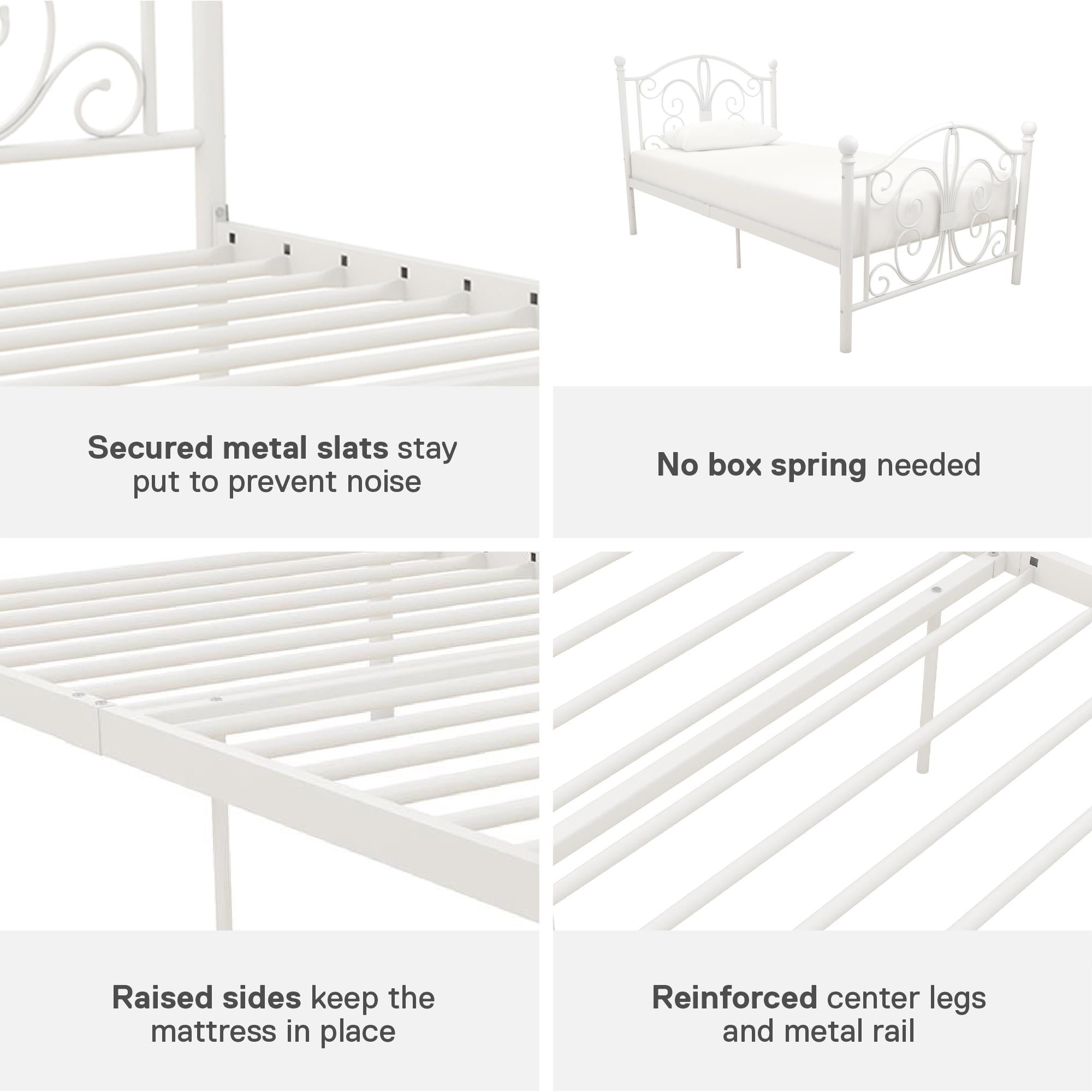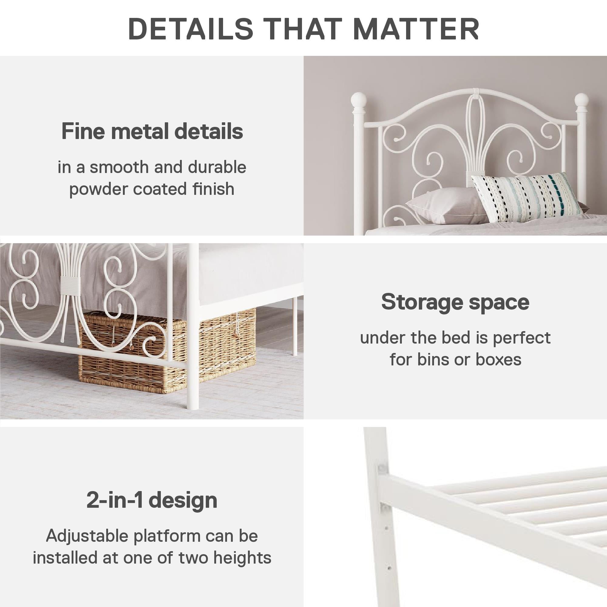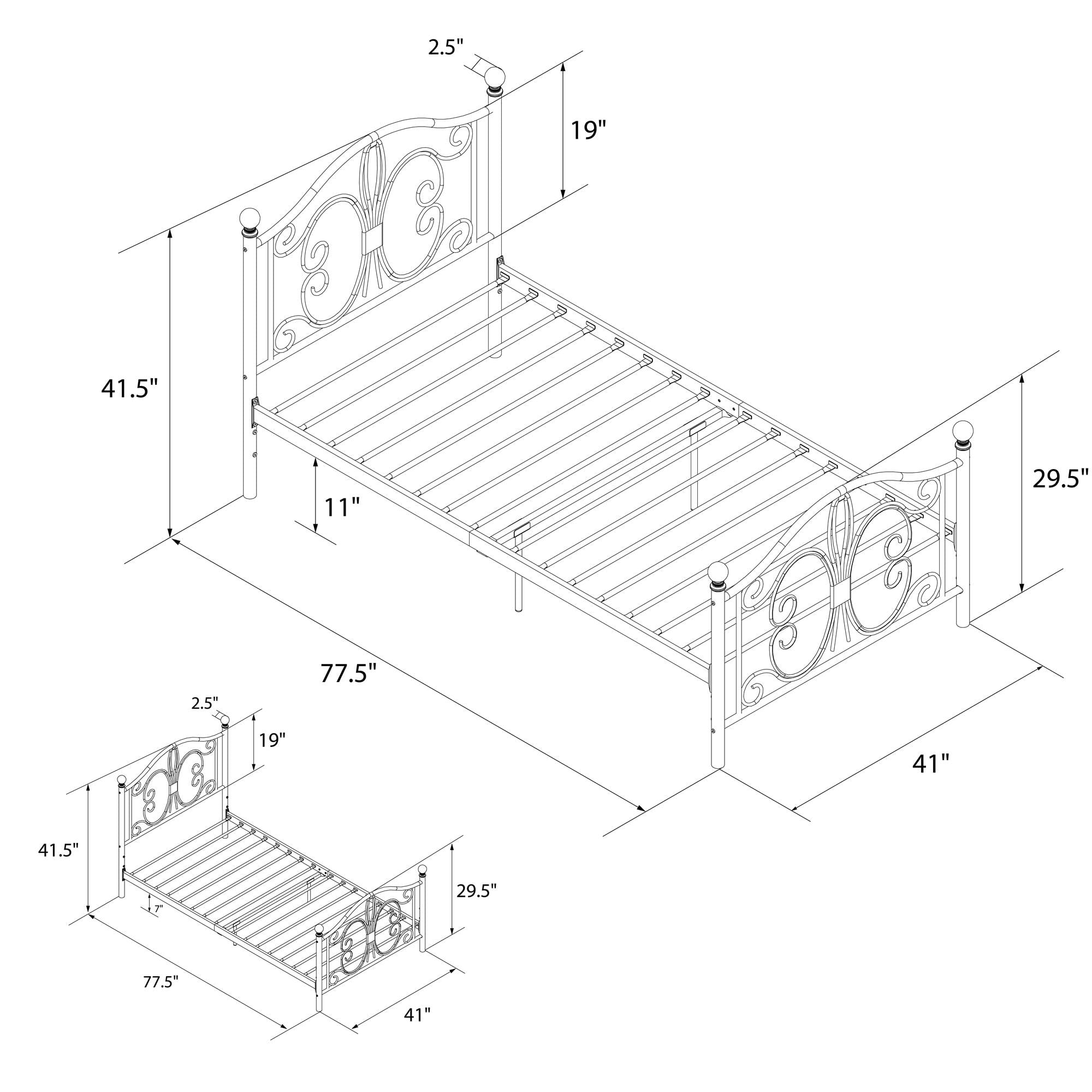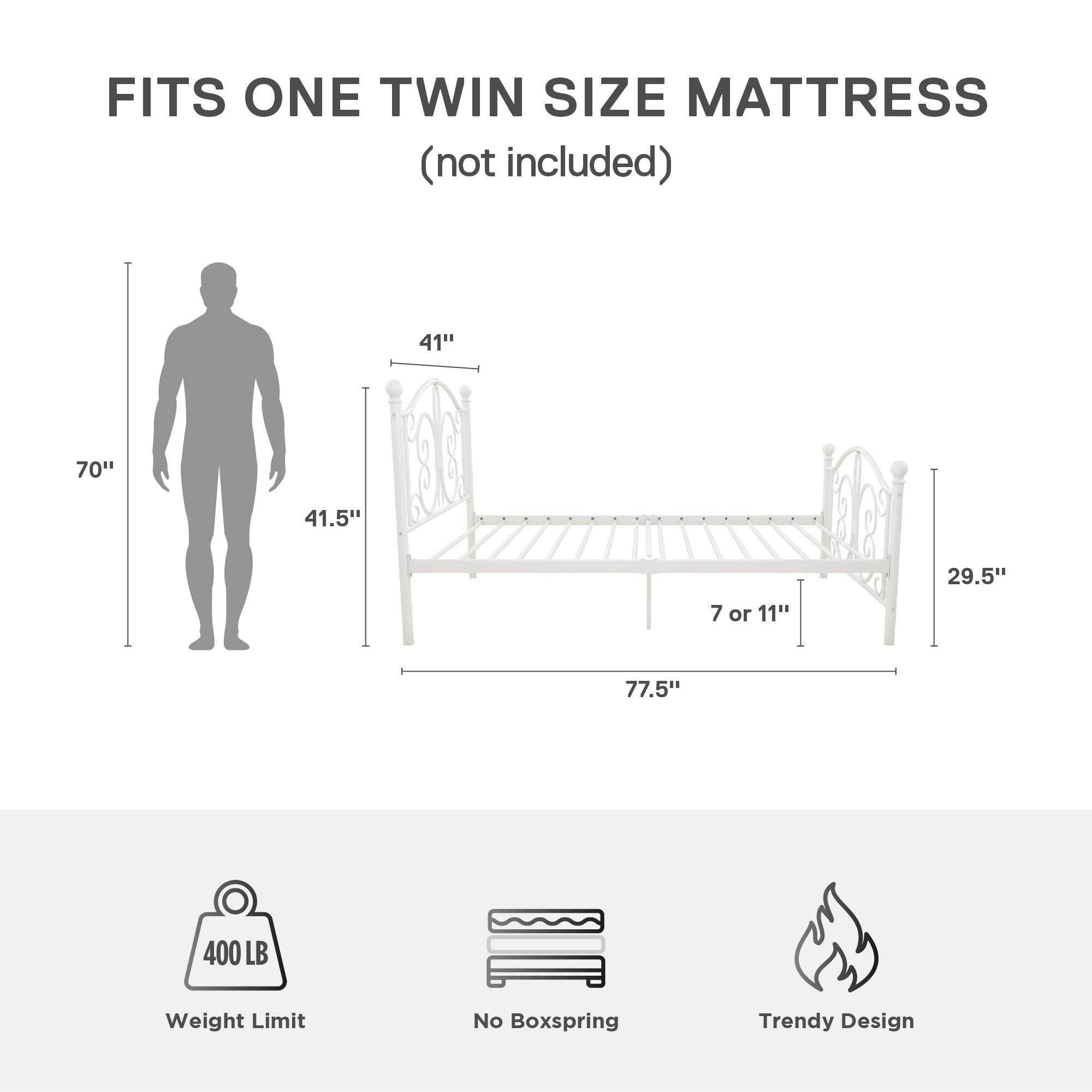 Modern & Elegant Design: Parisian inspired bed with intricate scrollwork and finial bed posts detailing on the headboard and footboard for traditional styling. Available in multiples sizes and colors and ships in 1 easy to handle box Adjustable Height: Designed to maximize space, the adjustable bed frame’s height can be installed at 7″ from the floor for a lower profile or 11″ for more under bed clearance and storage space. Dimensions: 77.5″L x 41″W x 41.5″H. Weight limit: 250 lbs. Sturdy construction: Strong metal structure creates a stable frame supported by center legs and a metal bar for superior stability. Premium powder coated metal finish provides a smooth and longer lasting finish that protects against corrosion, rust No Box Spring Needed: Heavy duty metal slats ensure excellent air flow and support your mattress without the need for a box spring. The secured slats and raised sides keep your mattress in place to prevent it from sliding