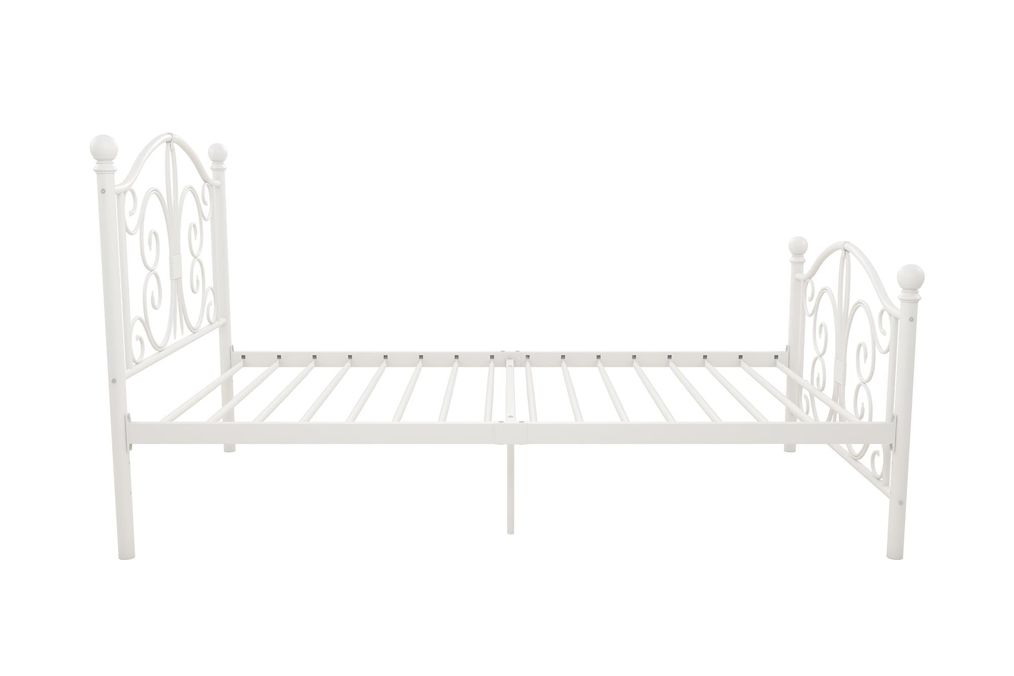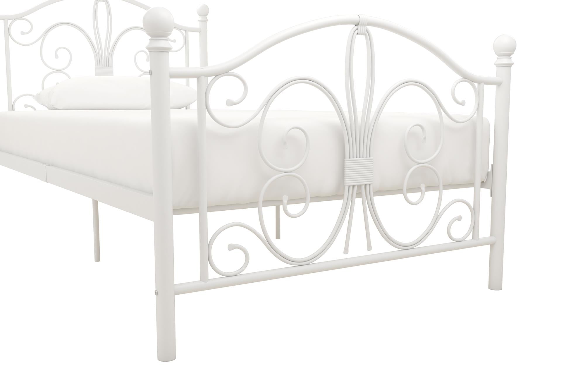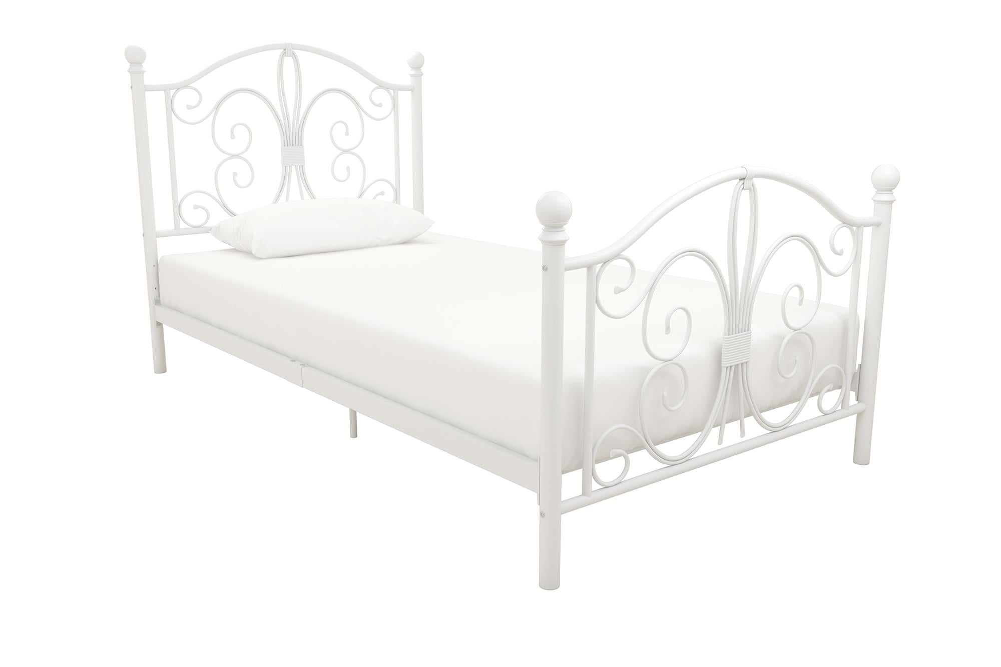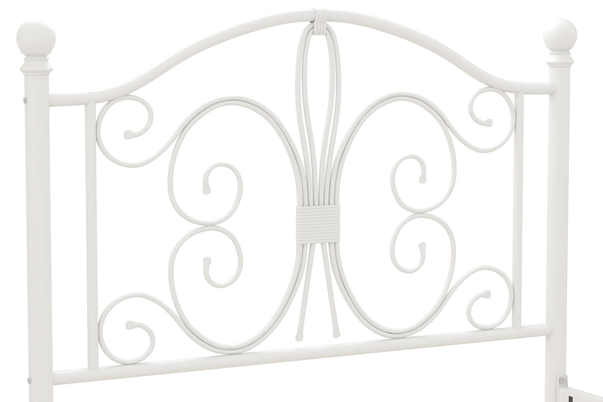 Modern & Elegant Design: Parisian inspired bed with intricate scrollwork and finial bed posts detailing on the headboard and footboard for traditional styling. Available in multiples sizes and colors and ships in 1 easy to handle box Adjustable Height: Designed to maximize space, the adjustable bed frame’s height can be installed at 7″ from the floor for a lower profile or 11″ for more under bed clearance and storage space. Dimensions: 77.5″L x 41″W x 41.5″H. Weight limit: 250 lbs. Sturdy construction: Strong metal structure creates a stable frame supported by center legs and a metal bar for superior stability. Premium powder coated metal finish provides a smooth and longer lasting finish that protects against corrosion, rust No Box Spring Needed: Heavy duty metal slats ensure excellent air flow and support your mattress without the need for a box spring. The secured slats and raised sides keep your mattress in place to prevent it from sliding