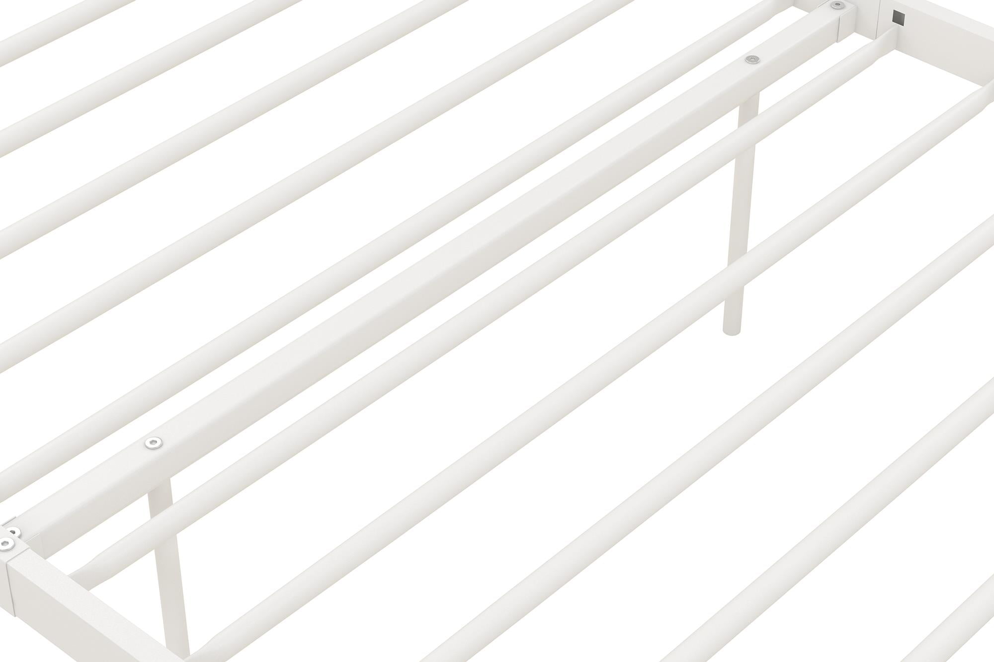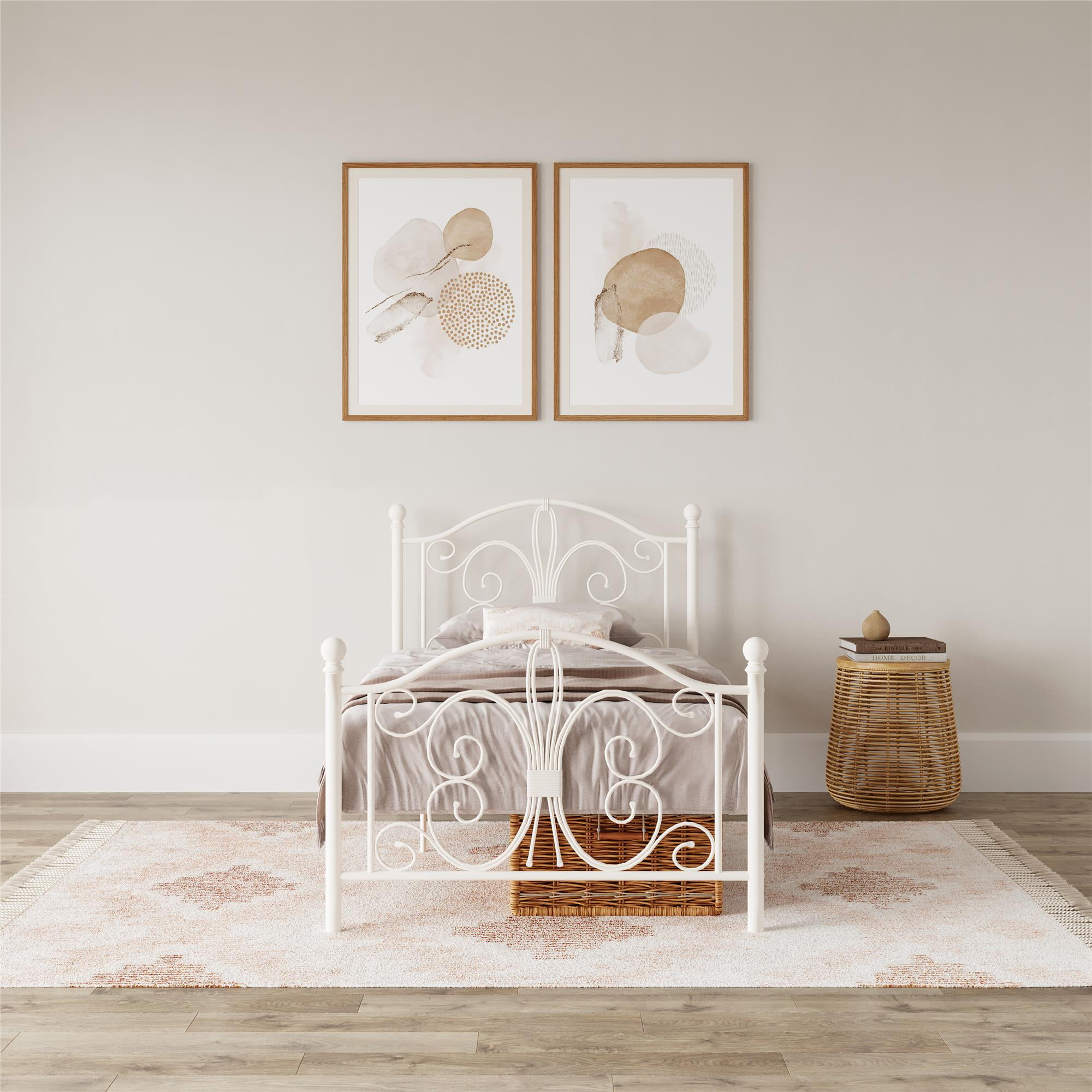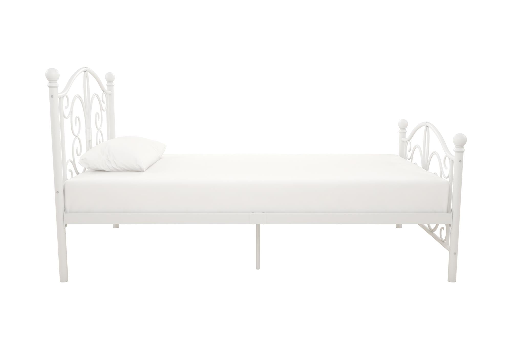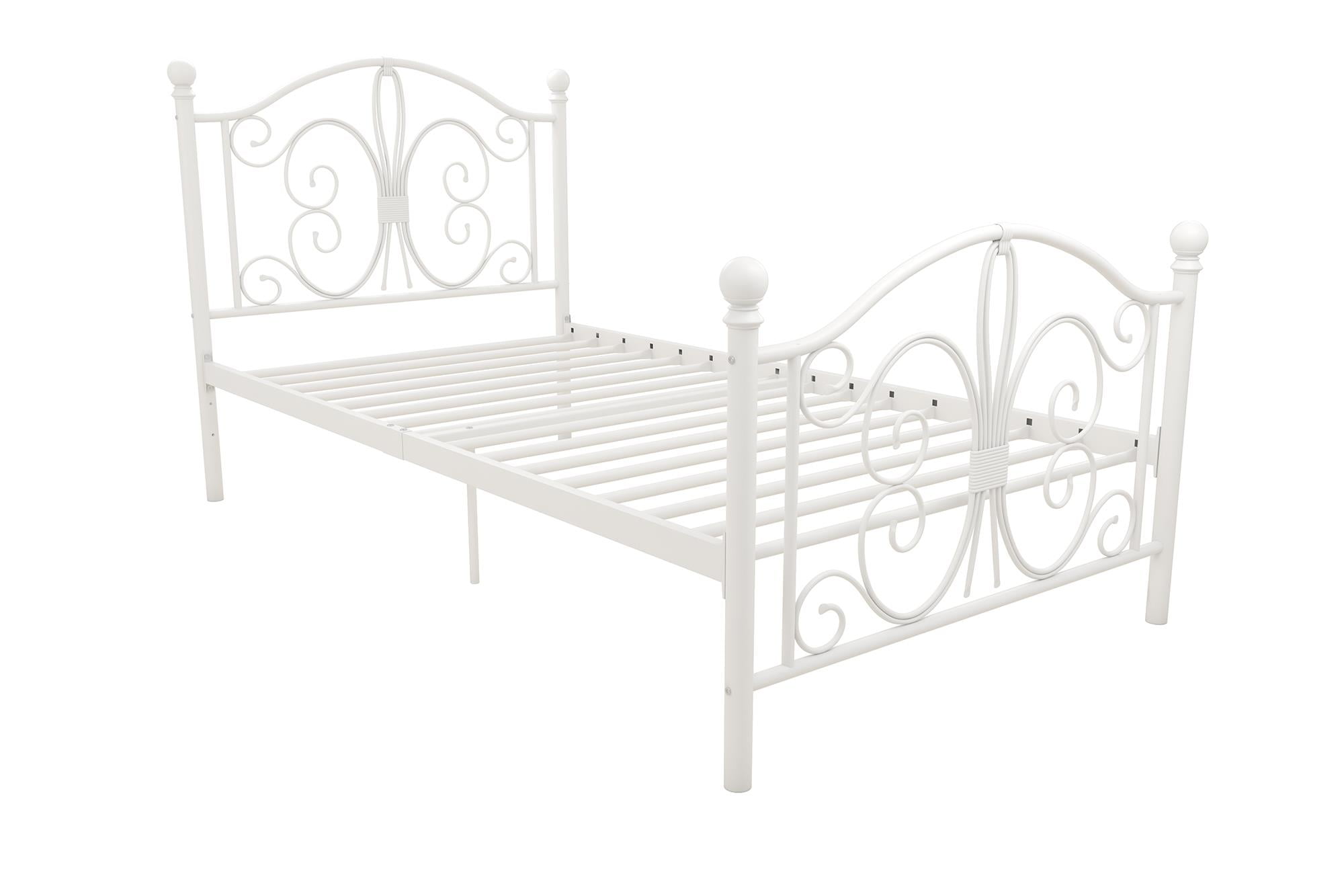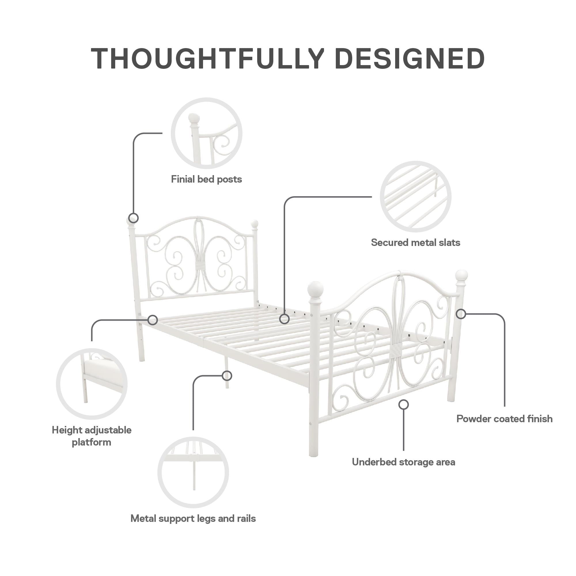 Modern & Elegant Design: Parisian inspired bed with intricate scrollwork and finial bed posts detailing on the headboard and footboard for traditional styling. Available in multiples sizes and colors and ships in 1 easy to handle box Adjustable Height: Designed to maximize space, the adjustable bed frame’s height can be installed at 7″ from the floor for a lower profile or 11″ for more under bed clearance and storage space. Dimensions: 77.5″L x 41″W x 41.5″H. Weight limit: 250 lbs. Sturdy construction: Strong metal structure creates a stable frame supported by center legs and a metal bar for superior stability. Premium powder coated metal finish provides a smooth and longer lasting finish that protects against corrosion, rust No Box Spring Needed: Heavy duty metal slats ensure excellent air flow and support your mattress without the need for a box spring. The secured slats and raised sides keep your mattress in place to prevent it from sliding