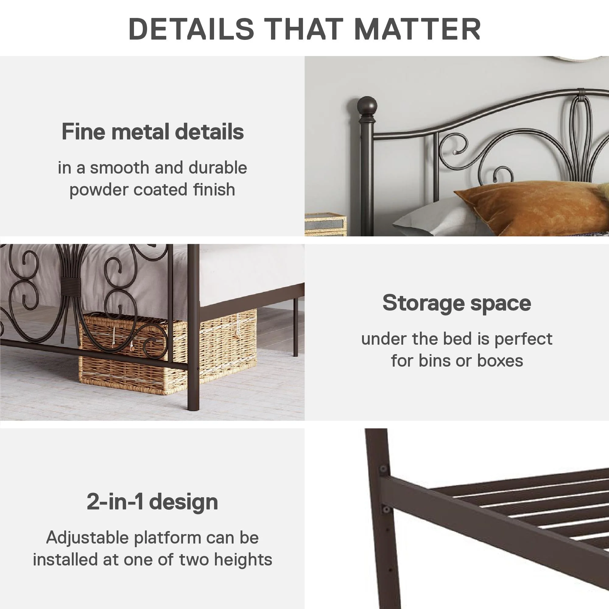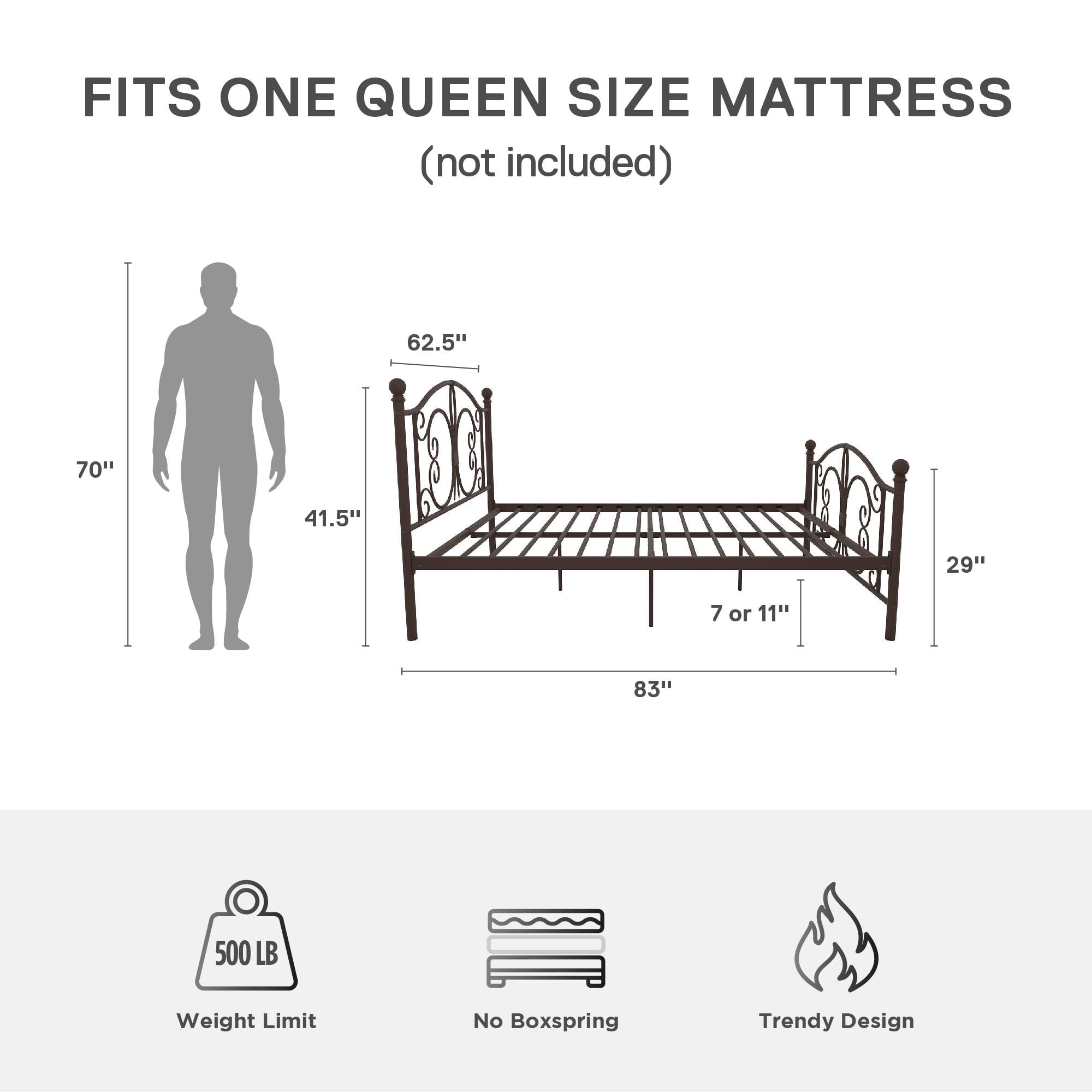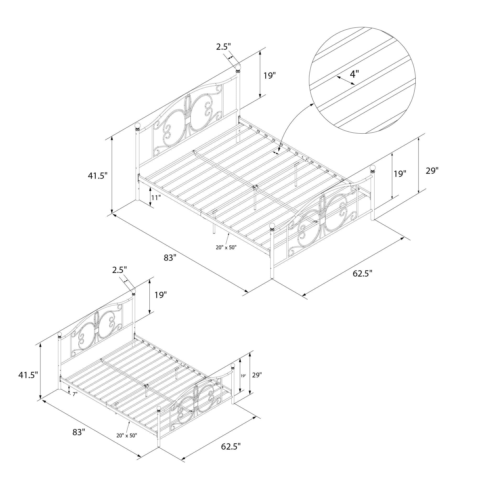 Modern & Elegant Design: Parisian inspired bed with intricate scrollwork and finial bed posts detailing on the headboard and footboard for traditional styling. Available in multiples sizes and colors and ships in 1 easy to handle box Adjustable Height: Designed to maximize space, the adjustable bed frame’s height can be installed at 7″ from the floor for a lower profile or 11″ for more under bed clearance and storage space. Dimensions: 83″L x 62.5″W x 41.5″H. Weight limit: 500 lbs. Sturdy construction: Strong metal structure creates a stable frame supported by center legs and a metal bar for superior stability. Premium powder coated metal finish provides a smooth and longer lasting finish that protects against corrosion, rust No Box Spring Needed: Heavy duty metal slats ensure excellent air flow and support your mattress without the need for a box spring. The secured slats and raised sides keep your mattress in place to prevent it from sliding