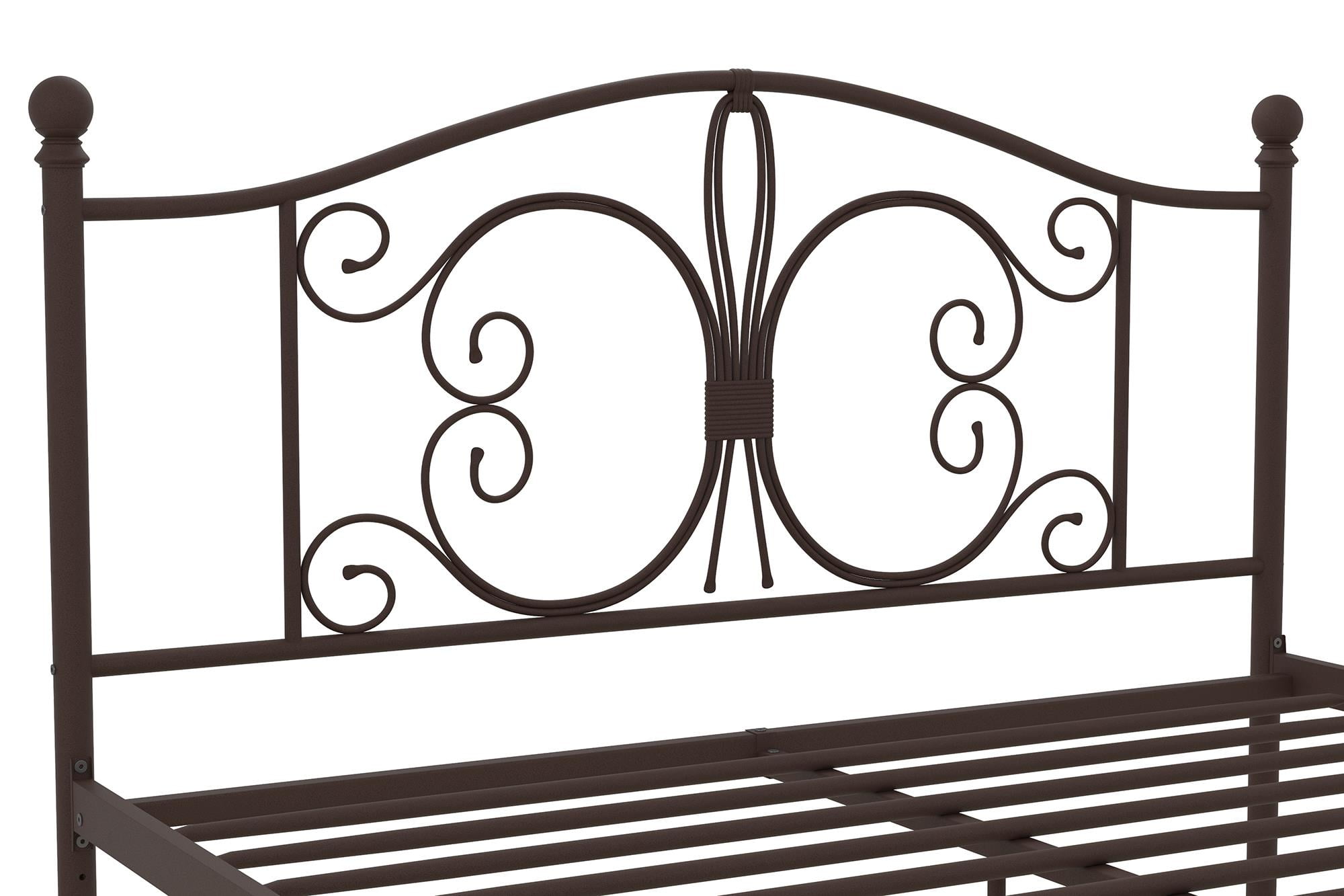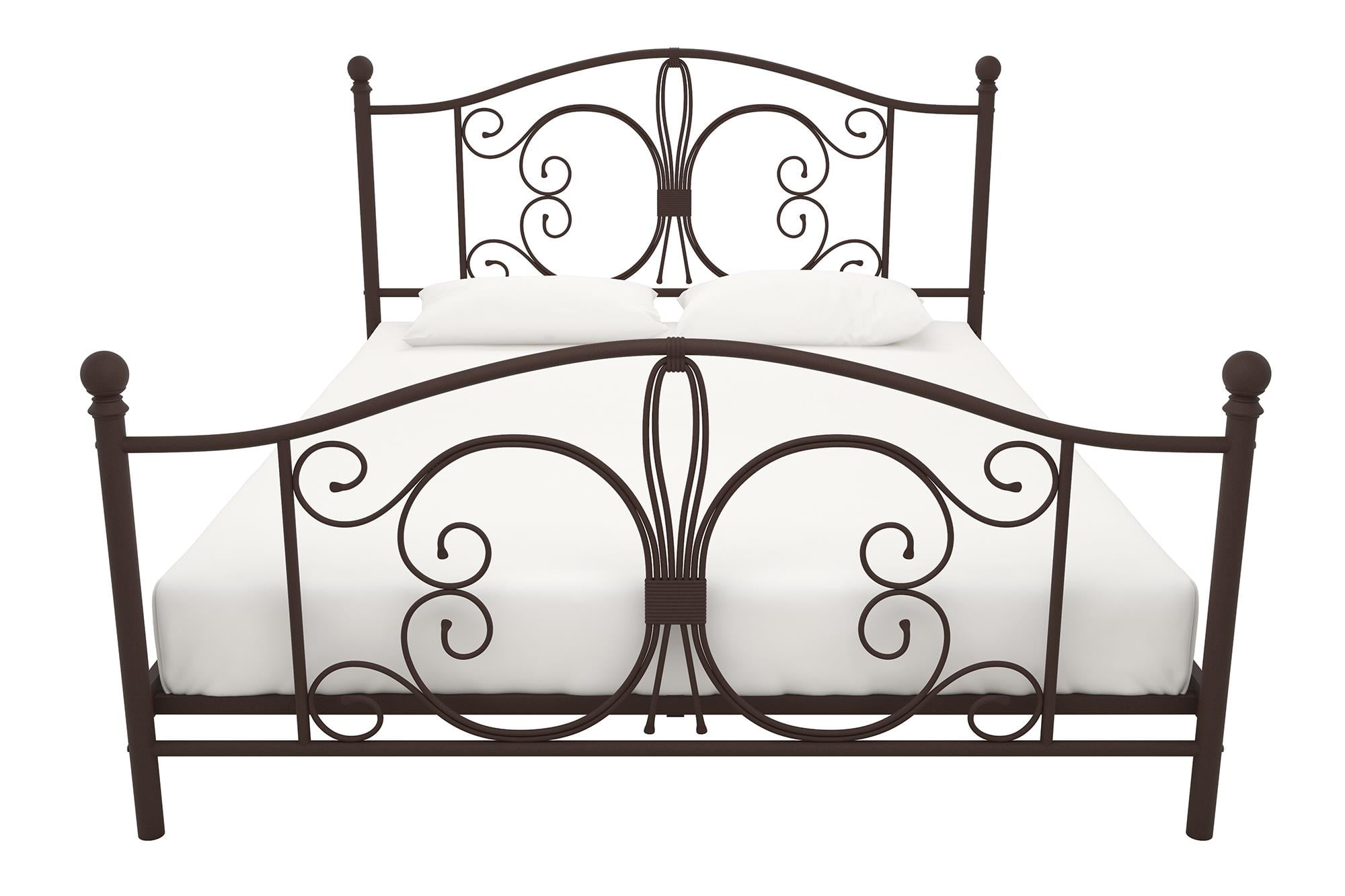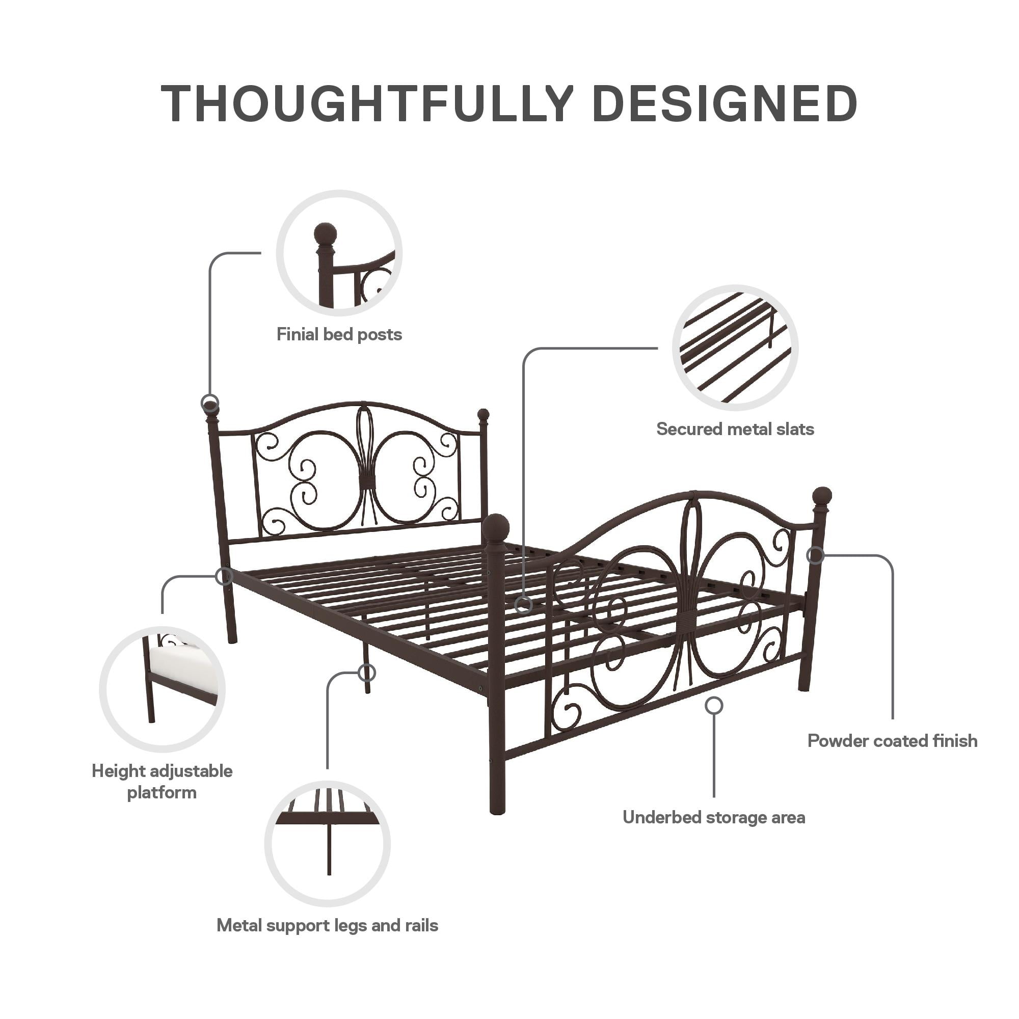 Modern & Elegant Design: Parisian inspired bed with intricate scrollwork and finial bed posts detailing on the headboard and footboard for traditional styling. Available in multiples sizes and colors and ships in 1 easy to handle box Adjustable Height: Designed to maximize space, the adjustable bed frame’s height can be installed at 7″ from the floor for a lower profile or 11″ for more under bed clearance and storage space. Dimensions: 83″L x 62.5″W x 41.5″H. Weight limit: 500 lbs. Sturdy construction: Strong metal structure creates a stable frame supported by center legs and a metal bar for superior stability. Premium powder coated metal finish provides a smooth and longer lasting finish that protects against corrosion, rust No Box Spring Needed: Heavy duty metal slats ensure excellent air flow and support your mattress without the need for a box spring. The secured slats and raised sides keep your mattress in place to prevent it from sliding