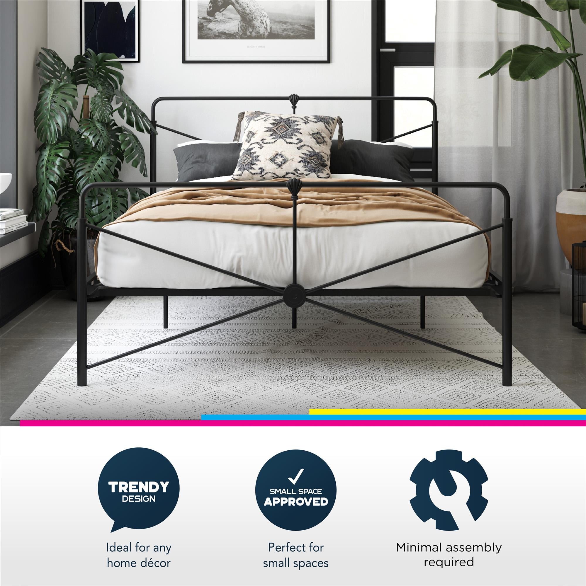 Modern design with geometric accents in the headboard and footboard. Perfect piece of furniture to add to your master bedroom, guest bedroom or teen’s bedroom. Adjustable under bed clearance offers two base height options – 7″ or 11″ – to accommodate your storage needs. All metal construction that includes side rails, additional center legs and slats. Secured metal slats allows for mattress breathability and support. No additional box spring or foundation required. Mattress sold separately. Ships in one box. Assembly required. Available in Full, Queen and King size. 1-year limited warranty.
