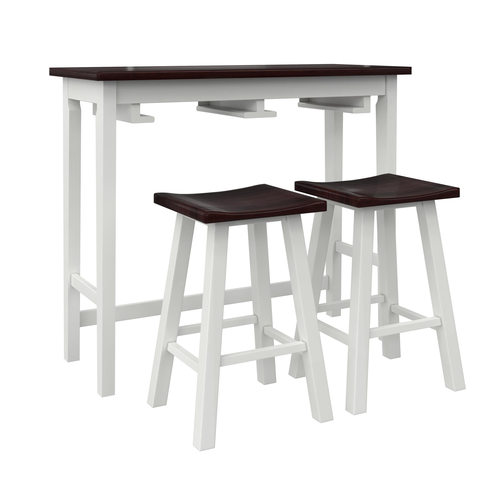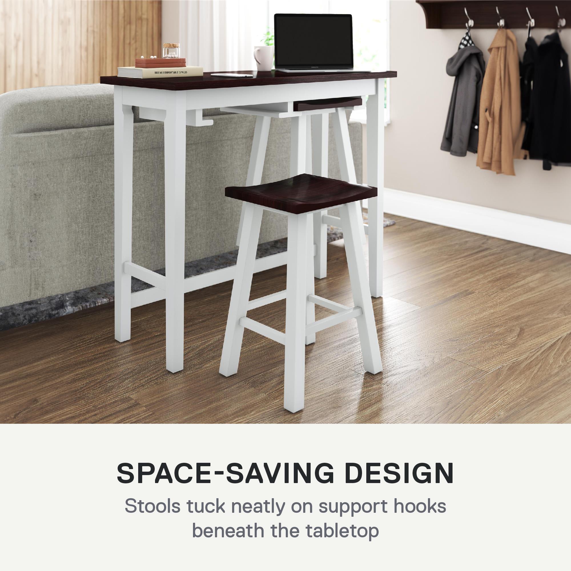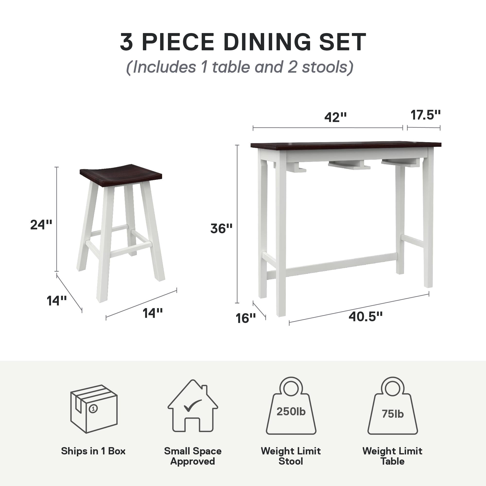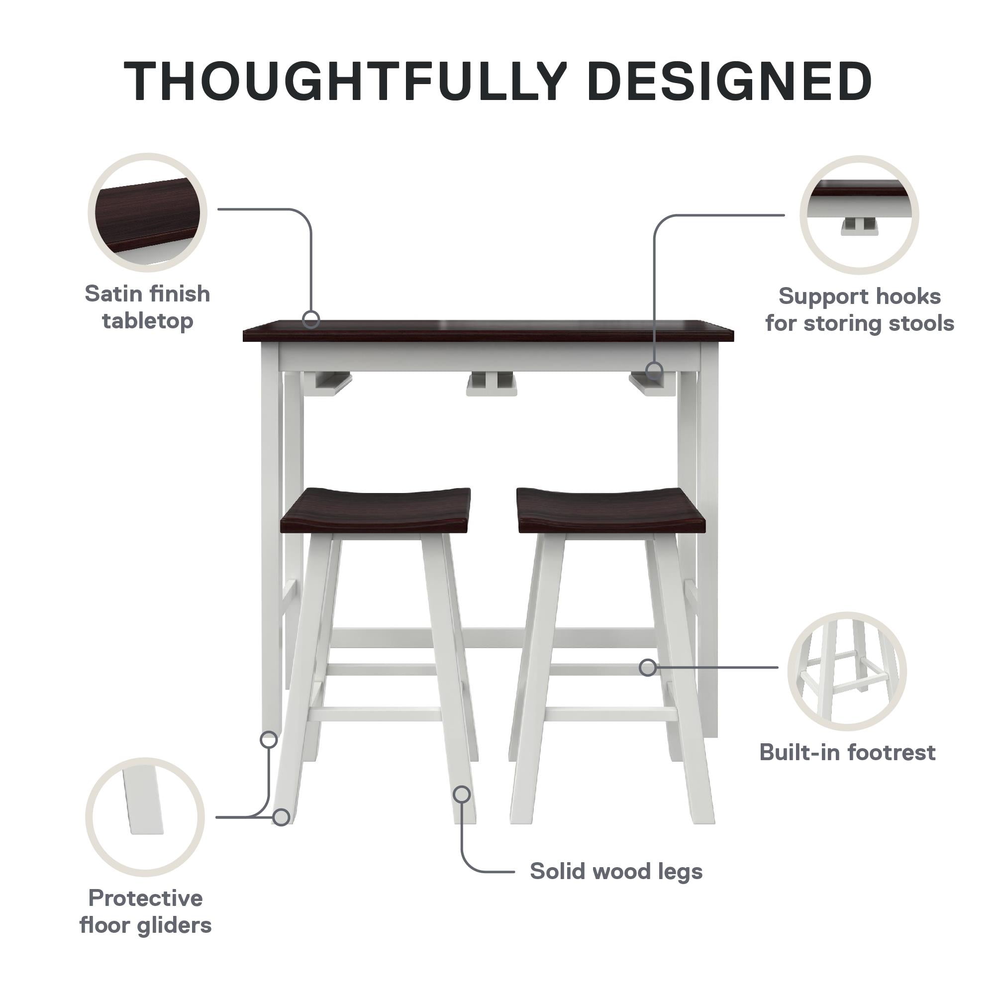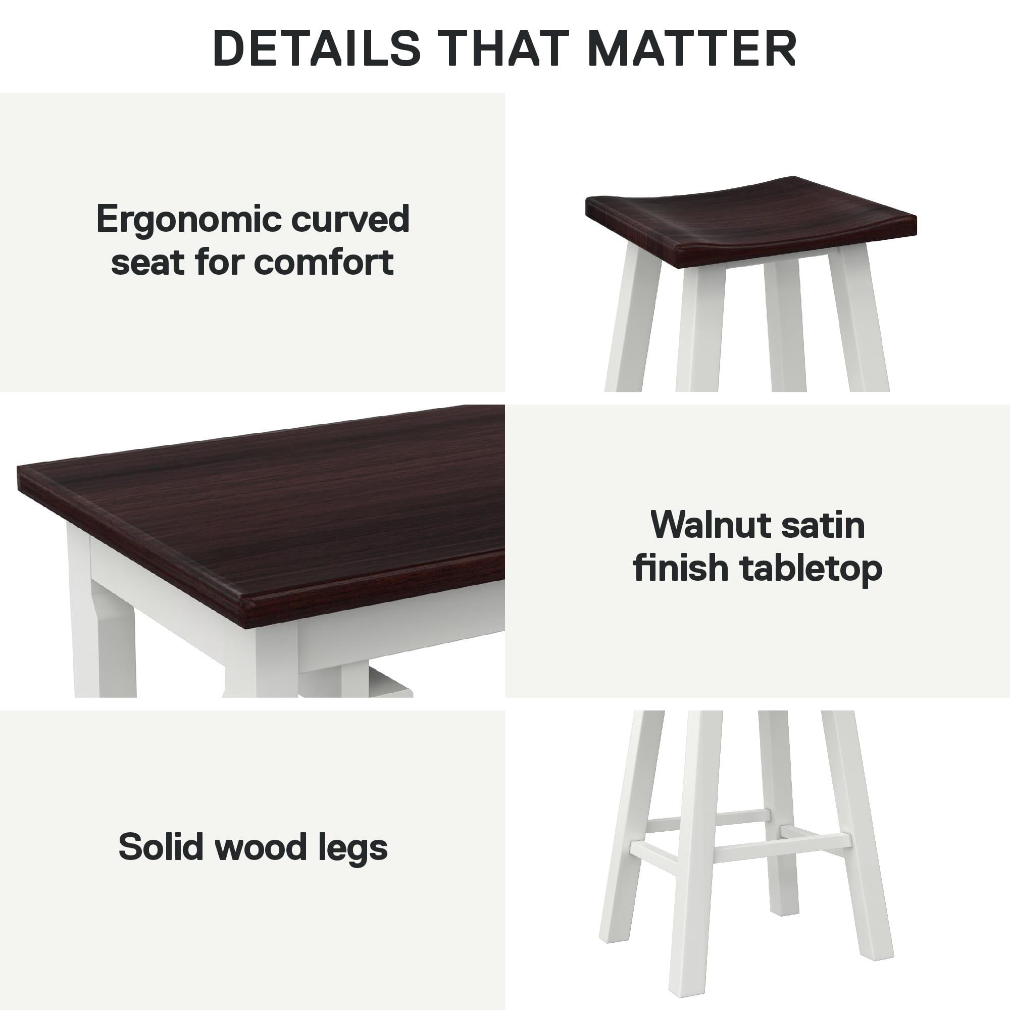 Space-Saving Layout: Our 3-piece pub dining set is perfect for small spaces, as the dining room set includes 1 contemporary counter-height pub table and a set of 2 backless style barstools that can be hung on hooks beneath the table when not in use Sturdy Wood Pub Set for 2: The Acacia wood seats and MDF tabletop have a rich walnut stain luster while the solid wood legs and table apron have a classic white contrast finish for modern appeal, ensuring overall quality, durability, and lasting use Cozy Saddle Bar Stools: The stools feature a curved design for added sitting comfort. a footrest for extra support, and floor gliders for scratch prevention and greater stability. They hold up to 250 lbs. each and can be easily stored below the table All-Around Usage: The small pub table and set of 2 chairs can be used in several settings, such as a dining room, kitchen, living room, or breakfast nook. The 3-piece bar table set is also ideal for tight basements to expand seating for entertaining