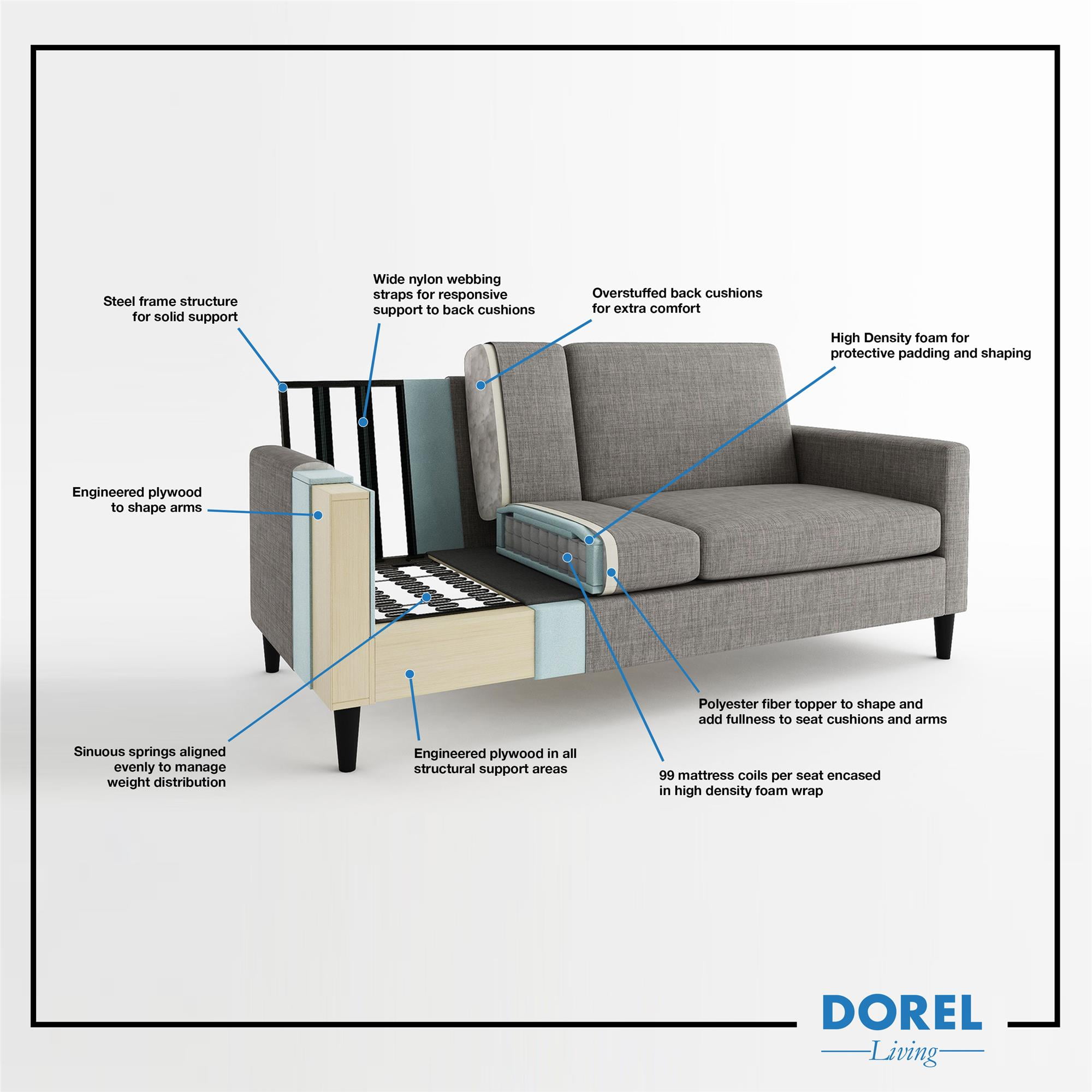 Classic lines and contemporary design make the DHP Kaci Sofa a timeless piece for living rooms and seating areas. This small spaces sofa is the perfect blend of form and function with ergonomic seating and generous padding. The sinuous spring foundation and pocket coil seat cushions combine to offer ideal comfort with no compromise to style. Upholstered in a soft gray linen-look fabric that is easy to maintain, this sofa achieves a clean and simple silhouette and will work well with any home decor. Part of the Kaci collection, the DHP Kaci Sofa will compliment your home with comfort and style.