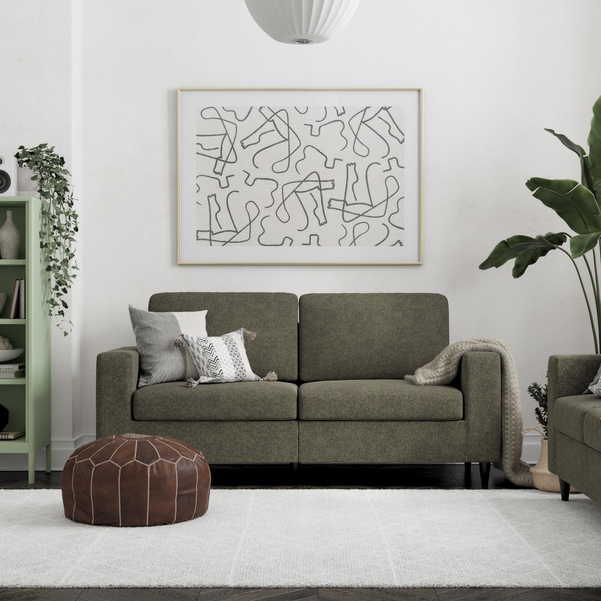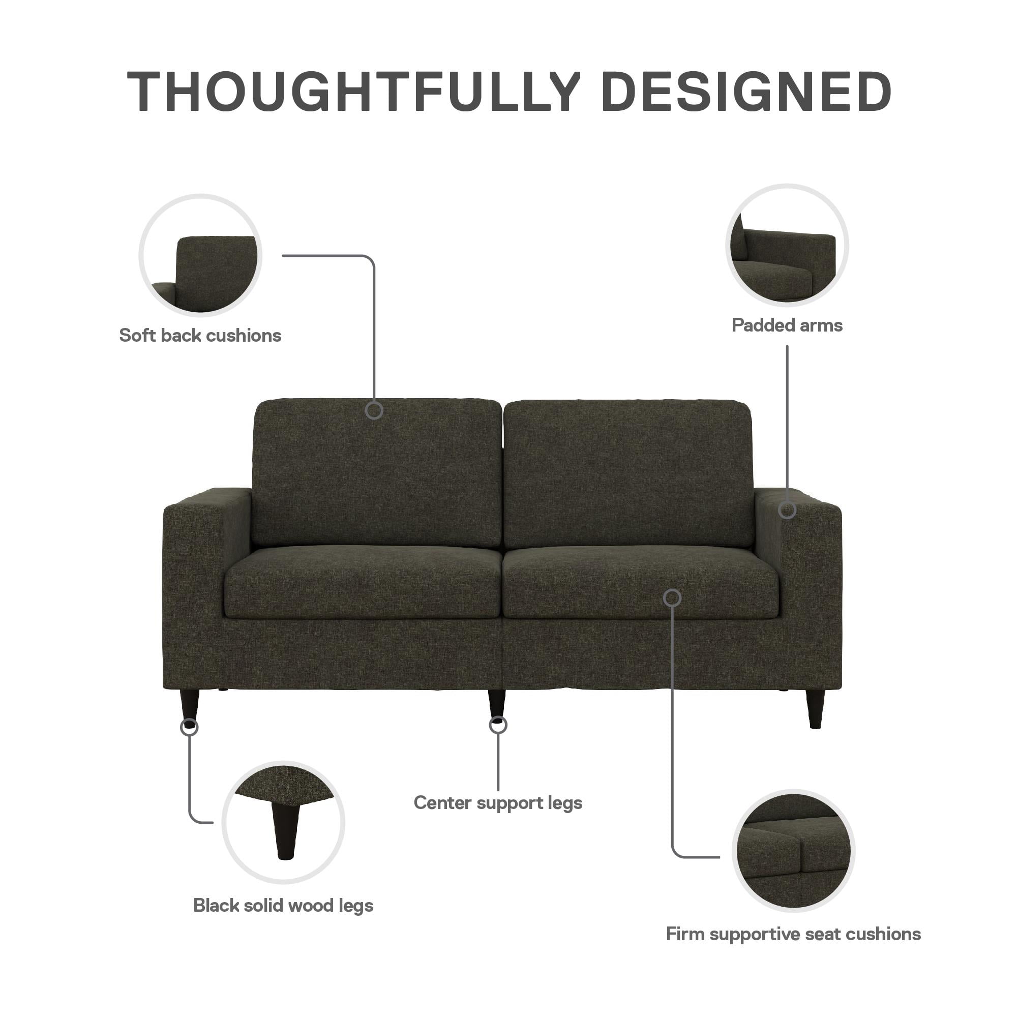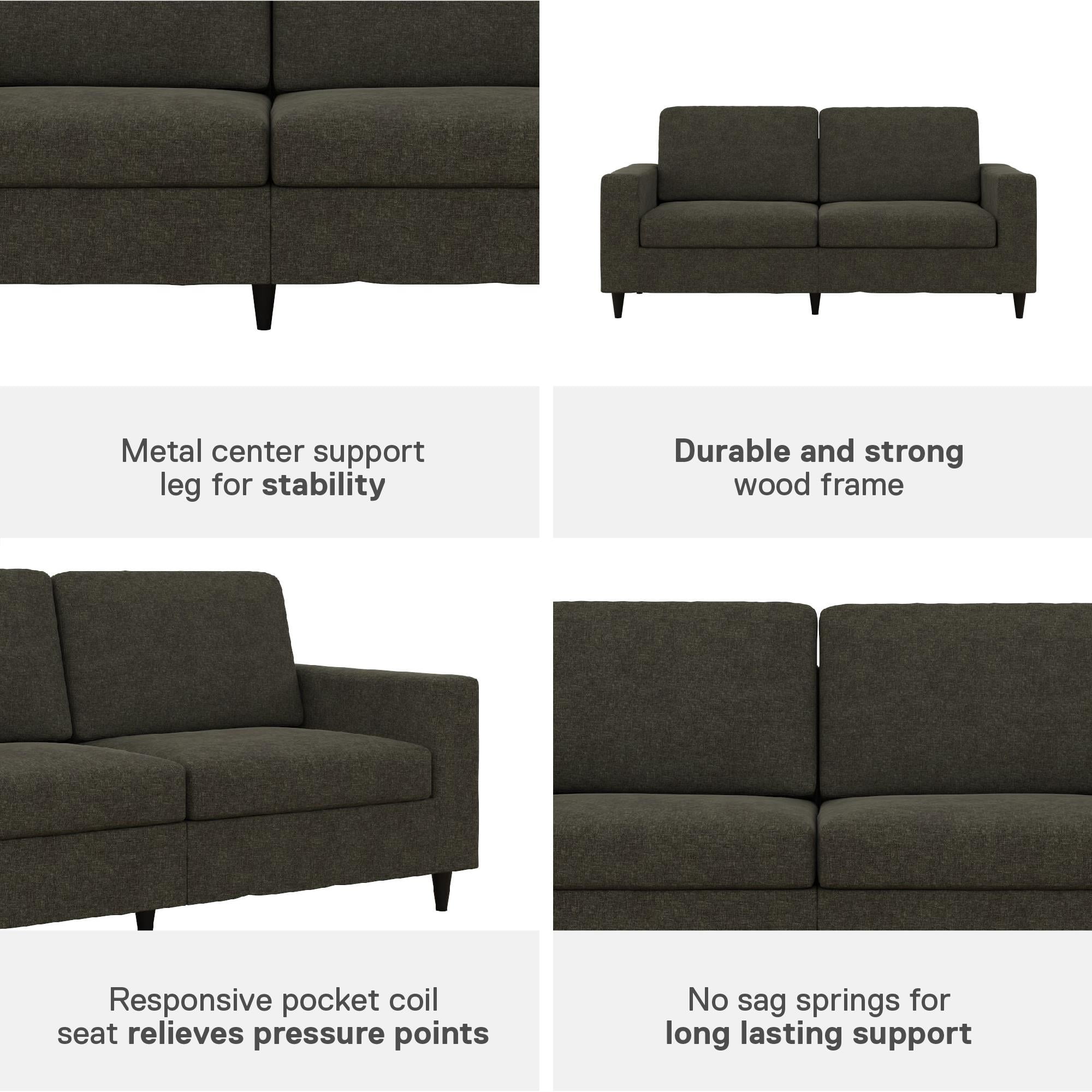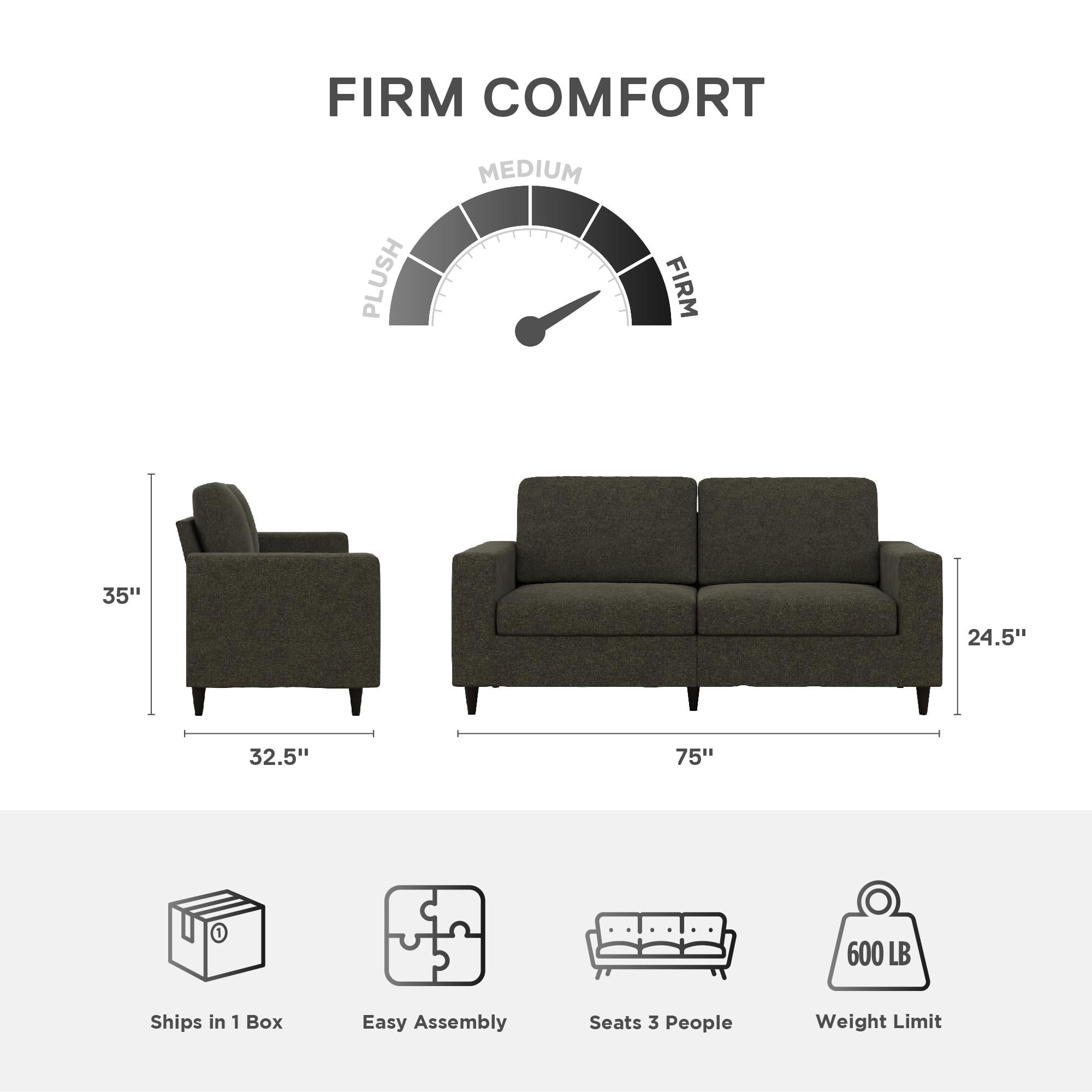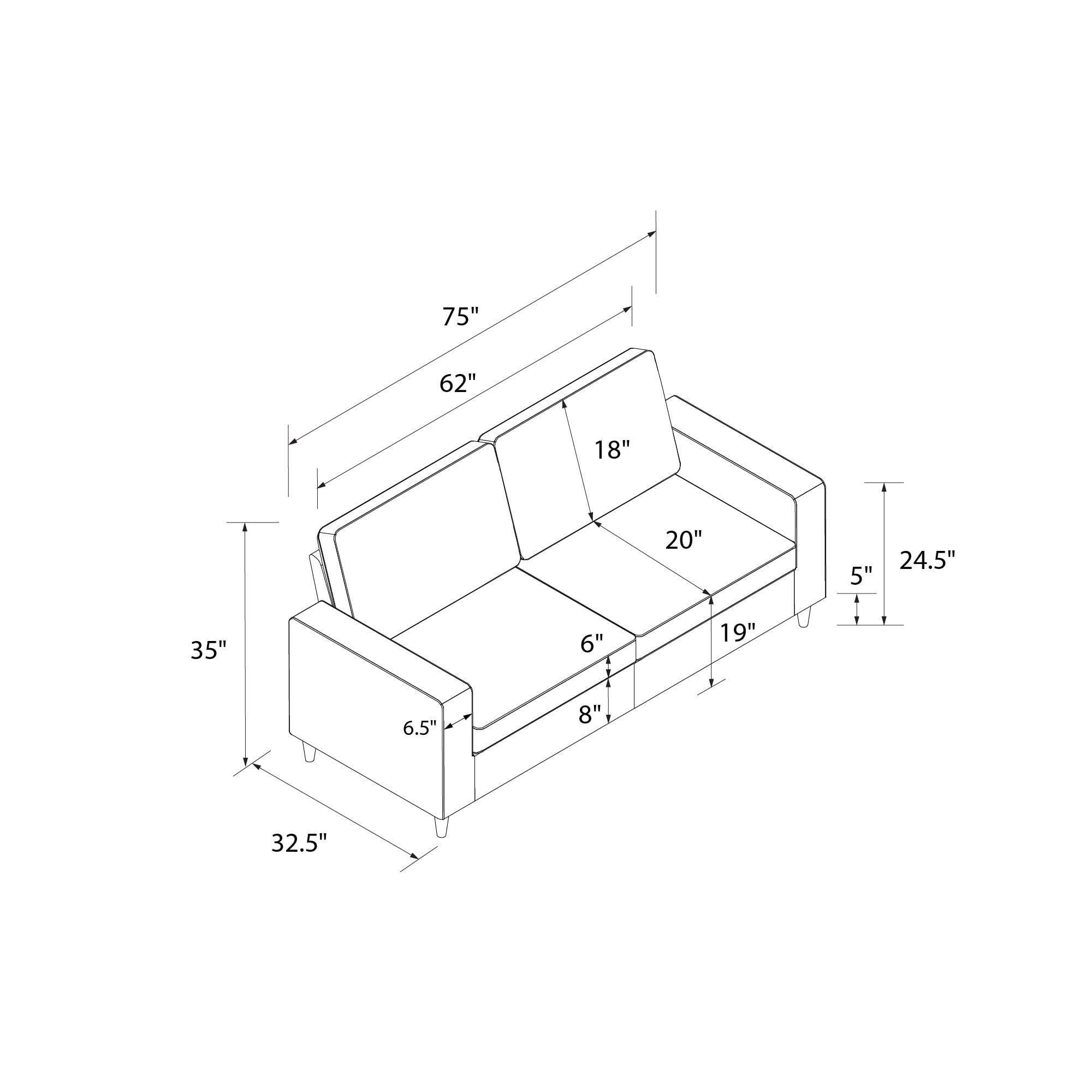 Contemporary 3 seater sofa and couch with pocket coil seats for optimal comfort. Sturdy wood frame with solid rubber wood legs with a black finish. Perfect modern furniture for your living room. Can be paired with the matching DHP Cooper 2 Seater Loveseat. Ships one box. Easy assembly. Available in multiple colors and finishes. 1-year limited warranty. Product dimensions: 75″L x 32.5″W x 35″H. Seating dimensions : 62”L x 20”W x 18”H. Weight limit: 600 lbs. Net weight: 89 lbs. Shipping dimensions: 44″L x 30″W x 26″H. Gross weight: 103 lbs.