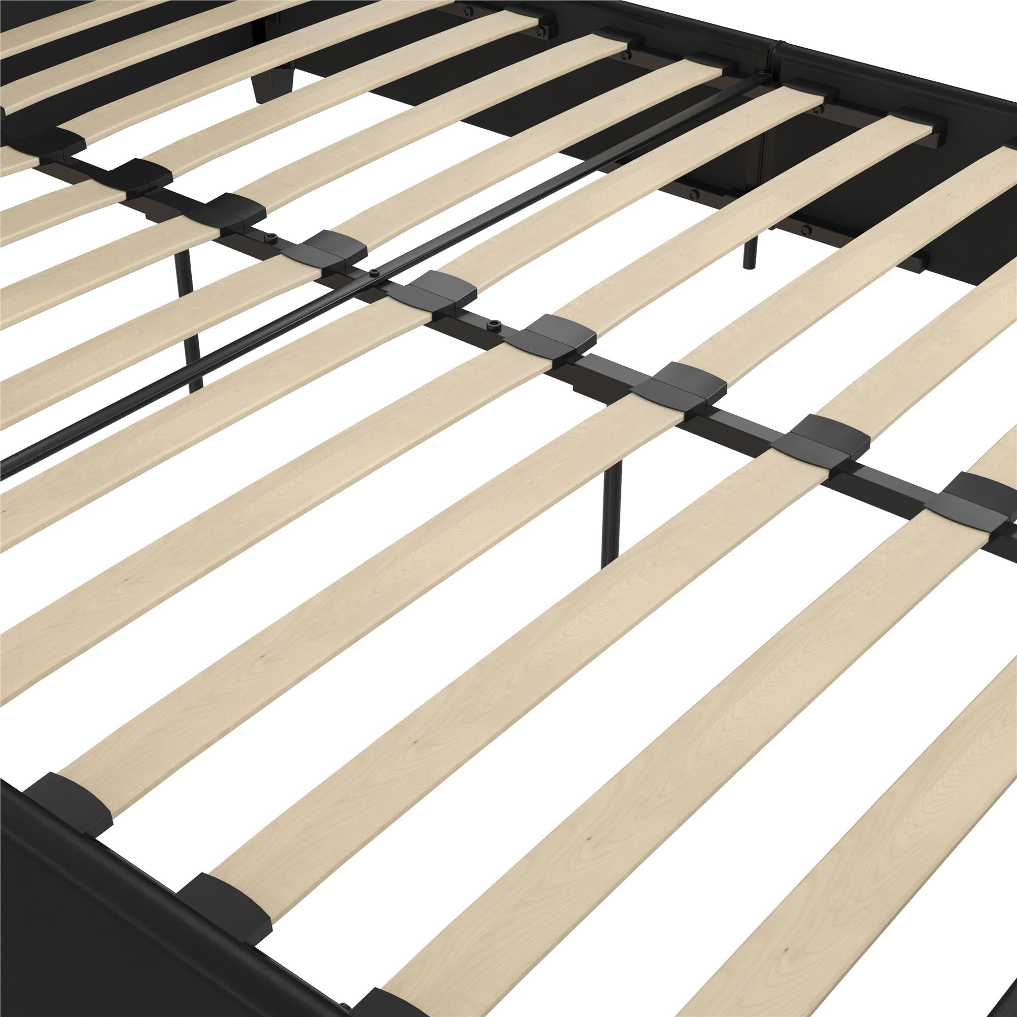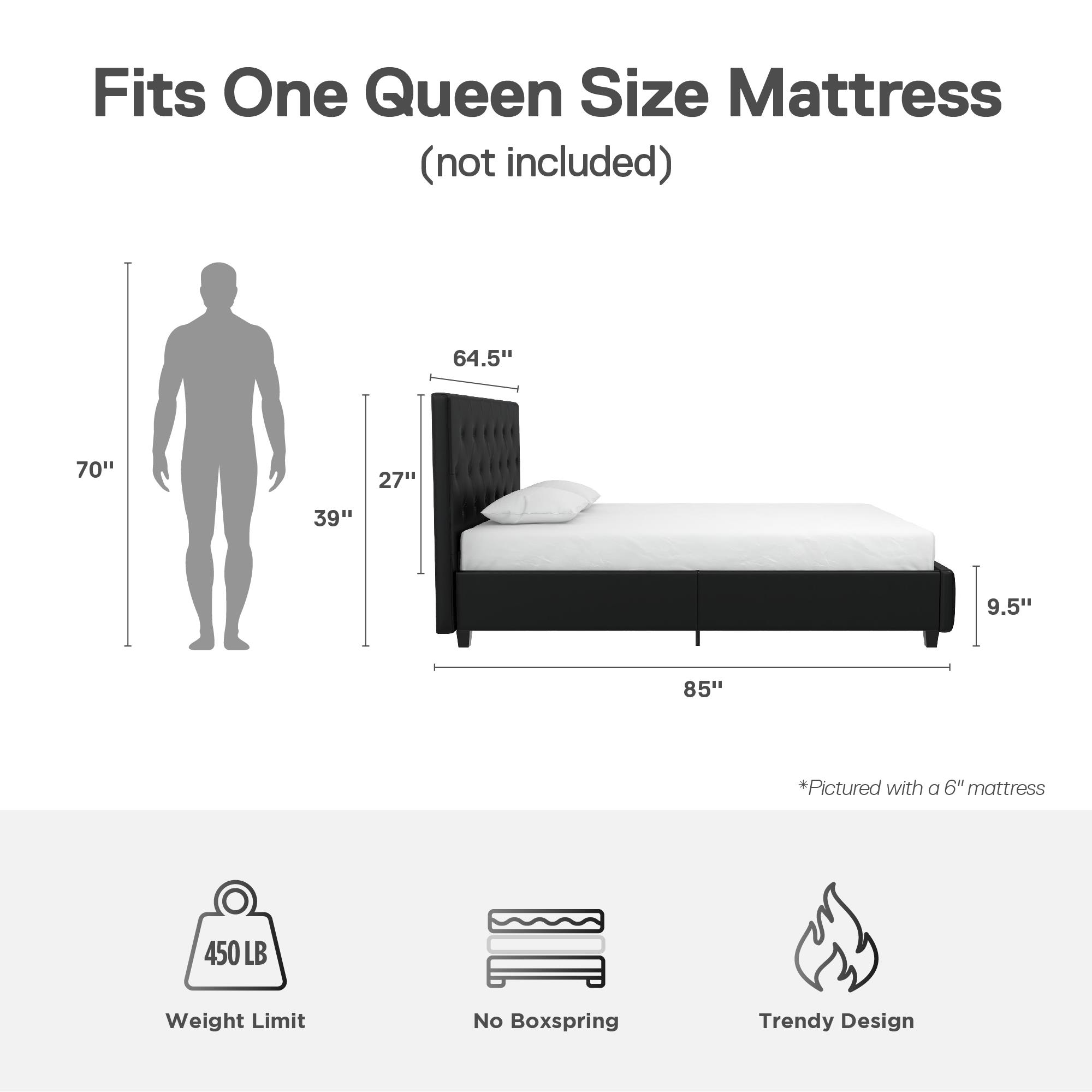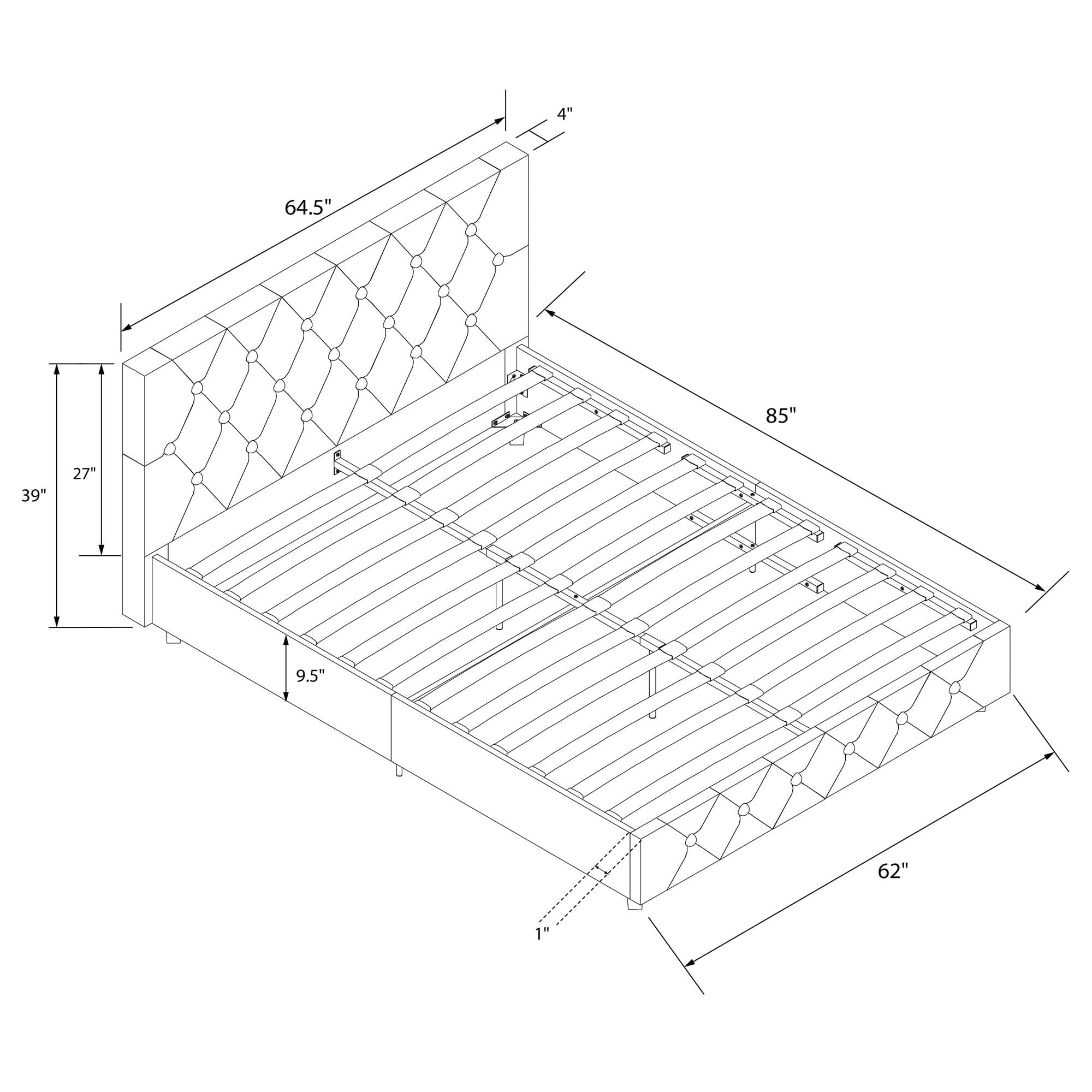 Space Saving: Designed to maximize bedroom space, this modern low profile upholstered bed rests on faux wood legs and features an elegant diamond button tufted headboard and bottom side board. Dimensions: 85″L x 64.5″W x 39″H. Max weight limit: 500 lbs Stylishly Comfortable: Enjoy a cozy place to rest your head and back thanks to the foam padded headboard extending all the way down to the slats for full back support and no pesky gaps. The raised edges keeps your mattress in place to prevent sliding; mattress not included. Sturdy construction: Interior structure made from durable metal and wood create a stable frame supported by center legs and a metal bar for additional strength and reliability. All sides are foam padded for softness and all around protective comfort No Box Spring Needed: Sprung wood slats enhance your mattress’ comfort and longevity by providing optimal support. The replaceable bentwood slats are clipped in place to stay put and offer an excellent foundation for spring, hybrid or foam mattresses