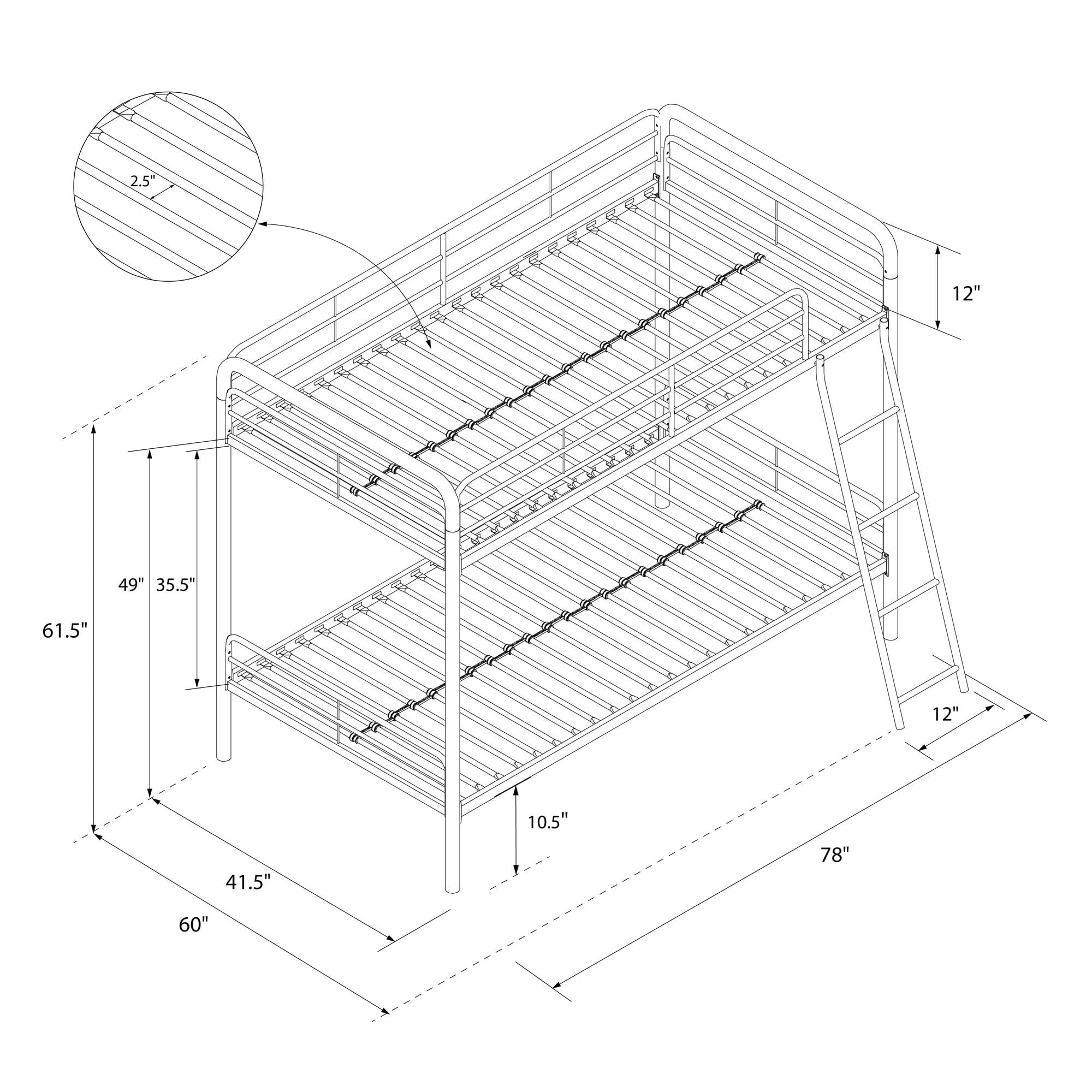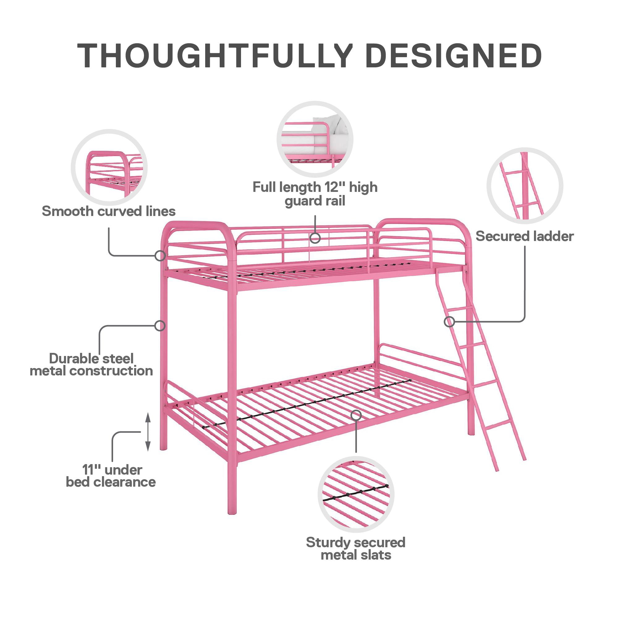 Shared spaces never have to feel cramped with the DHP Dusty Twin over Twin Metal Bunk Bed. Made for siblings and sleepovers, children and adults alike will appreciate the Dusty’s contemporary style and smooth curved lines, whether in a boy or girl kids’ bedroom or guest room. With safety and comfort always being at the forefront, the Dusty’s durable steel metal frame was built for longevity and includes full-length guard rails on the top bunk for safe sleeping, secured metal slats on both beds for complete mattress support without the need of a box spring, and an integrated front access ladder that is easy to climb up and down. If that wasn’t all, it also features a generous 10.5-inch clearance below the bottom bunk for underbed storage bins or containers that can hold sports equipment, toys and games, or clothing and shoes. Also available in Twin over Full size, embrace small space living and maximize your home’s floor space with the Dusty. Mattresses not included. Children must be at least 6 years old to use the top bunk and 3 years old to use the bottom bunk.