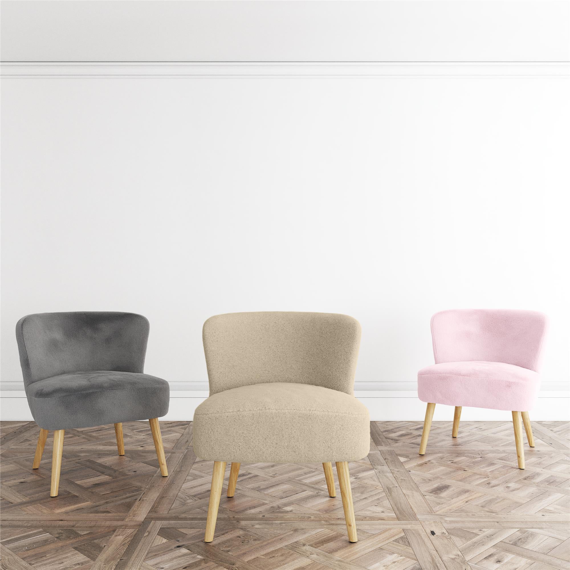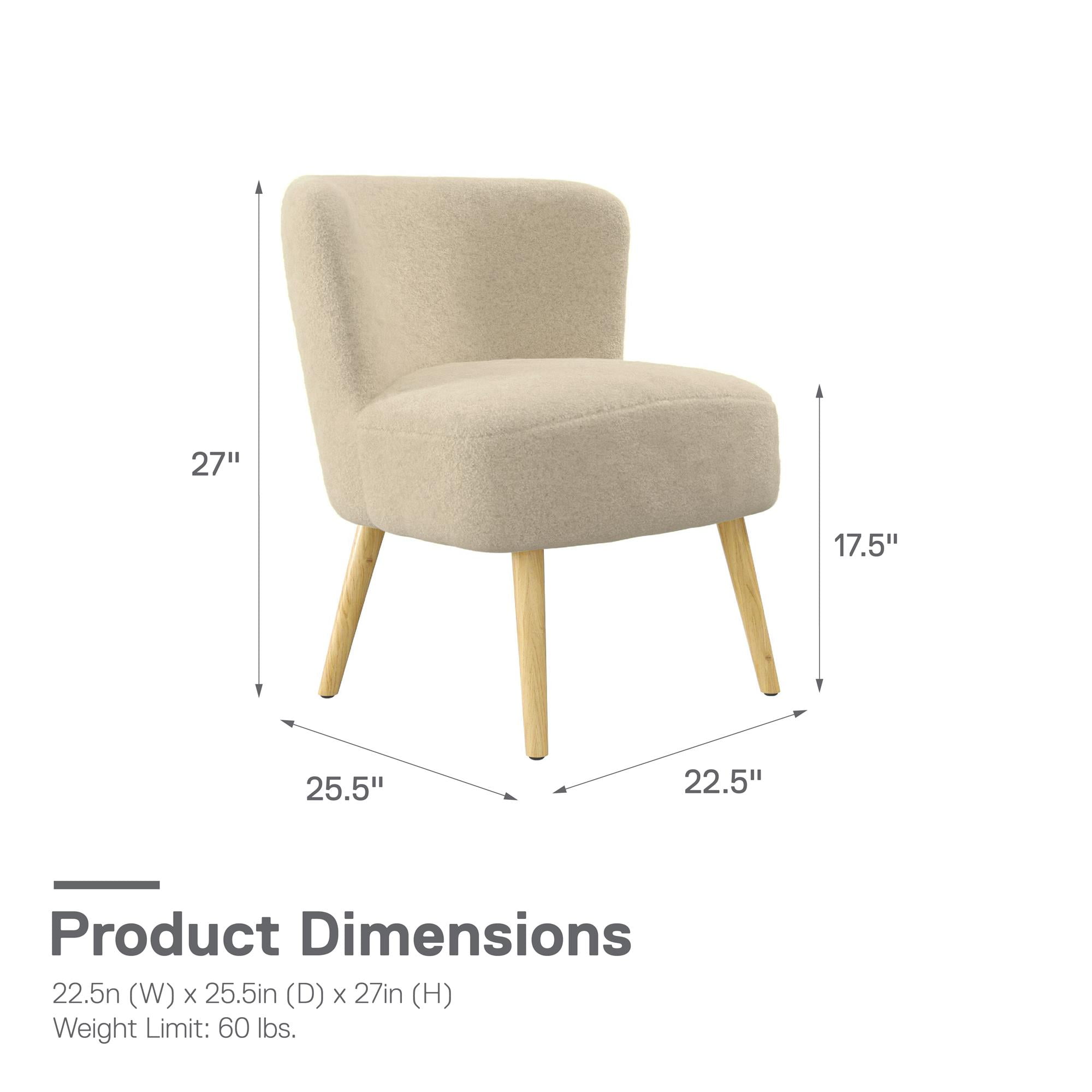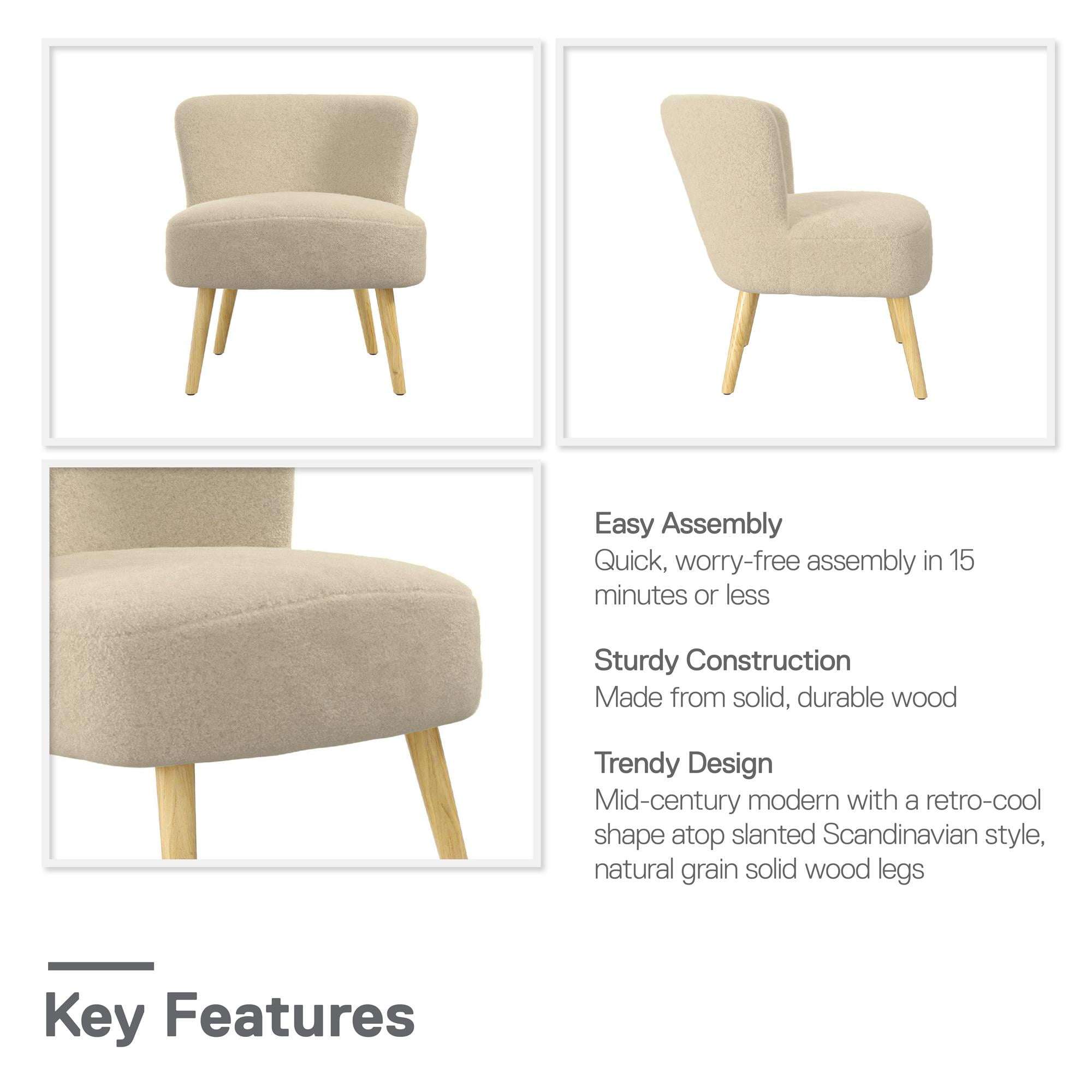 Enveloped in softness much to the joy of every little boy and girl, this adorable kids accent chair borrows from mid-century modern design with its retro-cool shape and natural grain Scandinavian style slanted solid wood legs Covered in boucle fabric upholstery that reminds you of a comforting teddy bear, the chair’s plush foam seat cushion is perfect for sitting behind an activity table in the playroom or living room while coloring or as homeschool classroom seating Made from sturdy wood, it is a durable piece of furniture that will withstand your child’s rambunctious personality and includes floor protector caps beneath the legs to prevent hardwood scratches when your kids drag their favorite chair around Arrives in one easy to handle box with all parts, tools, and instructions included for quick worry-free assembly in 15 minutes or less. Available in assorted colors. Gently wipe with a damp cloth to lift common spills or stains