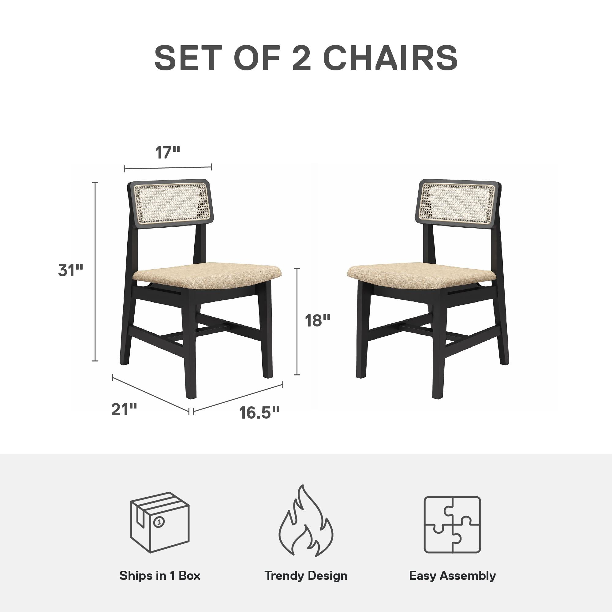 Iconic Mid-Century Modern Design: Incorporate the timeless aesthetic of clean, bohemian chic with these warm 2-piece cane dining chairs, featuring a slightly curved and natural woven cane back to help create a captivating dining room or kitchen appearance Luxurious Comfort: Our set of 2 cane-back dining chairs grants you generous foam-padded seat cushions covered in a soft, textured fabric with a breathable mesh backrest, providing a comfortable and inviting seating experience for your family and guests Easy Maintenance: The dining chairs feature a synthetic cane backrest that offers the look of natural woven rattan while being easier to clean, smoother, and sturdier than their counterparts, making them a practical and stylish choice for any modern home Quality Craftsmanship: Made with solid wood and sporting a cool two-tone finish, our side chairs boast a sturdy construction that not only adds contrast but also ensures durable longevity for ideal placement in your bedroom, home office, or living room Lightweight Silhouette: Everything needed for fast 20-minute assembly is included in box. Dining chair size (each): 19.5″W x 21″D x 31″H. Net weight (each): 11 lbs. Weight limit (each): 250 lbs. Enjoy a 1-year limited warranty against manufacturer defects
