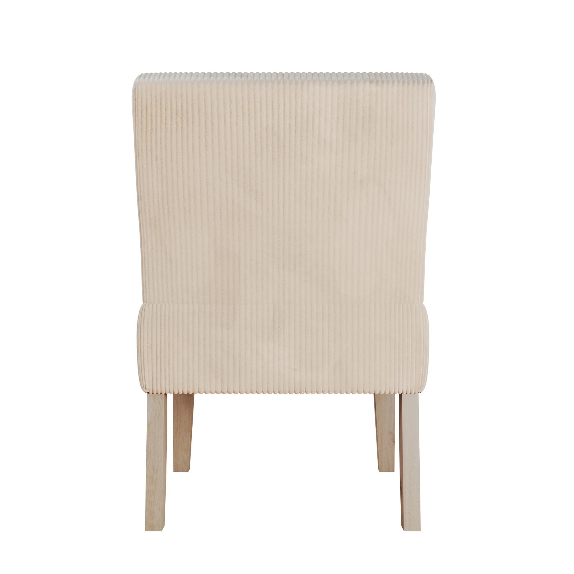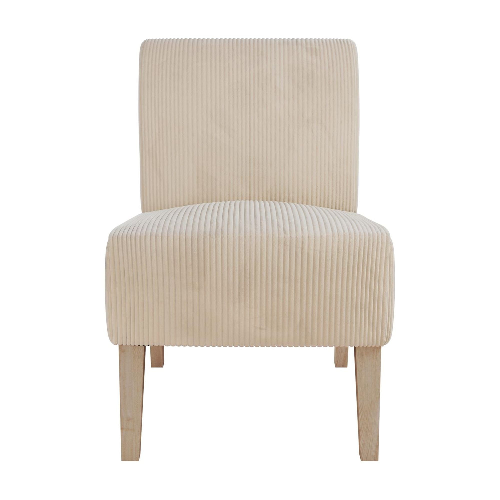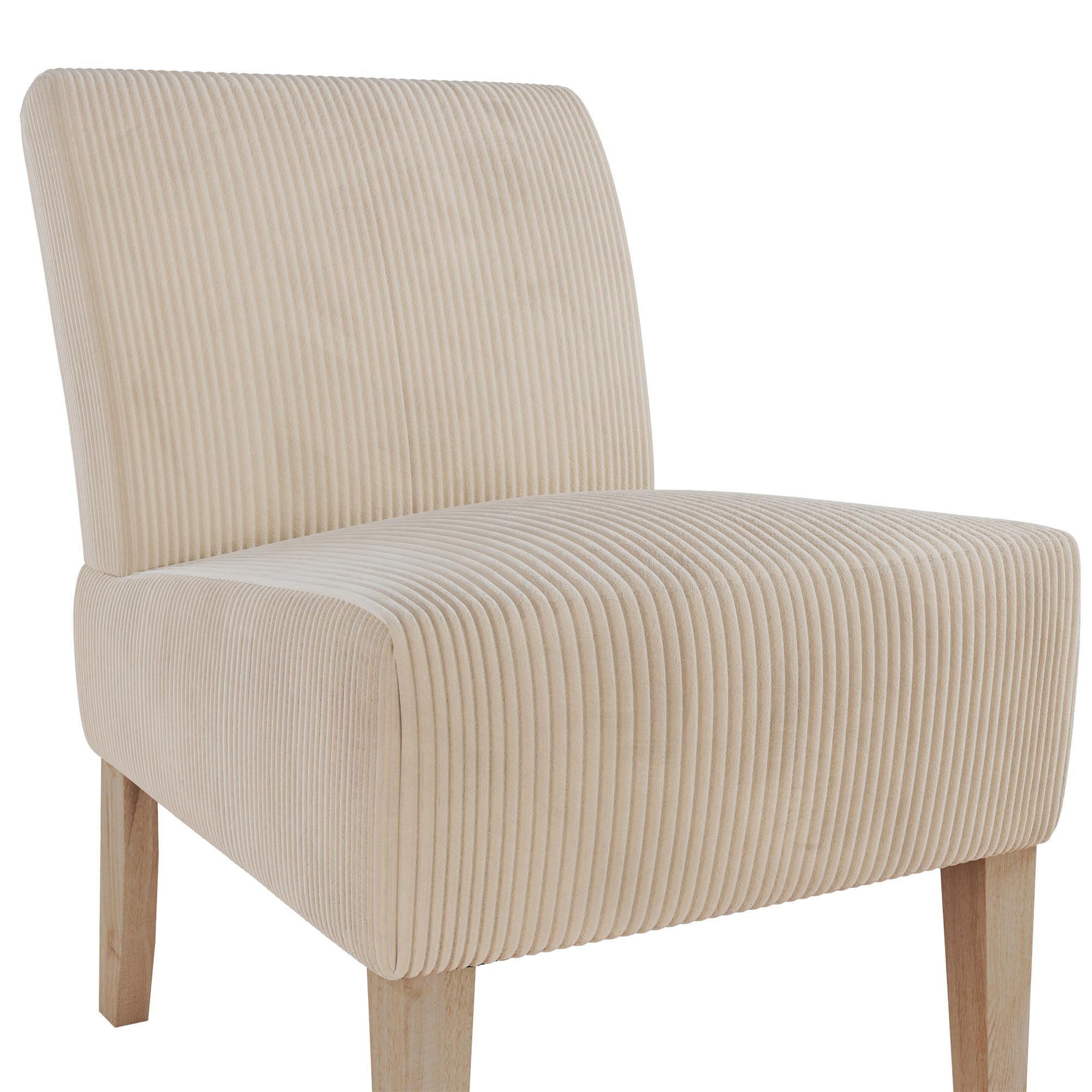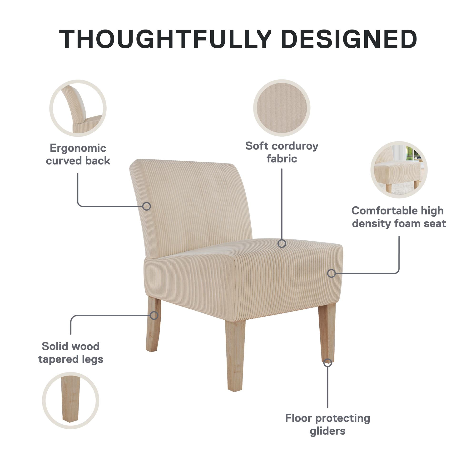COTTAGE CHIC CHOICE: Mixing contemporary character with a modern sensibility, our upholstered accent chair has a curved back and tapered solid wood legs stained in a natural finish to complement any style and offer exceptionally comfortable seating FITS EVERYWHERE: From the living room and family room to the bedroom and entryway, there is no place that this occasional chair cannot go thanks to its space saving form, armless chair design, and easy-to-glide capped legs that protect your floors SNUG & STURDY SUPPORT: The lounge chair comes upholstered in feather soft ribbed corduroy fabric made from polyester material and features a durable wood frame build and a thick seat generously padded with firm high-density foam for sitting pleasure QUICK SET-UP: Spare only 15 minutes to put your fashionable furniture piece together with all parts, tools, and instructions provided in box for worry-free assembly. Pick up additional side chairs to furnish your room (each item sold individually)