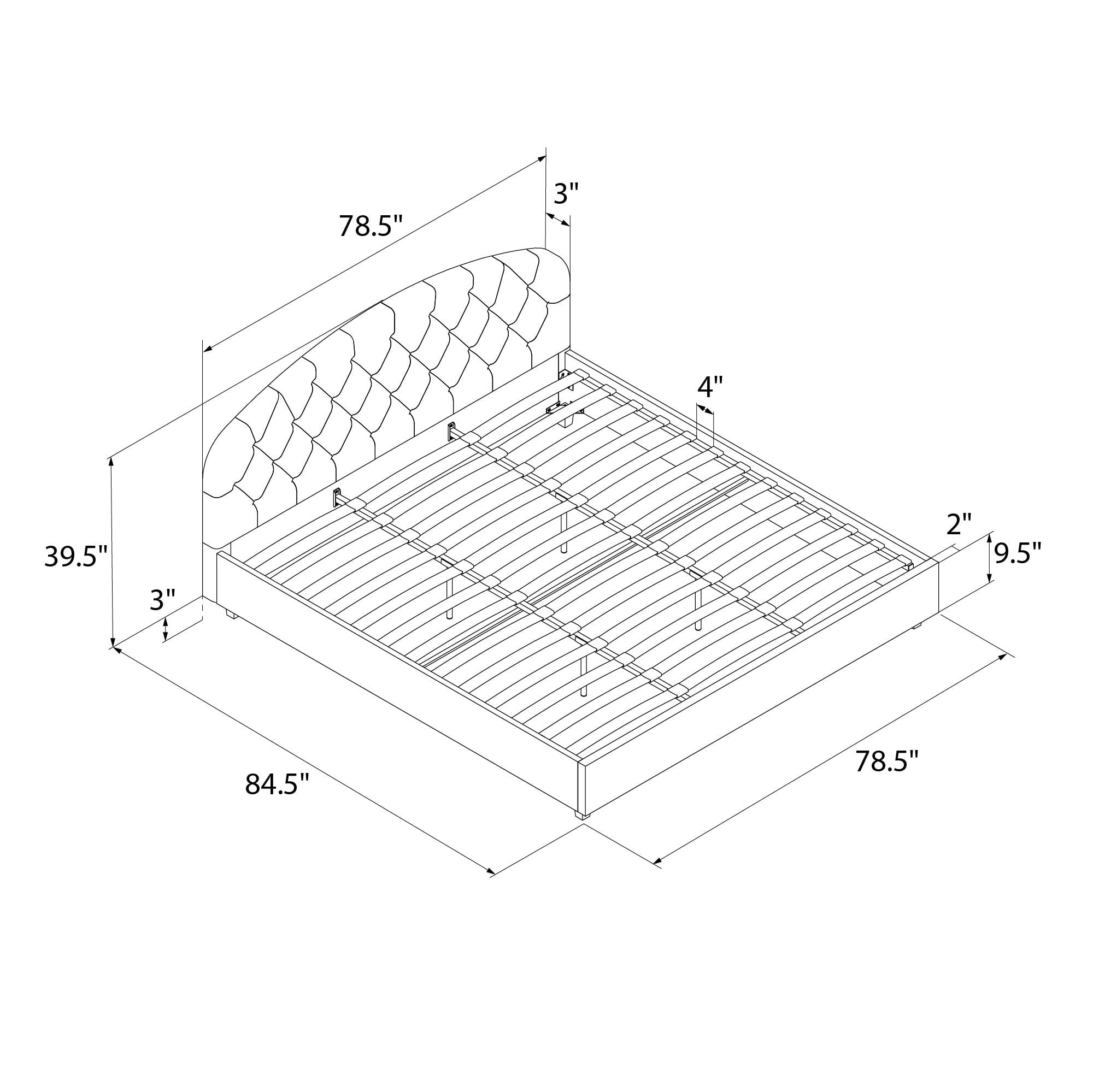 Velvet upholstered rounded headboard with diamond tufting design. Sturdy metal frame with metal side rails and additional metal center legs for support. Bentwood slat system offers mattress support and removes the need for any additional box spring or foundation. Ships in one box and assembles quickly. Available in Twin, Full, Queen and King size. 1-year limited warranty. Product dimensions: 84.5″L x 78.5″W x 39.5″H. Weight limit: 500 lbs. Shipping dimensions: Box 1: 80″L x 38″W x 3″H. Box 2: 84″L x 12″W x 6″H. Net weight: 86.5 lbs. Gross weight: Box 1: 32 lbs. Box 2: 70 lbs.