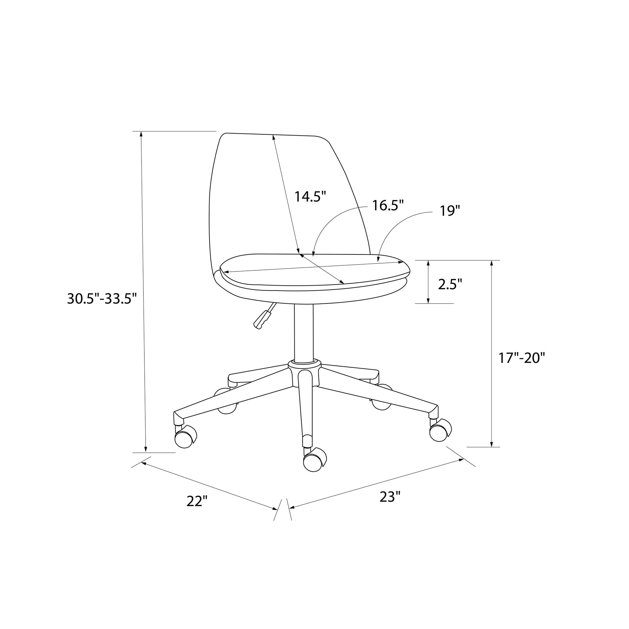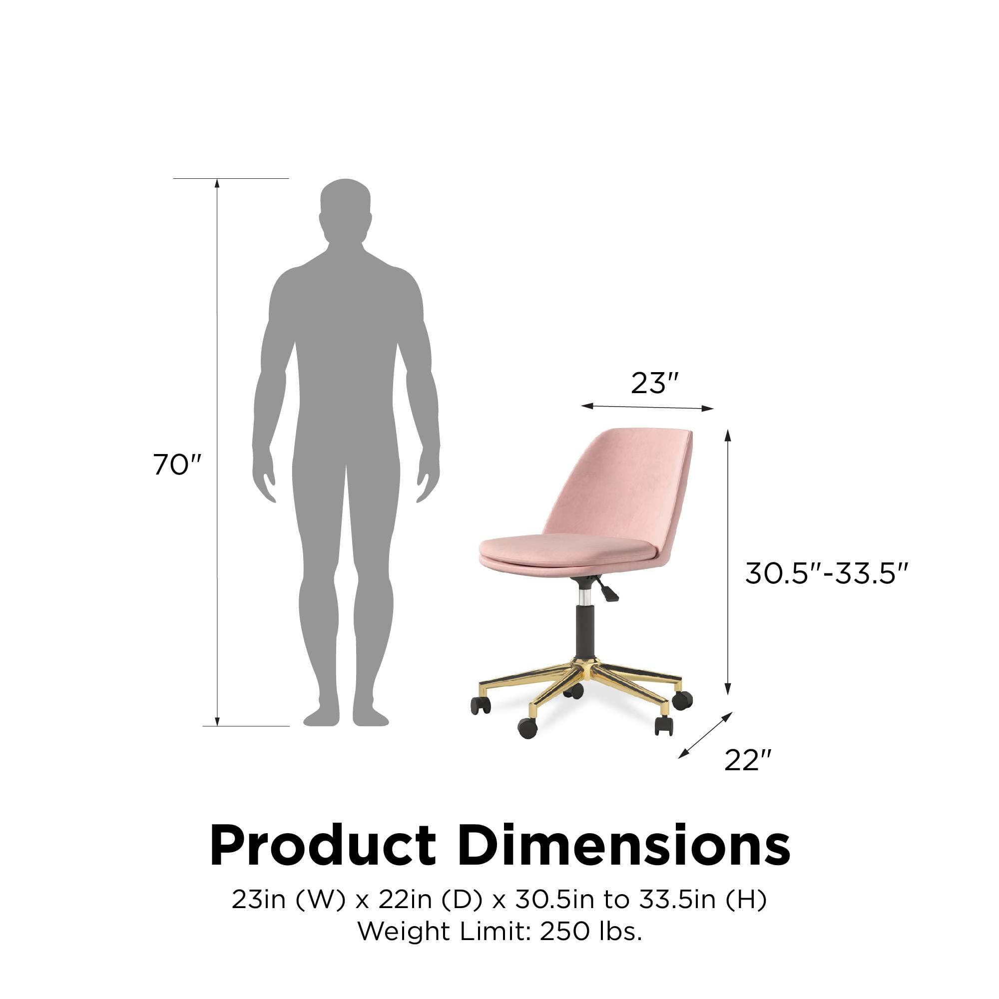Modern armless office chair upholstered in a velvet fabric and electroplated gold base. Perfect addition to your home office space. Sturdy metal five-point base features rolling caster wheels and 360 degree swivel capability for smooth movement. Includes gas lift mechanism that can adjust the seat height between 17″ and 20″. Pillowtop cushioned seat provides daily comfort during long hours of work or study. Ships in one box. Quick and easy assembly required. Offered in multiple colors. 1-year limited warranty. Product dimensions: 23″L x 22″W x 30.5-33.5″H. Weight limit: 250 lbs. Net weight: 15 lbs. Shipping dimensions: 26″L x 14″W x 24″H. Gross weight: 22 lbs. Please note that since casters move around, the depth and width of the chair is without the casters.
