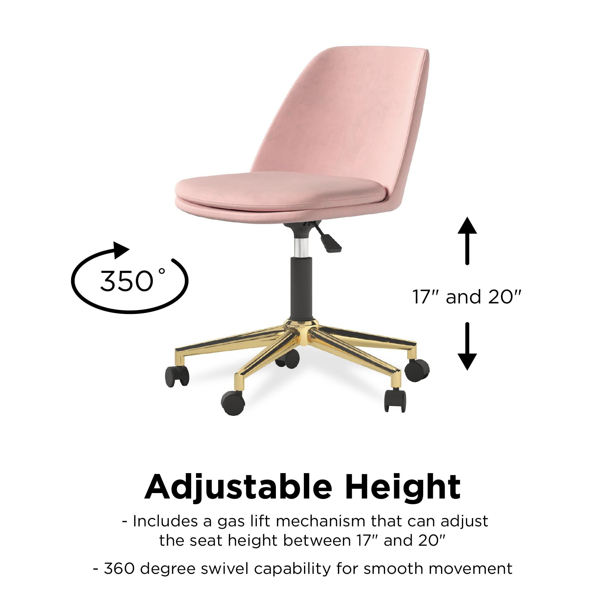 Enhance your experience and comfort working from home with the help of the DHP Ivy Pillowtop Office Task Chair. Modern and armless, this office chair is upholstered in a soft velvet fabric that sits on an electroplated gold base. Perfect as an addition to your designated home office space, the Ivy features a sturdy five-point base that includes rolling caster wheels and a 360-degree swivel capability for smooth movement. The Ivy is also adaptable to any office space and desk height thanks to its gas lift mechanism that allows you to adjust the height of the seat between 17″ and 20″. The pillowtop cushioned seat is an added bonus that will provide daily comfort during long hours of work or study. Available in a variety of trendy colors, the DHP Ivy Pillowtop Office Task Chair will instantly elevate the look of your space, whether your home office is set up in your living room, bedroom, or in it’s own room.
