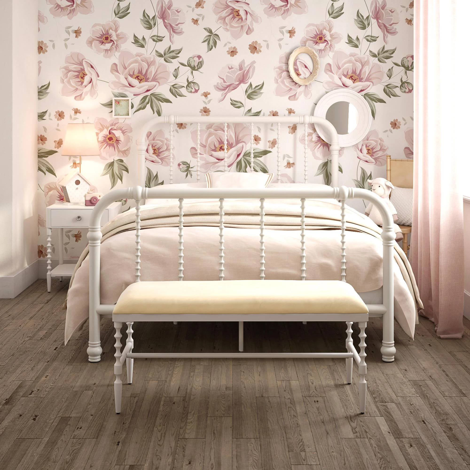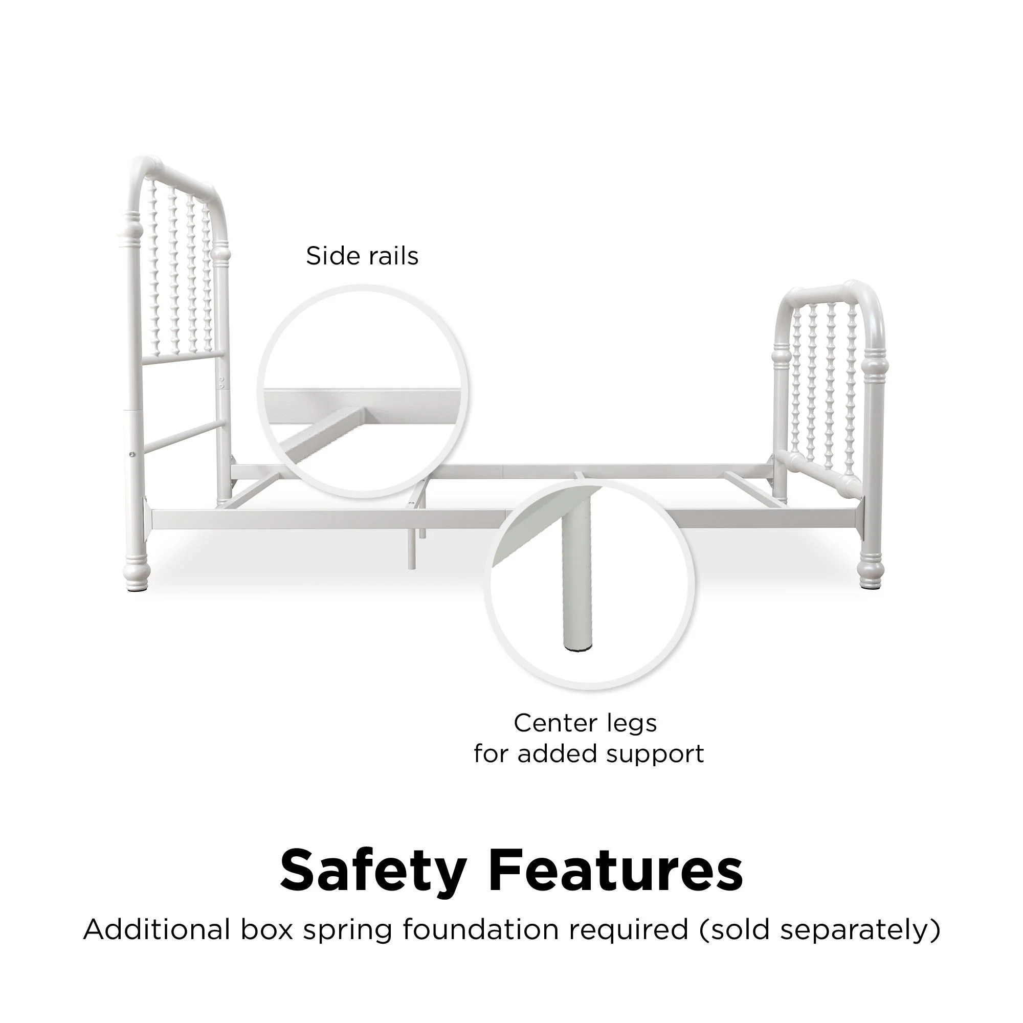 Timeless design with curved scrollwork. Perfect for a child’s room or for a guest room. Sturdy metal frame hat is stable and durable. It includes center legs for additional support and stability Available in Twin and Full sizes in white and pink. Requires foundation Ships in one box and it is easy to assemble