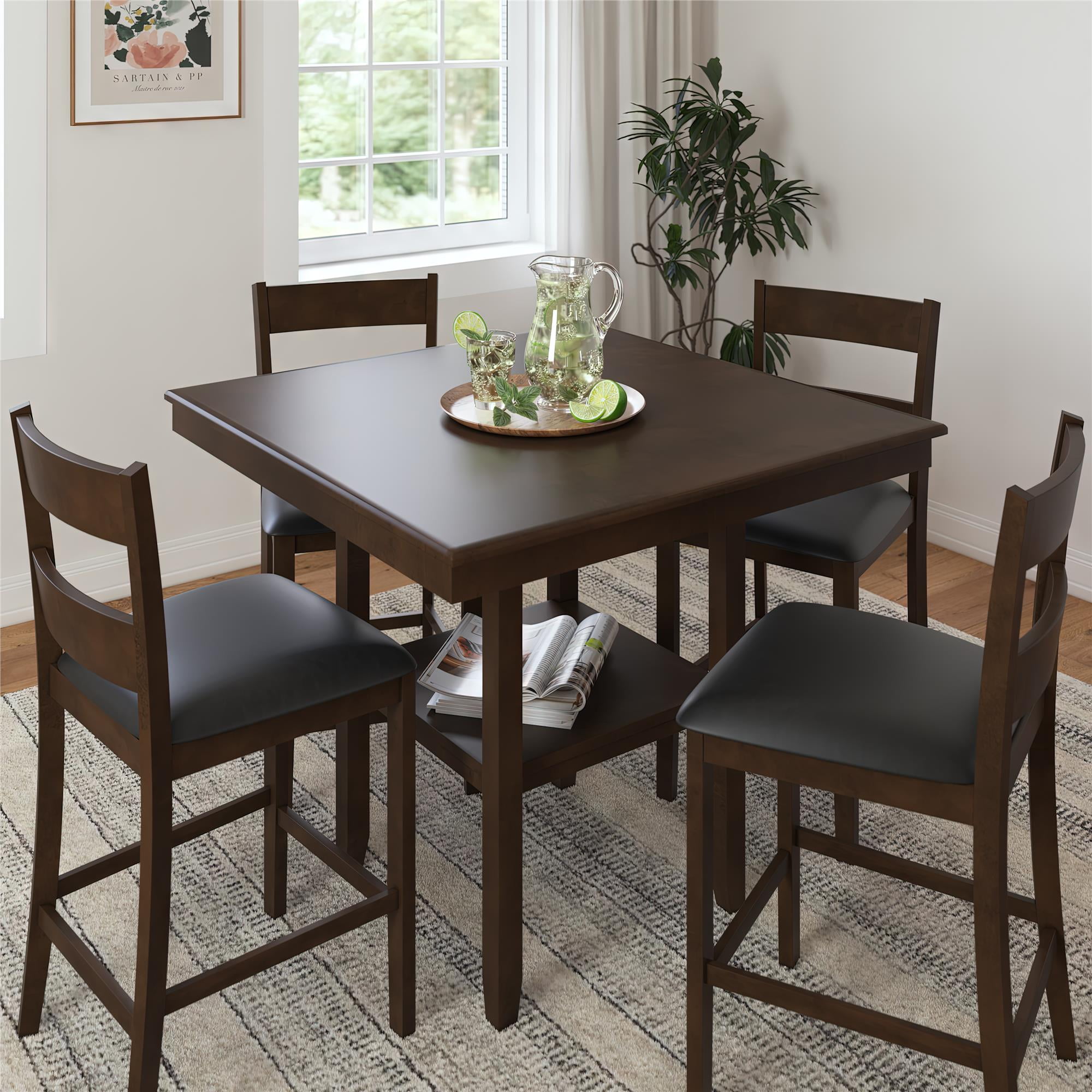 Whether you are in the mood for takeout, a home-cooked meal, or a quick bite, DHP has created the perfect dinette and kitchen table set for small space living with the Jerrie 5-Piece Counter Height Dining Table Set, satisfying all your breakfast nook, pub table, and bar table needs. The small dining room set includes 1 square table with 4 chairs, comfortably seating your family or friends in an apartment setting. The multifunctional table features an integrated shelf for open storage, offering a place to store your favorite cereal or snacks for rapid access. The dining chairs come outfitted with four-sided footrest bars for comfort, padded seats covered in easy-clean charcoal faux leather upholstery for low maintenance, and floor gliders on the chair legs for scratch protection. The 5-piece dining set consists of a solid wood dining table and chairs finished in classic espresso, delivering a sturdy and stylish backdrop for entertaining. Set aside only 30 minutes for assembly.