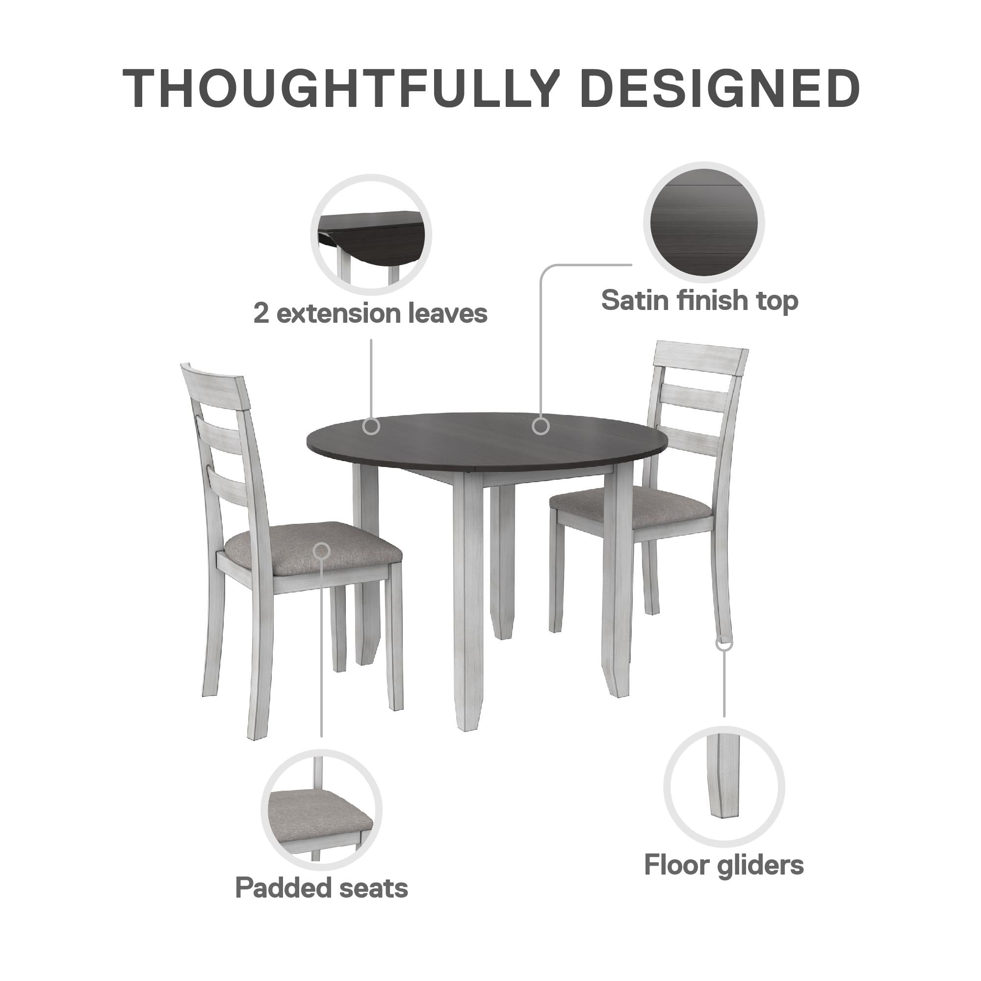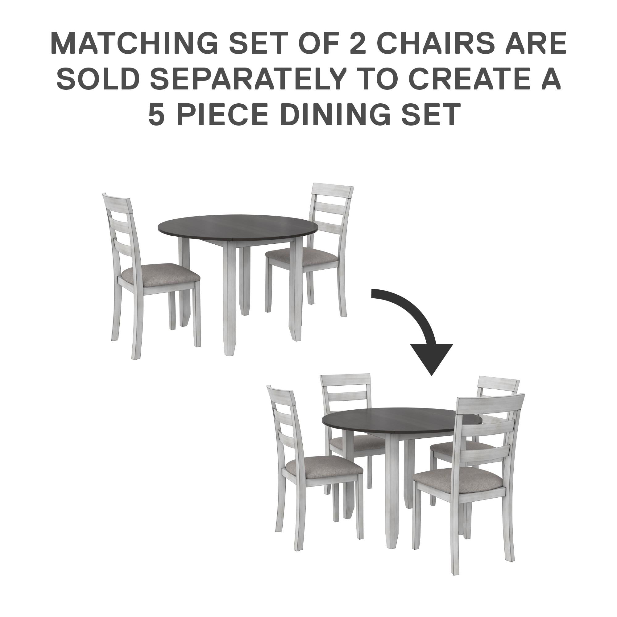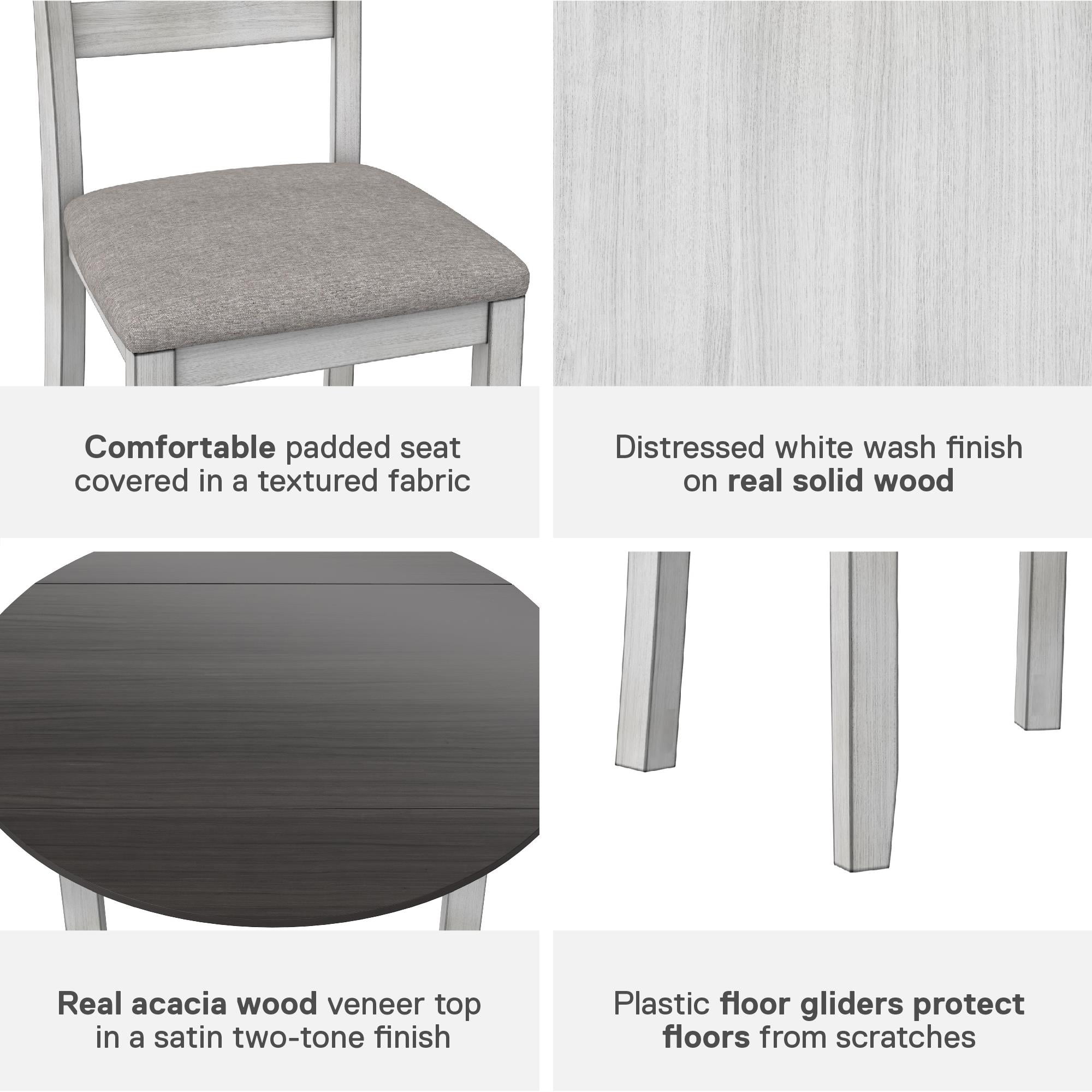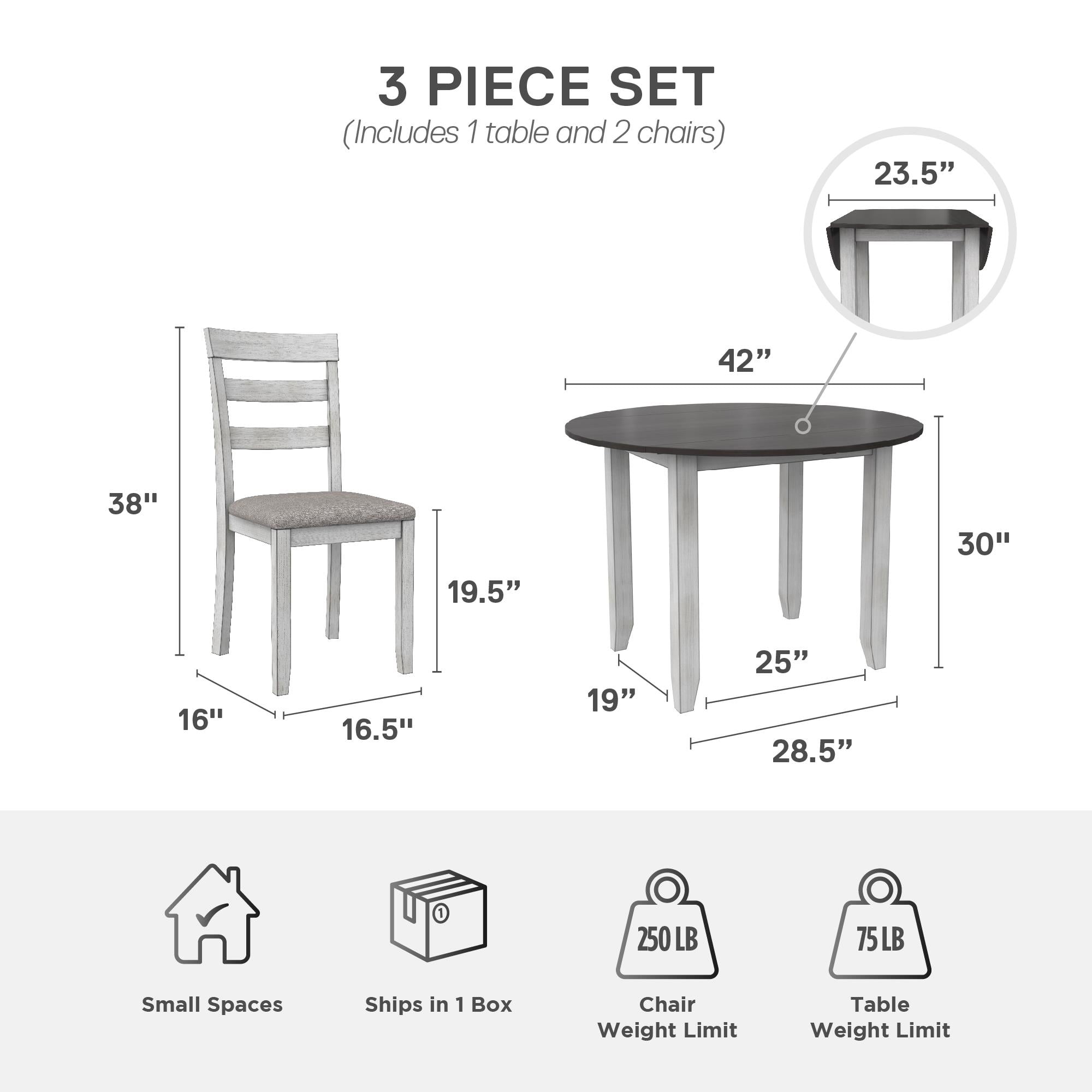 Grab a coffee and sit down, your 3PC kitchen table and dining chair set is here to provide a comfortable nook to eat, drink, and chat with 1 round table that features a hinged double drop leaf and 2 upholstered seat chairs made from solid wood The whitewashed chairs have fabric covered foam-padded seats with a strong solid wood build and the Acacia veneer grayish-brown tabletop covers a wide diameter with 2-sided drop-down extension leaves to make room for extra plates when guests drop by Durably built with a space conscious look, this set will fit in any small kitchen or dining room setting. Plus, plastic tack glides beneath the chair legs prevent scuff marks on your floors as you pull your chair in and out throughout the day Ships in one easy-to-handle box with all parts, tools, and instructions included for fast straightforward assembly in 30 minutes or less. Pick up the coordinating 2PC chair set to accommodate more friends and family for dinner (sold separately) Table dimensions: (Closed) 42″L x 22″W x 30″H. (Fully open drop leaves) 60″L x 22″W x 30″H. Weight limit: 75 lbs. Chair dimensions: 16.5″L x 16″W x 38″H. Weight limit: 250 lbs. Net weight: 74 lbs. 1-year limited warranty
