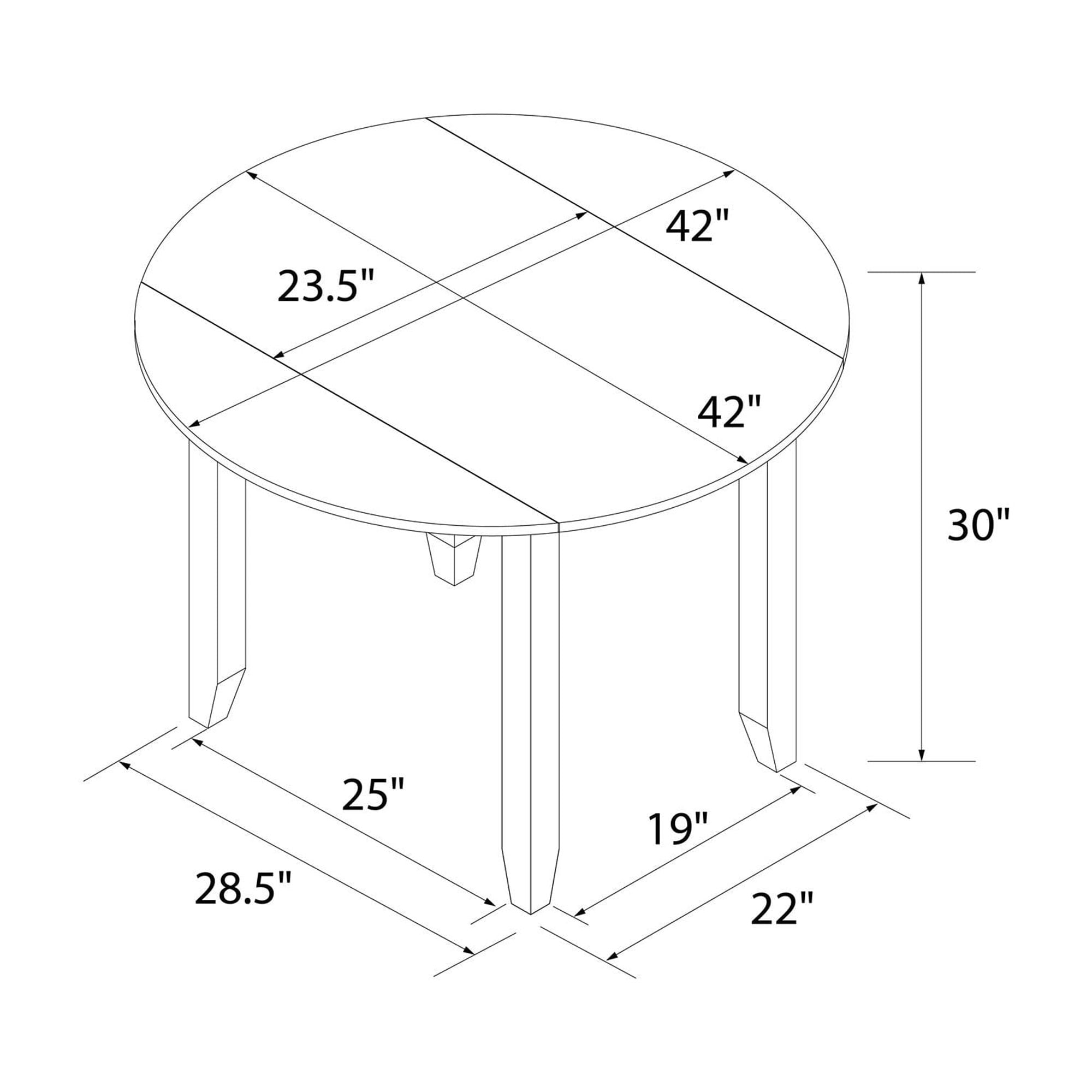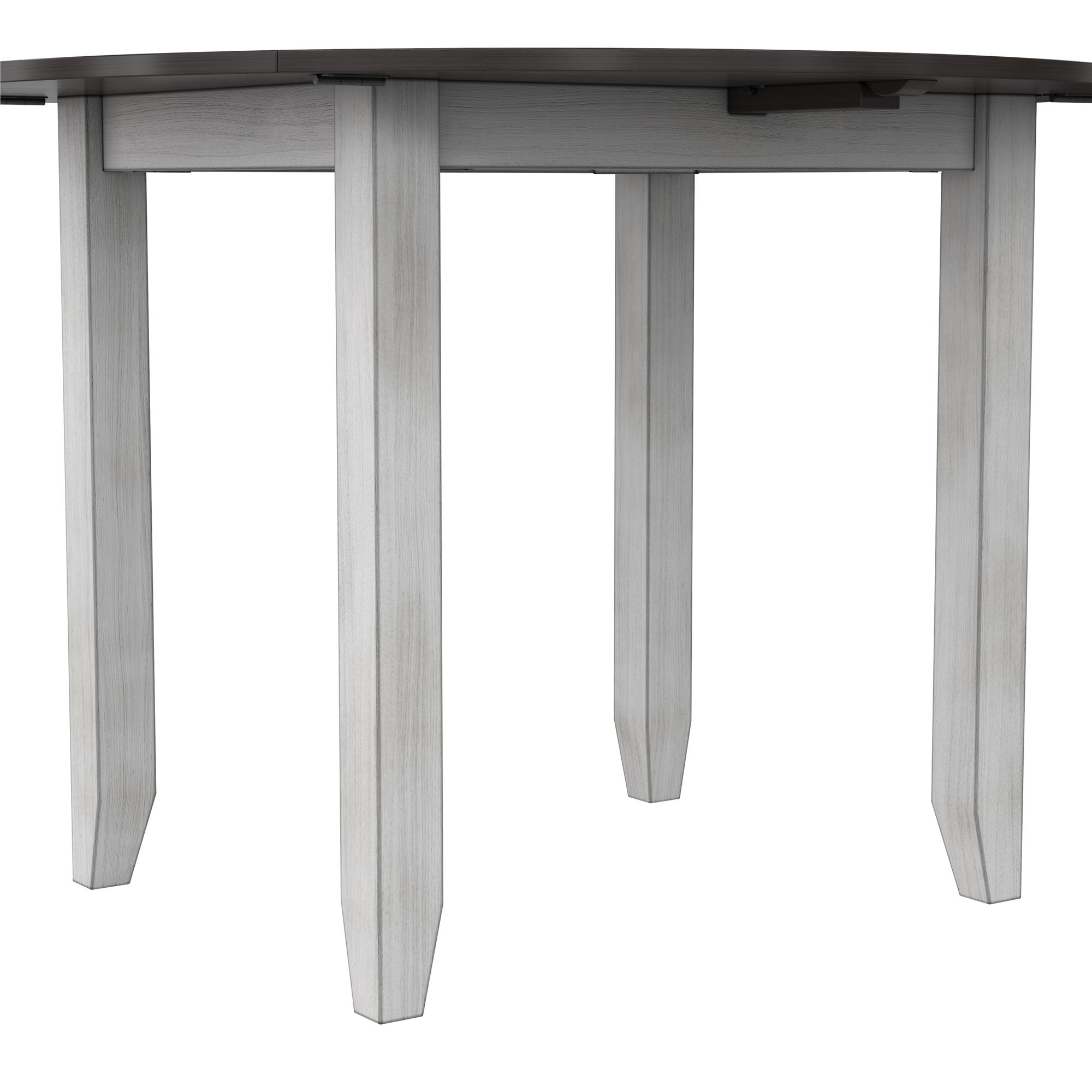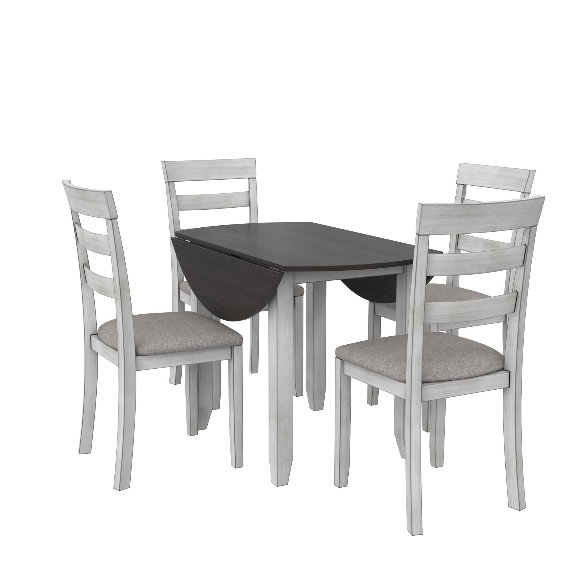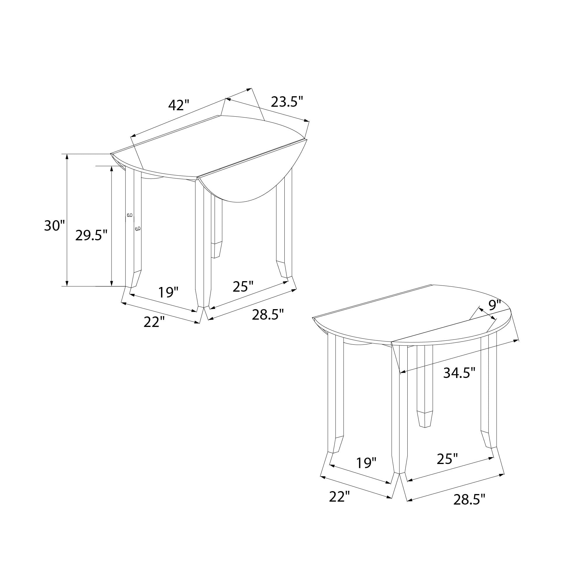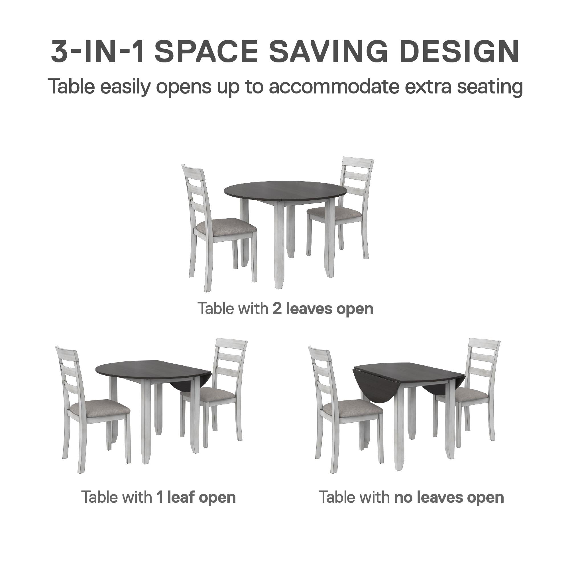 Grab a coffee and sit down, your 3PC kitchen table and dining chair set is here to provide a comfortable nook to eat, drink, and chat with 1 round table that features a hinged double drop leaf and 2 upholstered seat chairs made from solid wood The whitewashed chairs have fabric covered foam-padded seats with a strong solid wood build and the Acacia veneer grayish-brown tabletop covers a wide diameter with 2-sided drop-down extension leaves to make room for extra plates when guests drop by Durably built with a space conscious look, this set will fit in any small kitchen or dining room setting. Plus, plastic tack glides beneath the chair legs prevent scuff marks on your floors as you pull your chair in and out throughout the day Ships in one easy-to-handle box with all parts, tools, and instructions included for fast straightforward assembly in 30 minutes or less. Pick up the coordinating 2PC chair set to accommodate more friends and family for dinner (sold separately) Table dimensions: (Closed) 42″L x 22″W x 30″H. (Fully open drop leaves) 60″L x 22″W x 30″H. Weight limit: 75 lbs. Chair dimensions: 16.5″L x 16″W x 38″H. Weight limit: 250 lbs. Net weight: 74 lbs. 1-year limited warranty