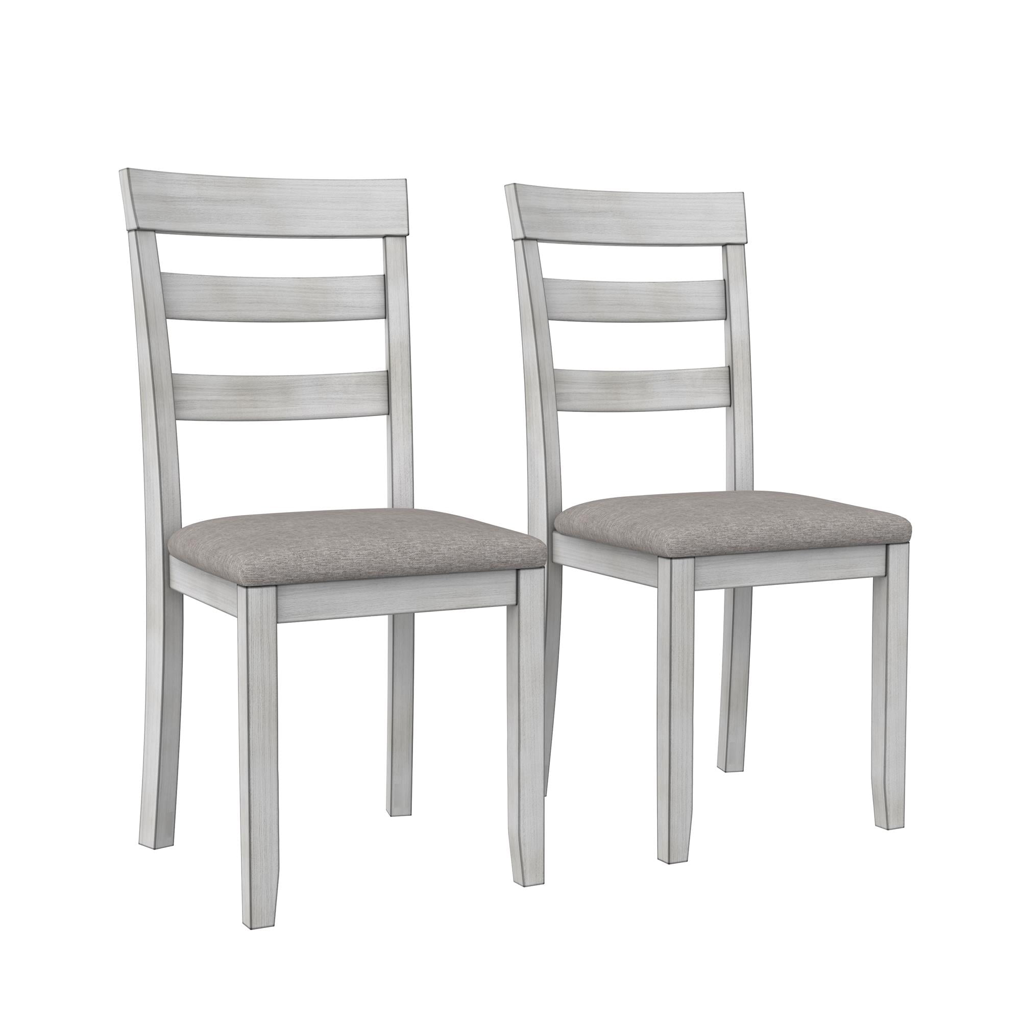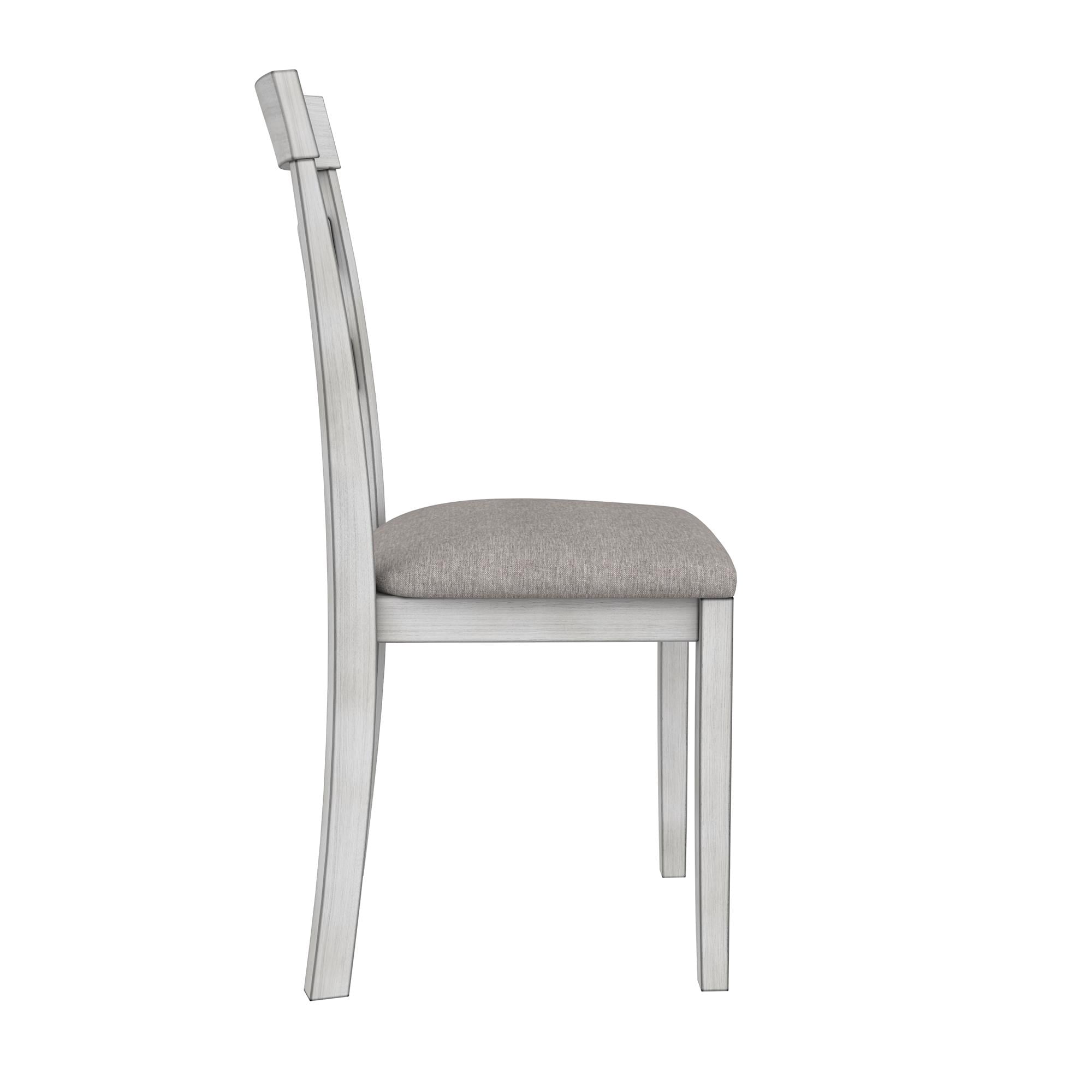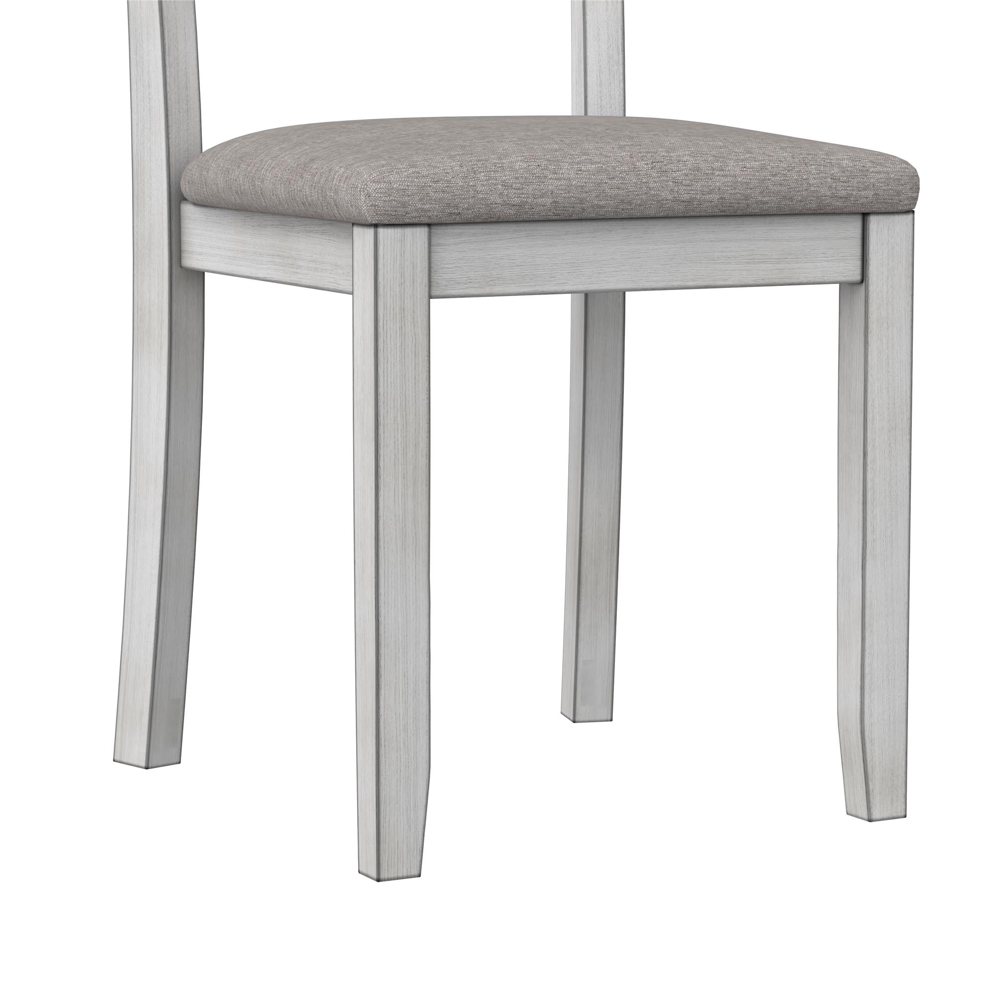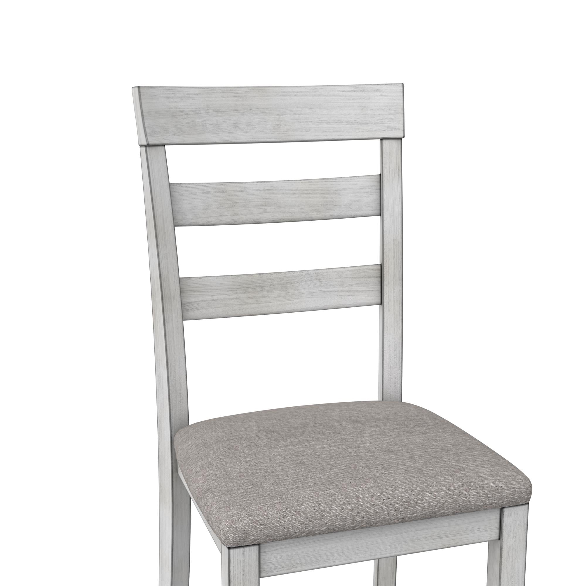 Grab a coffee and sit down, your 3PC kitchen table and dining chair set is here to provide a comfortable nook to eat, drink, and chat with 1 round table that features a hinged double drop leaf and 2 upholstered seat chairs made from solid wood The whitewashed chairs have fabric covered foam-padded seats with a strong solid wood build and the Acacia veneer grayish-brown tabletop covers a wide diameter with 2-sided drop-down extension leaves to make room for extra plates when guests drop by Durably built with a space conscious look, this set will fit in any small kitchen or dining room setting. Plus, plastic tack glides beneath the chair legs prevent scuff marks on your floors as you pull your chair in and out throughout the day Ships in one easy-to-handle box with all parts, tools, and instructions included for fast straightforward assembly in 30 minutes or less. Pick up the coordinating 2PC chair set to accommodate more friends and family for dinner (sold separately) Table dimensions: (Closed) 42″L x 22″W x 30″H. (Fully open drop leaves) 60″L x 22″W x 30″H. Weight limit: 75 lbs. Chair dimensions: 16.5″L x 16″W x 38″H. Weight limit: 250 lbs. Net weight: 74 lbs. 1-year limited warranty
