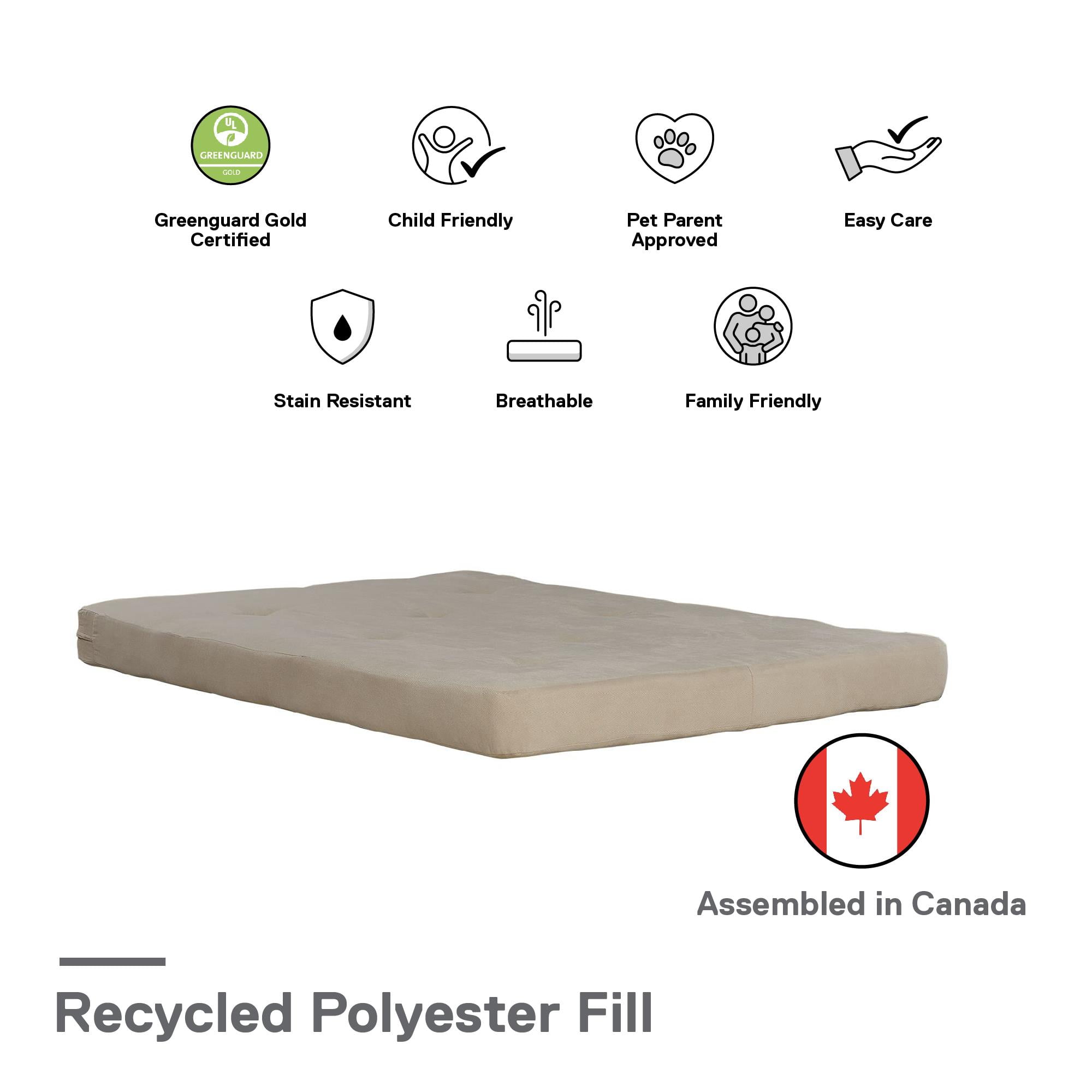 Camping inside in the comfort of your own living room certainly has its perks and no doubt the DHP Kali 6″ Thermobonded High Density Polyester Fill Futon Mattress will give your kids a cozy surface for imaginative play or sleepover fun. With its easy foldability, the Kali can be mounted on a full-size futon frame (sold separately) for sitting and sleeping adjustability or flopped on the ground to deliver a clever floor mattress for teens and overnight guests. And due to its pliable nature, it can be folded away for organized closet storage when not being used. Tufting on the microfiber cover helps prevent the loss of mattress shape, while the soft and easy-to-clean fabrication offers children and pets a carefree foundation for rest without parents having to worry about stains or spills. Lightweight and portable, you’ll quickly be able to move it around your home, from a spare room or basement den to a child’s playroom or home office where it’s needed. Assembled in Canada with eco-friendly 50% recycled polyester fibers, the Eve has passed strict indoor air quality testing to be a healthy decor accessory. Several color and thickness options are available.