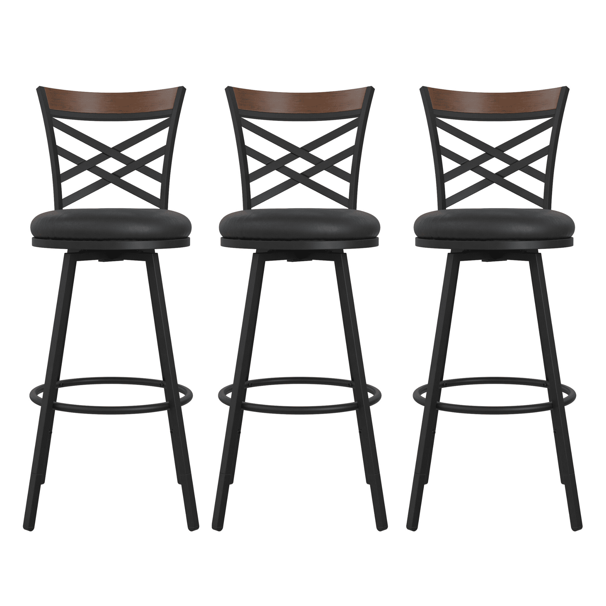 Tall back bar stools with faux leather upholstered cushion seating to bring a vintage touch to your modern home. Back features a metal panel with faux wooden finish at the top border. Barstools swivel and have a manually adjustable seat height of 24 inches (counter height) or 29 inches (bar height) to provide you flexible seating options. Ideal furniture for your kitchen island or bar counter. Stool features black powder coated metal legs with footrest. Ships in one box and assembles easily. Comes in a set of three. 1-year limited warranty.
