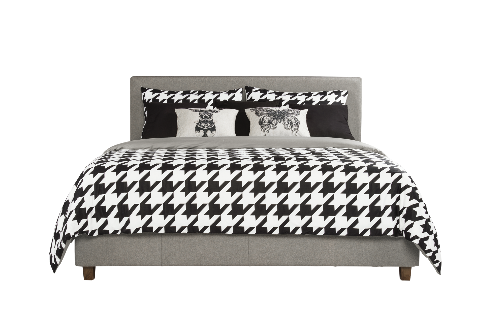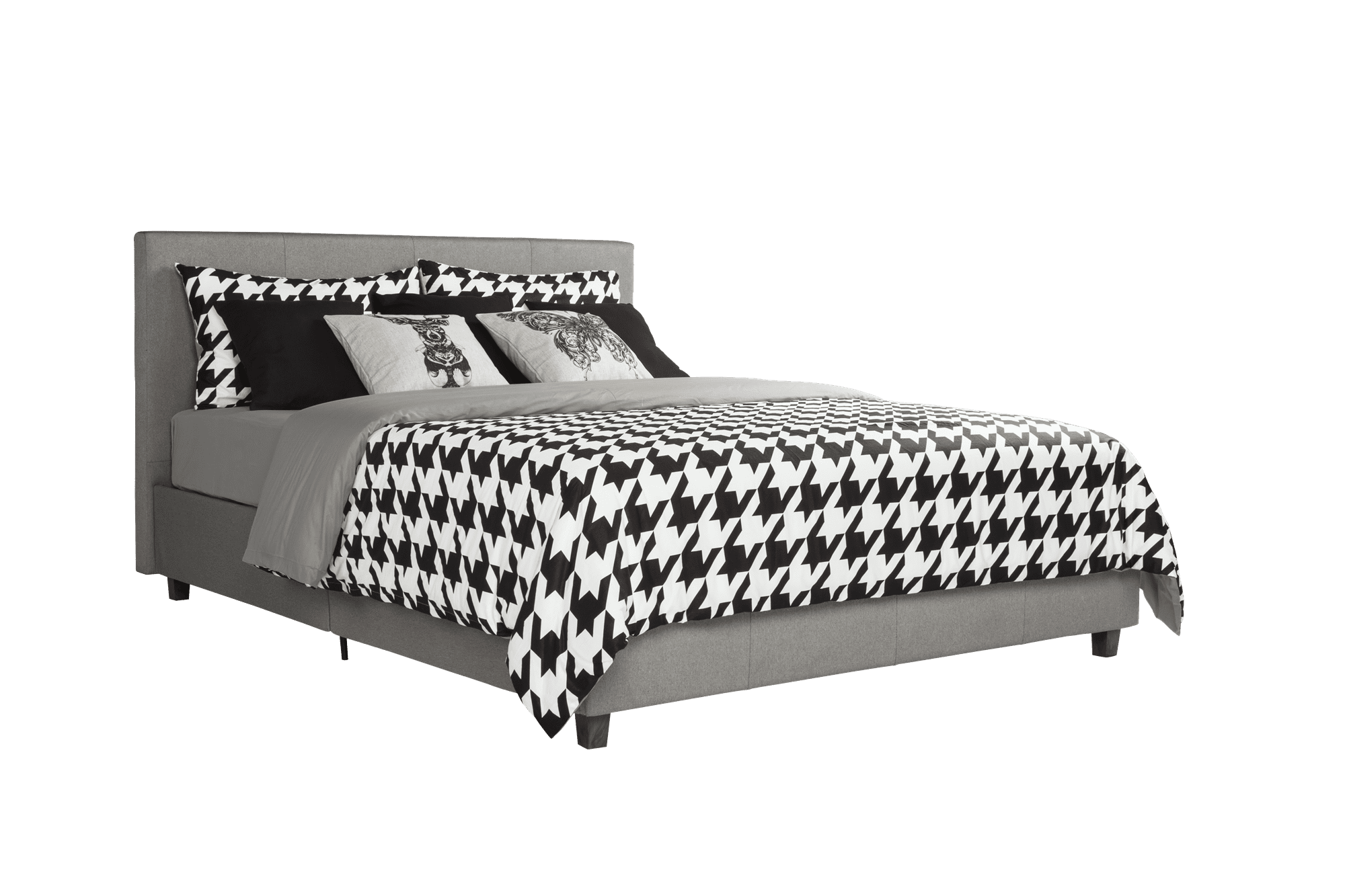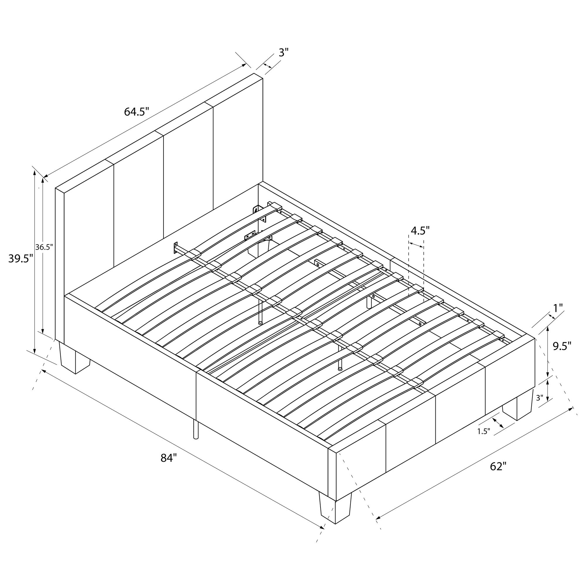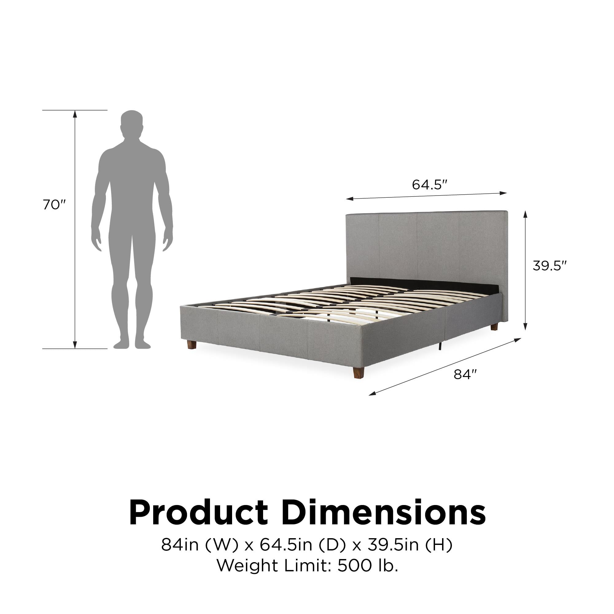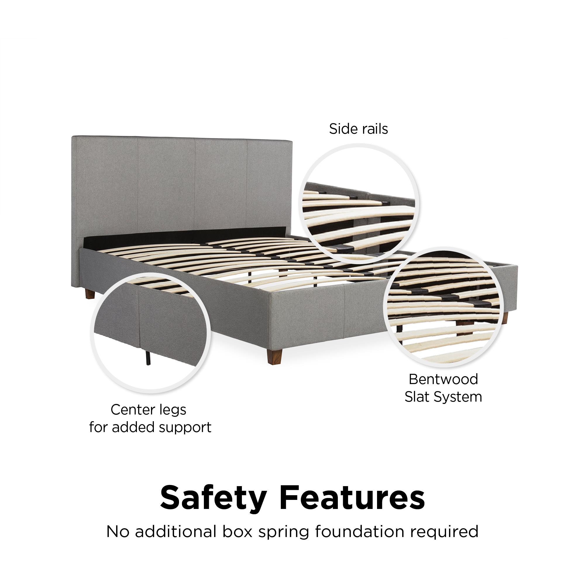 Contemporary style Upholstered in premium gray linen with unique column detailing on the headboard and footboard Available in black and brown faux leather, and grey linen Bentwood Slat bases allow air to freely pass beneath your bed, keeping your mattress fresher longer The Bentwood Slats adapt to weight exerted to them, provided you with the right amount of support Four wooden legs plus an additional four metal legs and center metal rail for added support Includes 24 Wooden Slats to provide support and comfort Surface wipes clean with a damp cloth Available in twin, full or queen size Easy assembly Does not require a box spring or additional foundation. Weight limit 500lbs