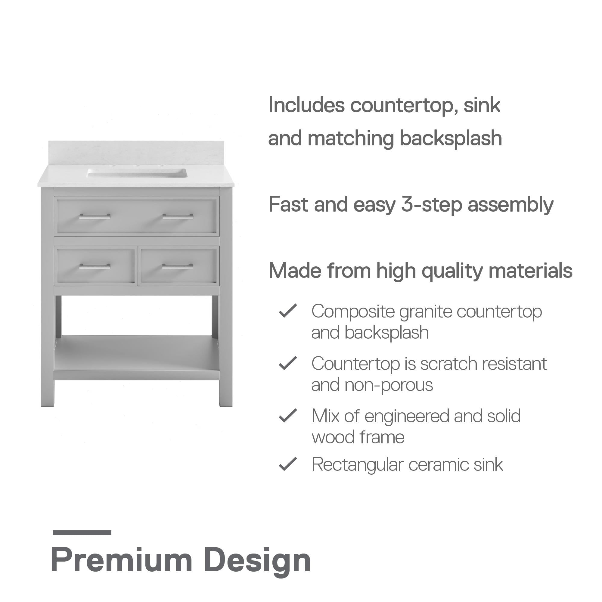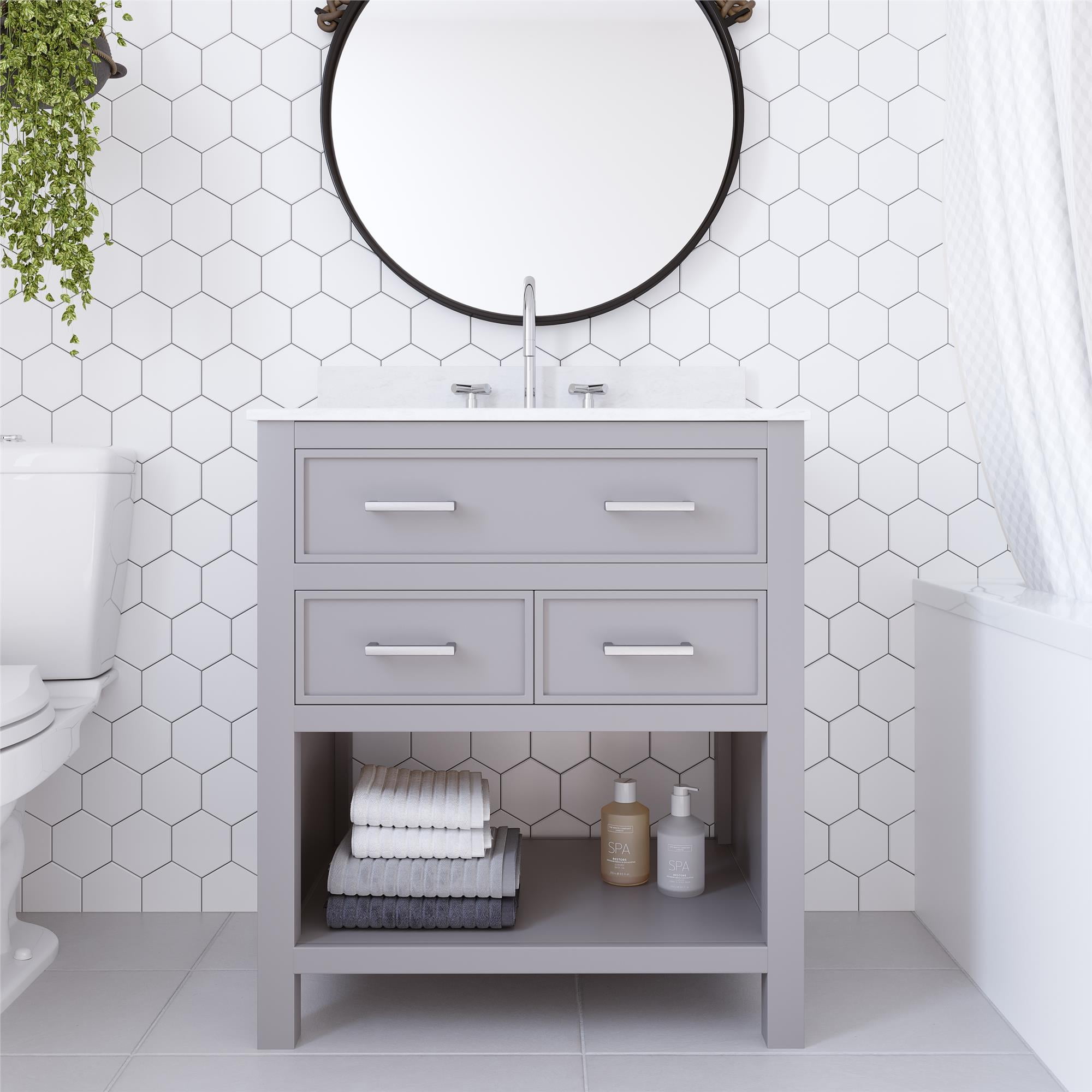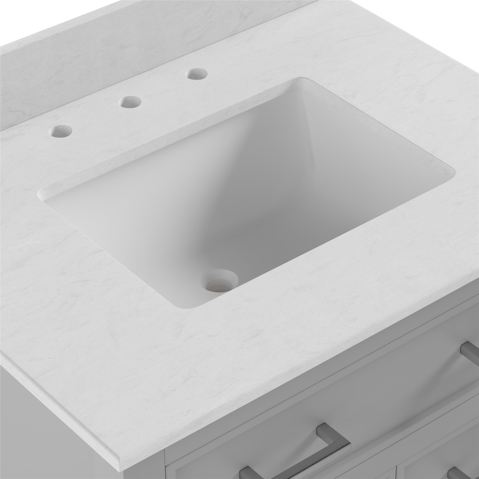 DHP Maine 30 Inch Bathroom Vanity with Carrera Countertop and Rectangular Ceramic Sink, Gray/Silver