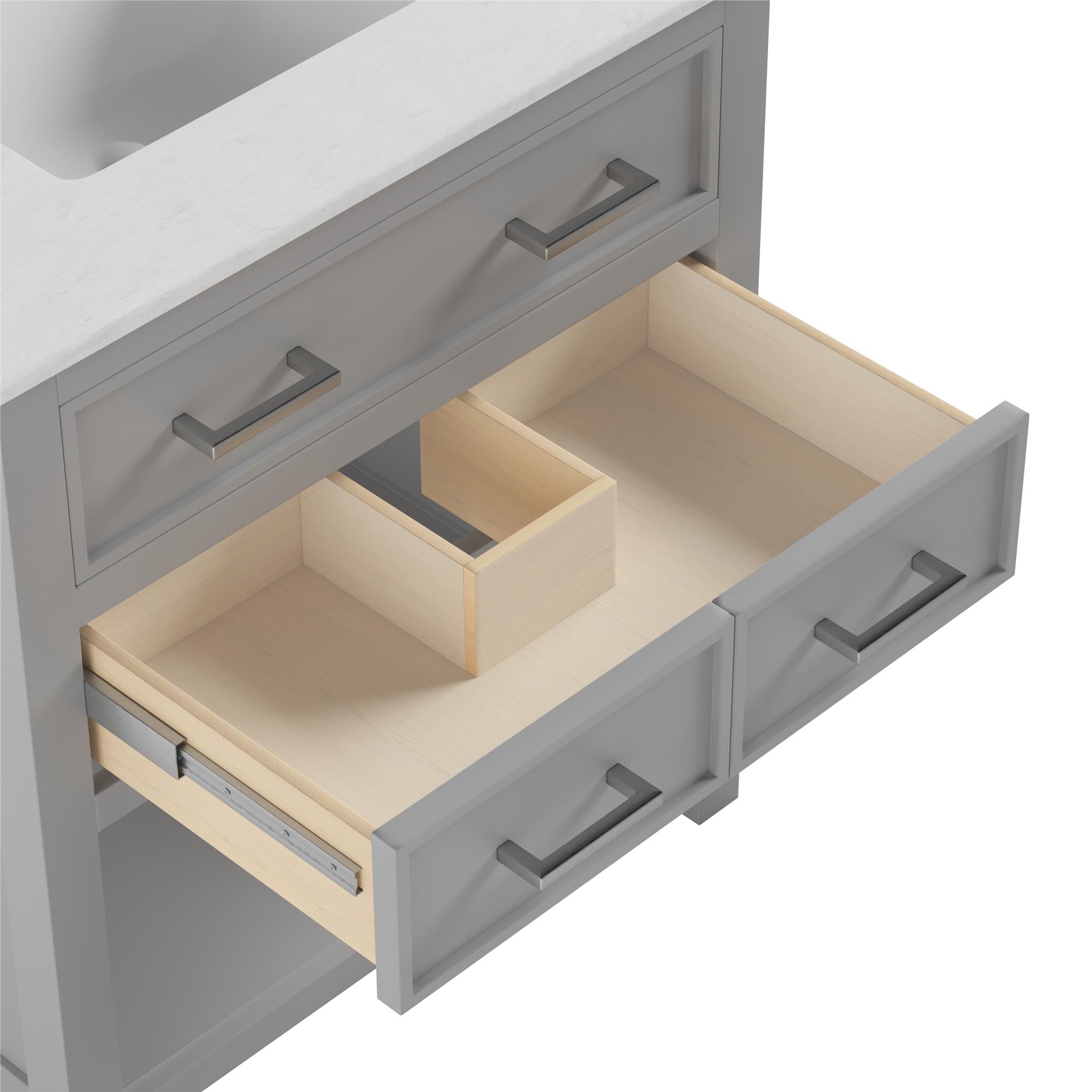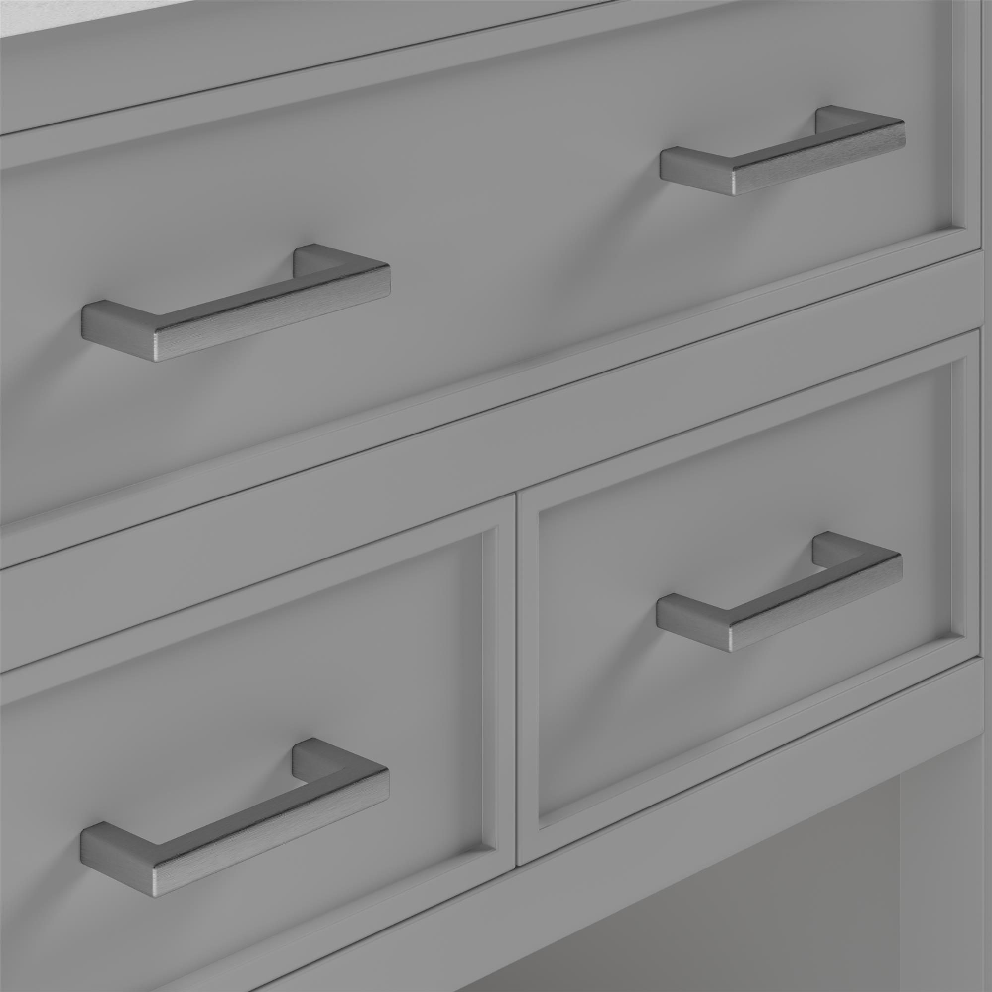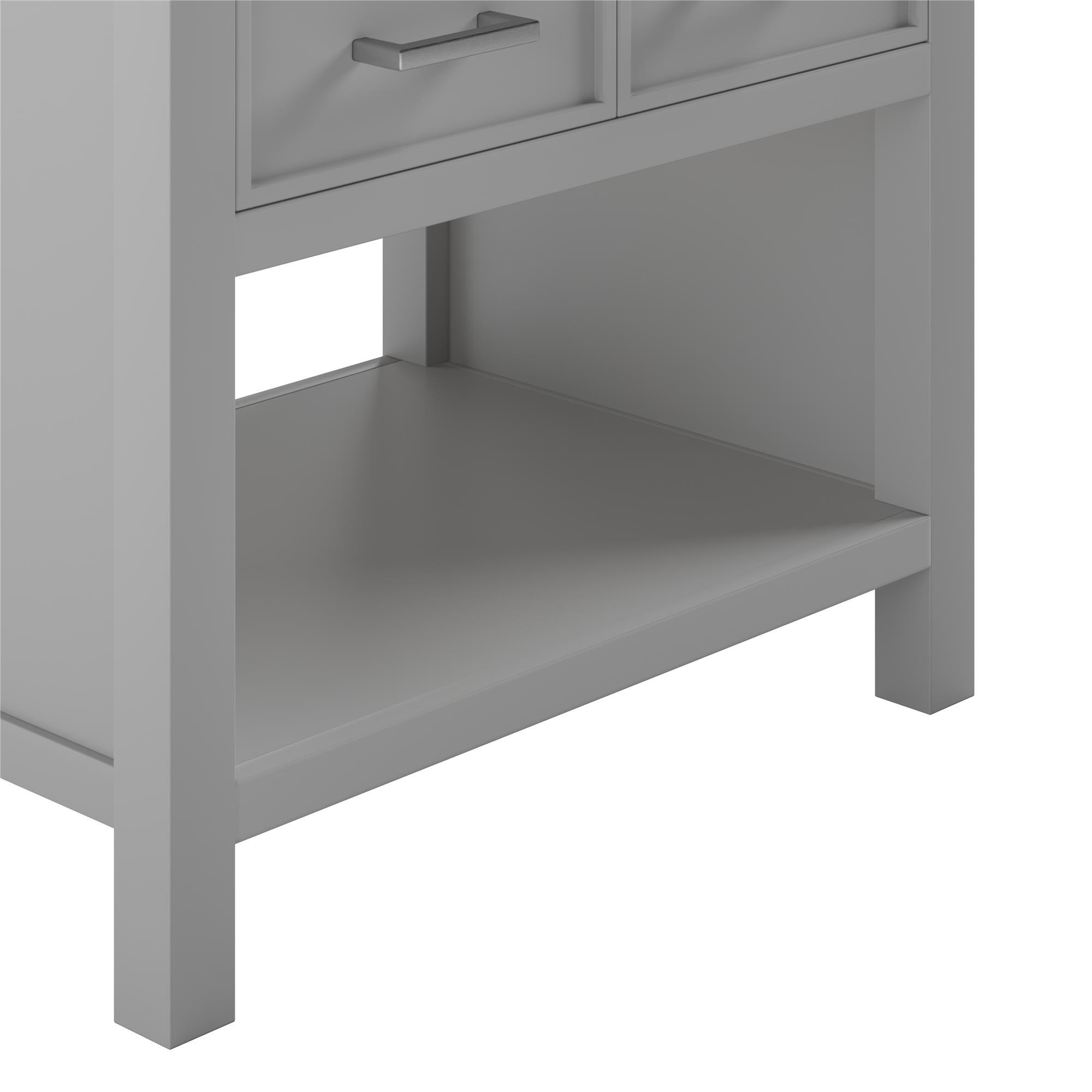 Whether you’re a lover of east coast or west coast style, it doesn’t matter with the DHP Maine bathroom vanity. Able to traverse each side of the decor spectrum, this transitional-styled must-have can take your bathroom to a whole another level. Quality made with the use of solid and engineered wood, this durable accessory will quickly change the look of your space without a hefty investment and give you needed storage in the form of a 2-compartment drawer and an open shelf. Constructed with a sleek built-in rectangular ceramic sink, its modern composite Carrera engineered stone countertop will leave you in awe while the countertop’s inherent non-porous, easy-clean, and scratch-resistant properties will simultaneously make day-to-day life easier. Pre-drilled holes also allow for the easy installation of an 8″ widespread faucet (not included). Comes in either 24″, 30″, or 36″ size to meet individual needs with numerous paint finish and metal hardware color combinations available. (Faux drawer also included as a design feature).