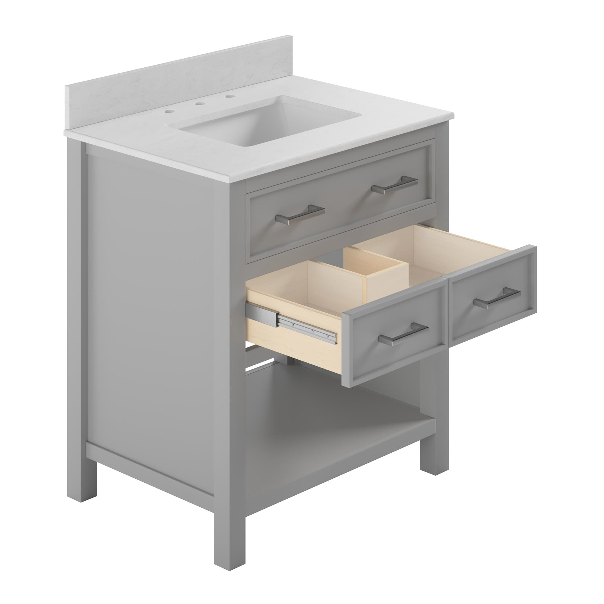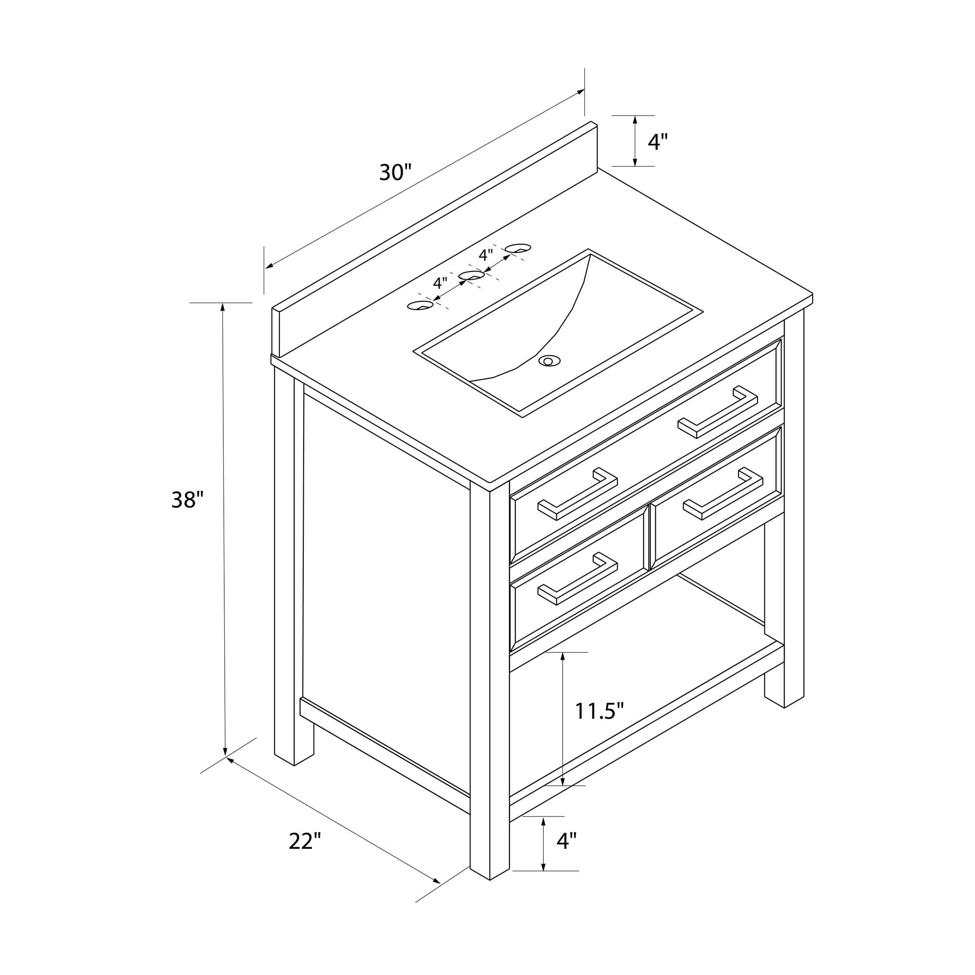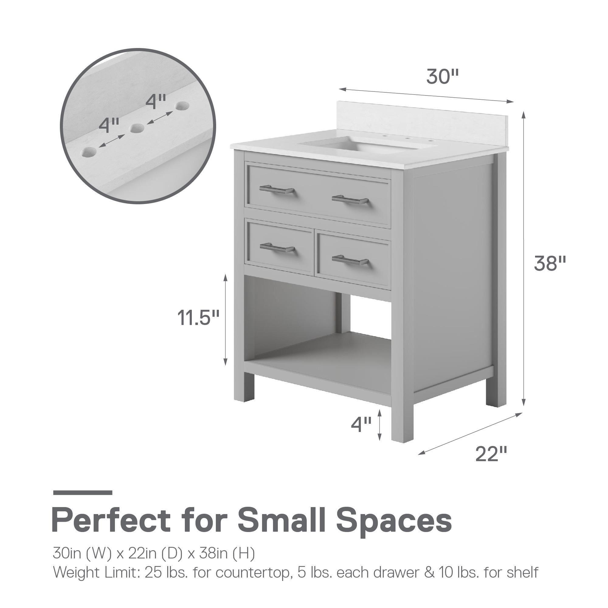 QUALITY CRAFTED: Streamlined bathroom vanity conveys savvy transitional style. Made using solid and engineered wood for durability and long-term usage with a lasting paint finish available in several classic shades STORAGE FUNCTION: The bottom drawer includes 2 side compartments for storing toiletries and an open shelf provides additional space for other essentials. A top faux (dummy) drawer is included as a clever design element. Drawer fronts display refined molded detailing MODERN COUNTERTOP AND SINK: The composite Carrera engineered stone countertop provides a scratch-resistant, quickly cleanable, and non-porous high-end surface for placing soap dishes, lotion dispensers, and toothpaste holders while the integrated rectangular ceramic sink rounds off the contemporary look SLEEK FINISHES AND HARDWARE: The included metal handles deliver harmonious contrast. And the attractive backsplash adds a stylish touch. Comes pre-drilled with 3 holes positioned for the installation of an 8″ widespread faucet (faucet and drain sold separately) while an open back enables swift access to plumbing. Offered in 24″, 30″, and 36″ sizes to meet the needs of any sized bathroom EASY ASSEMBLY: Conveniently arrives pre-assembled with only the backsplash needing to be attached. Vanity dimensions: 30″ L x 22″ W x 38″ H. Net weight: 103 lbs. Weight limit: Countertop: 25 lbs. Drawer: 10 lbs. (5 lbs. each compartment) Shelf: 10 lbs. Shipping dimensions: 33″ L x 24″ W x 39″ H. Gross weight: 124 lbs.