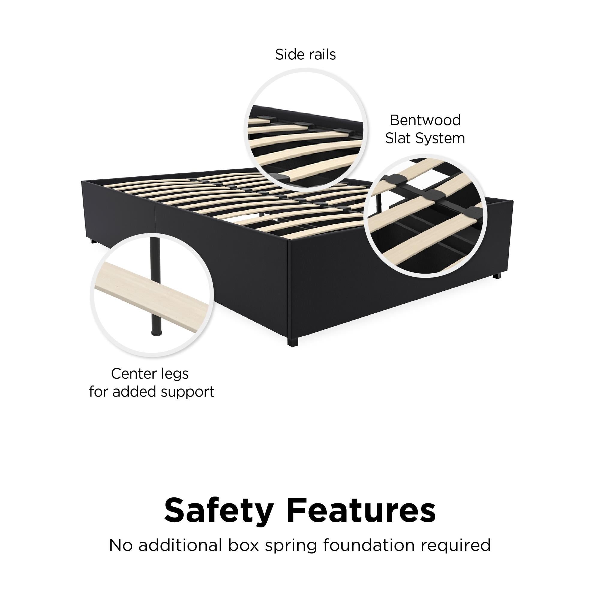 Who doesn’t like ample bedroom storage space–especially in an apartment or condo? When you lack the space you need to store away your favorite things, try the stylish Maven platform bed. Tucked away is one roll-out drawer for extra storage–perfect for keeping your bedding, extra pillows, seasonal clothes, books, and whatever you have no shelf space for. And the bed itself? It couldn’t be more comfortable. Not only does the bentwood slat system allow air to circulate freely around your mattress–keeping it fresher for longer–it also provides ample back support and pressure distribution. Plus the metal side and center rails and center leg add even more support. Which means a great night’s sleep and restful mornings–plus no box spring needed! Choose from black or white faux leather or grey linen to match your bedroom decor and set the tone for your room. Pleasant dreams!