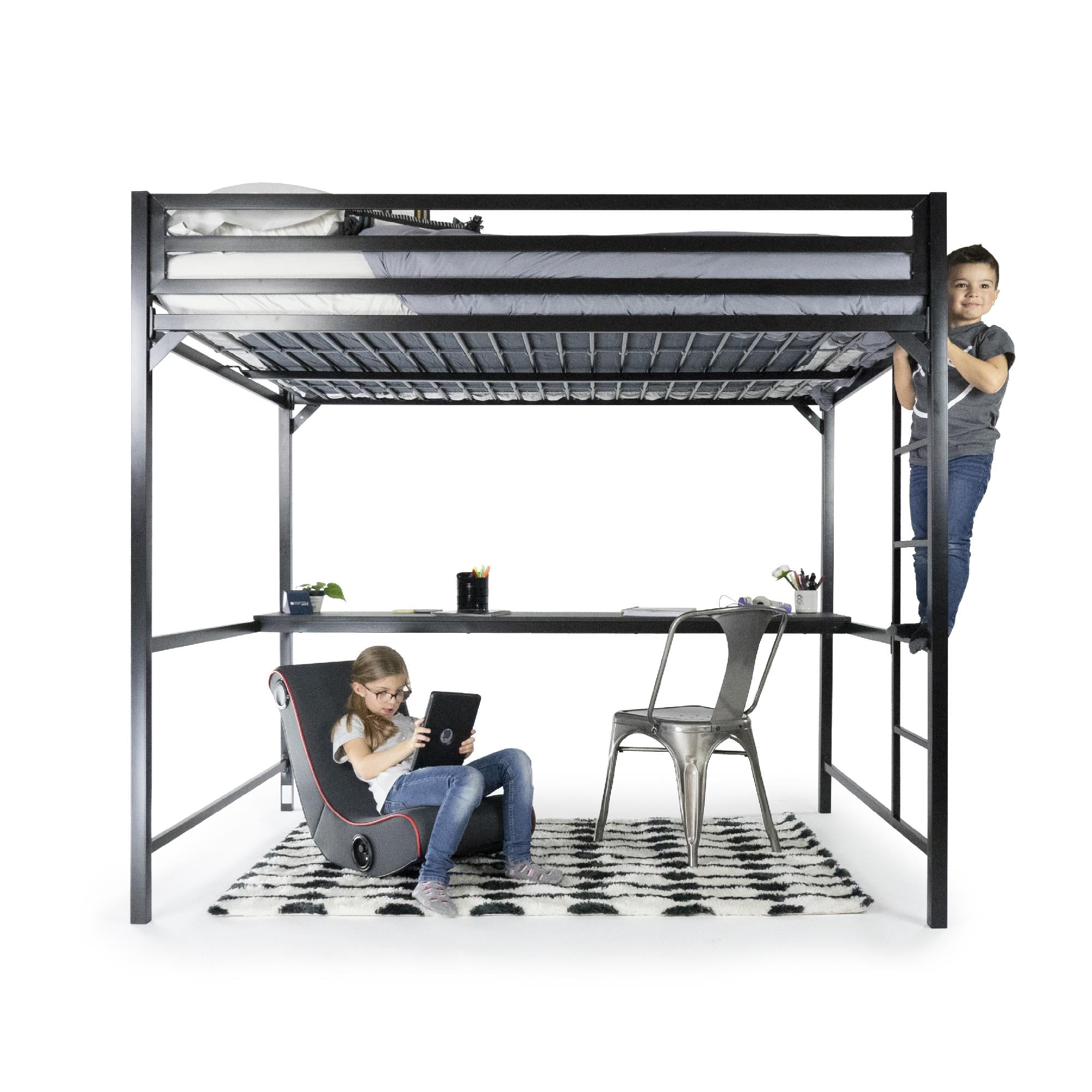 Durable and sturdy metal frame designed with a clean-cut silhouette in a modern industrial style. Space-saving solution. Includes a desk integrated to the frame and has 58″ of under-bed clearance. Upper bunk is equipped with secured metal slats that provide ample support and 14″ full-length guardrails for ultimate safety. Maximum mattress recommended height of 6″ (sold separately). Twin loft bed dimensions: 77.5″L x 41.5″W x 72″H. Upper bed weight limit: 200 lb. Desk weight limit: 50 lb. Must be aged 6 and above for top bunk use.