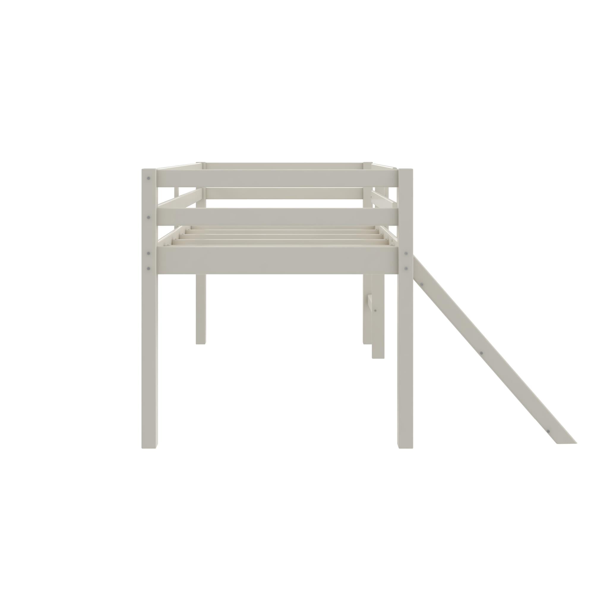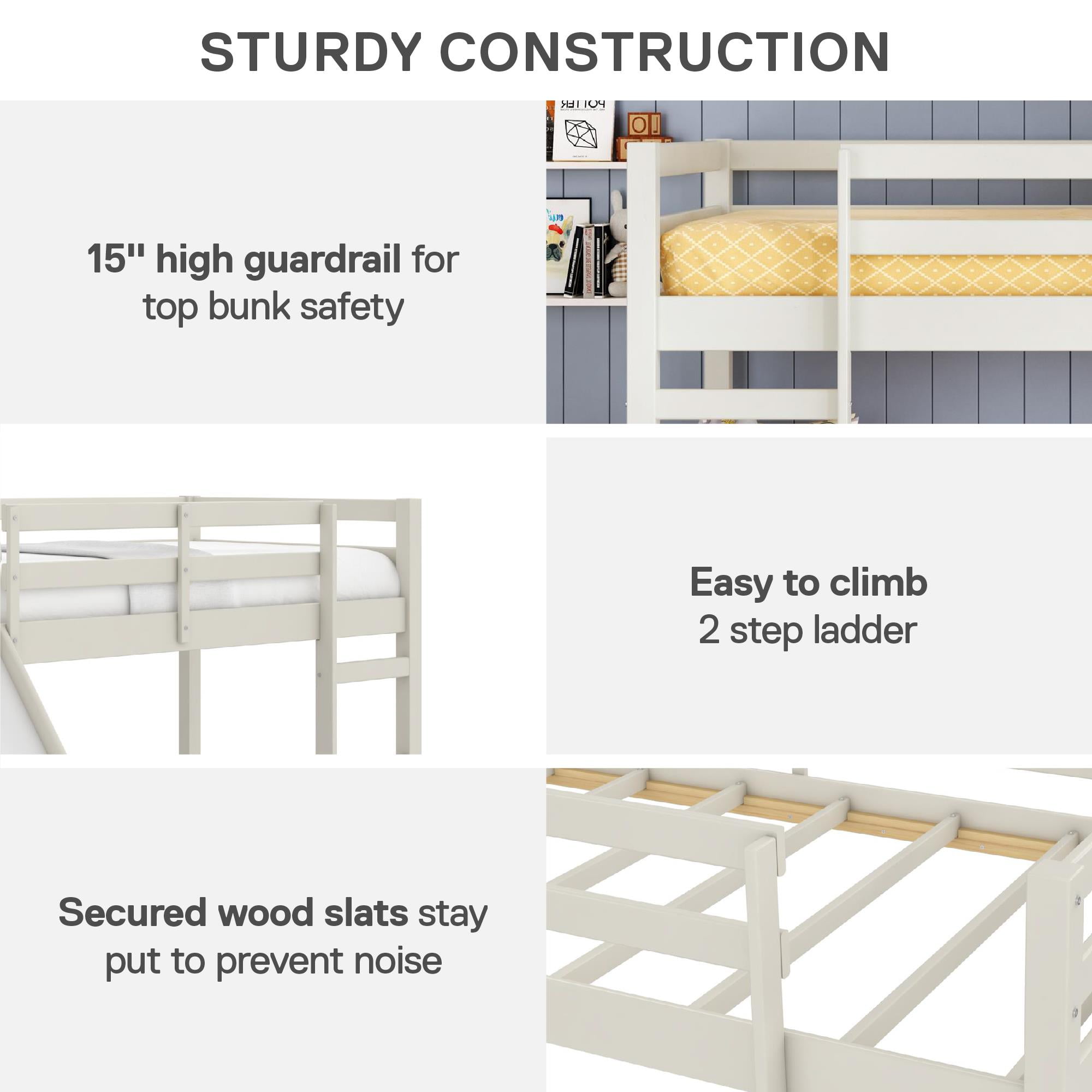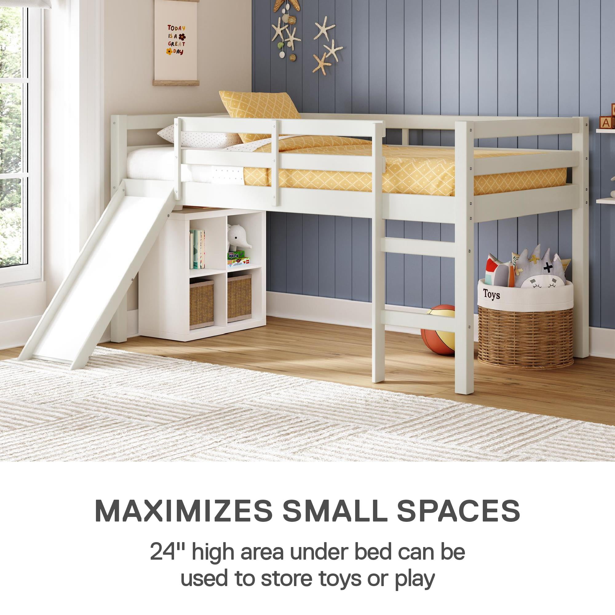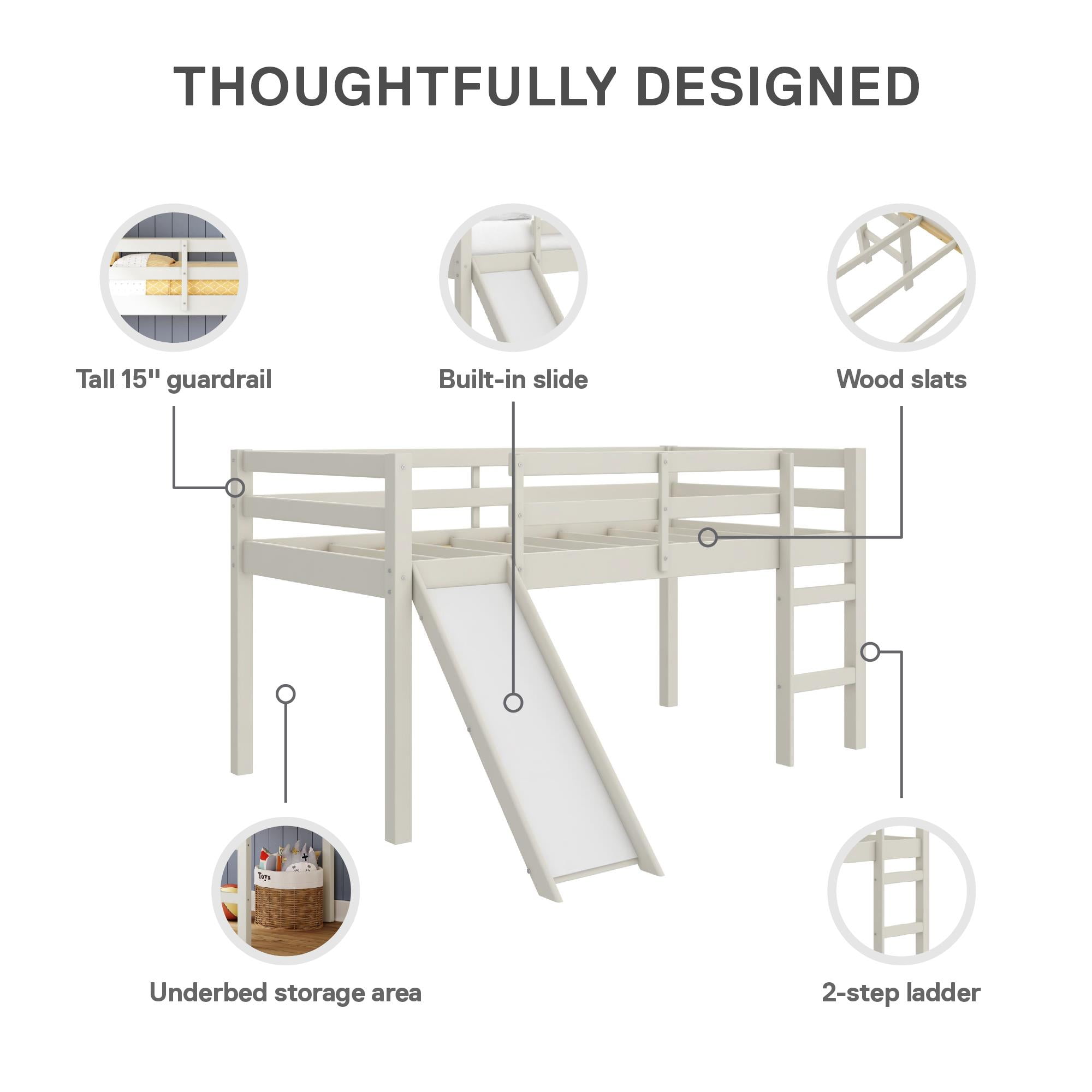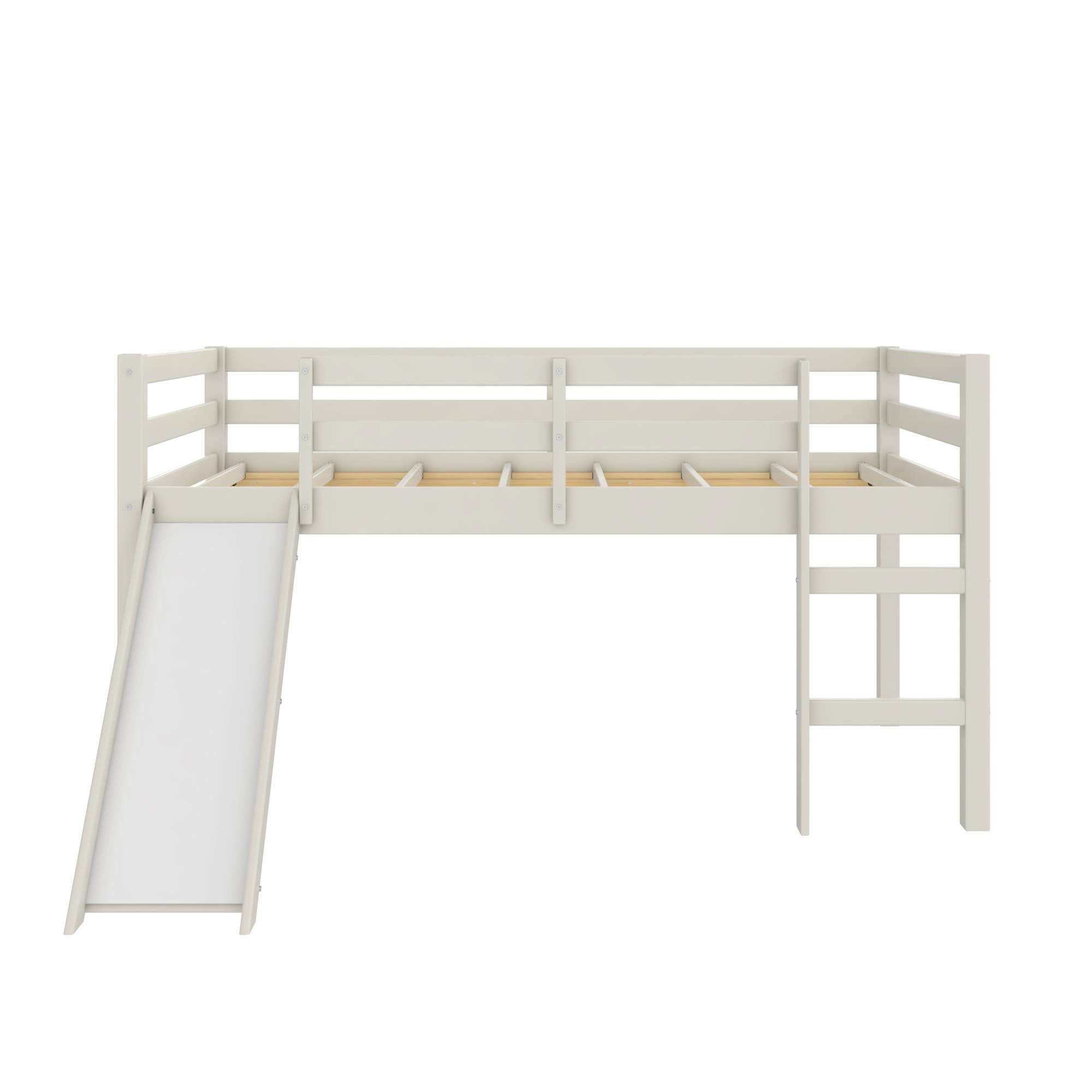 AMUSEMENT AWAITS: Redesign bedtime with this exciting junior loft bed with slide, perfect for young boys and girls who love a touch of playground fun in their kids’ room and parents who want a strong pine wood bed frame that safely supports up to 200 lbs. SAFE SLEEP: The extra-tall 15″ full length guardrails on the top bunk deliver a sense of security for your little ones and the built-in 2-step ladder is easy to climb, giving children a boost of independence and letting them enjoy their twin-size bunk bed SPACE SAVING FIX: At 78.5″L x 76″W x 43″H (with the 12.5″ wide engineered wood slide that holds up to 200 lbs.), our low-to-ground loft bed expands floor surface with a 24″ clearance for play or underbed storage, suiting smaller bedrooms with low ceilings STURDY STYLE FOR SMALL SPACES: The contemporary panel bunk bed with slide has a neutral paint finish and features 8 secured plywood slats that can reinforce a 6″ depth twin-size spring mattress (sold separately) without the need of a box spring foundation SIMPLE SETUP: All parts, tools. and easy-to-follow instructions are included in box for straightforward assembly. Benefit from a 1-year limited warranty against manufacturer defects. Not recommended for children under 6 years of age. Net weight: 72.5 lbs.