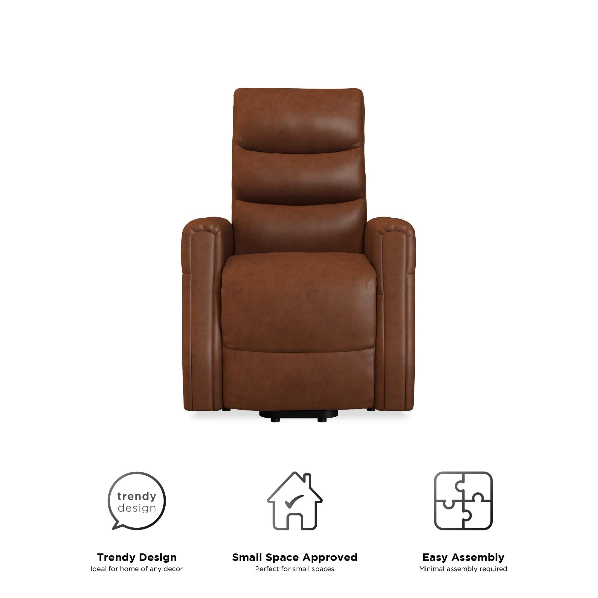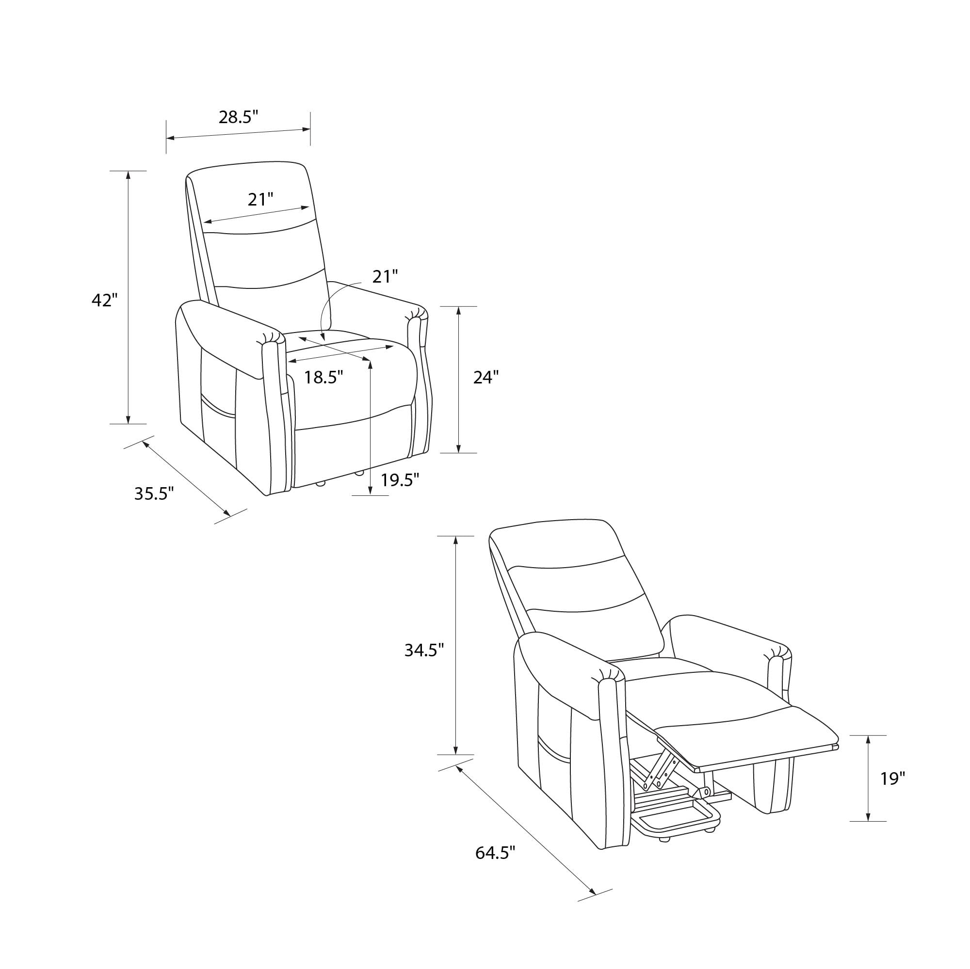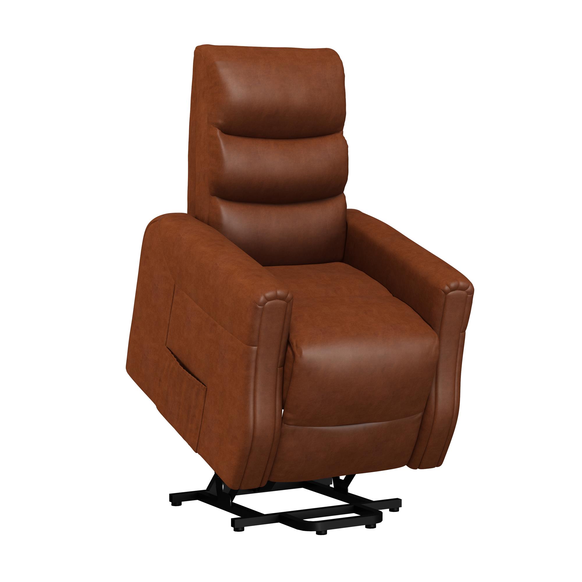 Modern recliner with plush backrest with horizontal tufting. Power lift mechanism and multi-recline function controlled by a conveniently stored user-friendly remote control and powered by a quiet engine. Includes side pockets for added storage. Perfect recliner chair to complete your home theater. Ships in one box. Quick and easy assembly required. 1-year limited warranty. Sitting dimensions: 35.5″L x 28.5″W x 42″H. Reclining dimensions: 64.5″L x 28.5″W x 34.5″H. Weight limit: 250 lbs. Net weight: 90 lbs. Shipping dimensions: 33″L x 30″W x 28″H. Gross weight: 101 lbs.