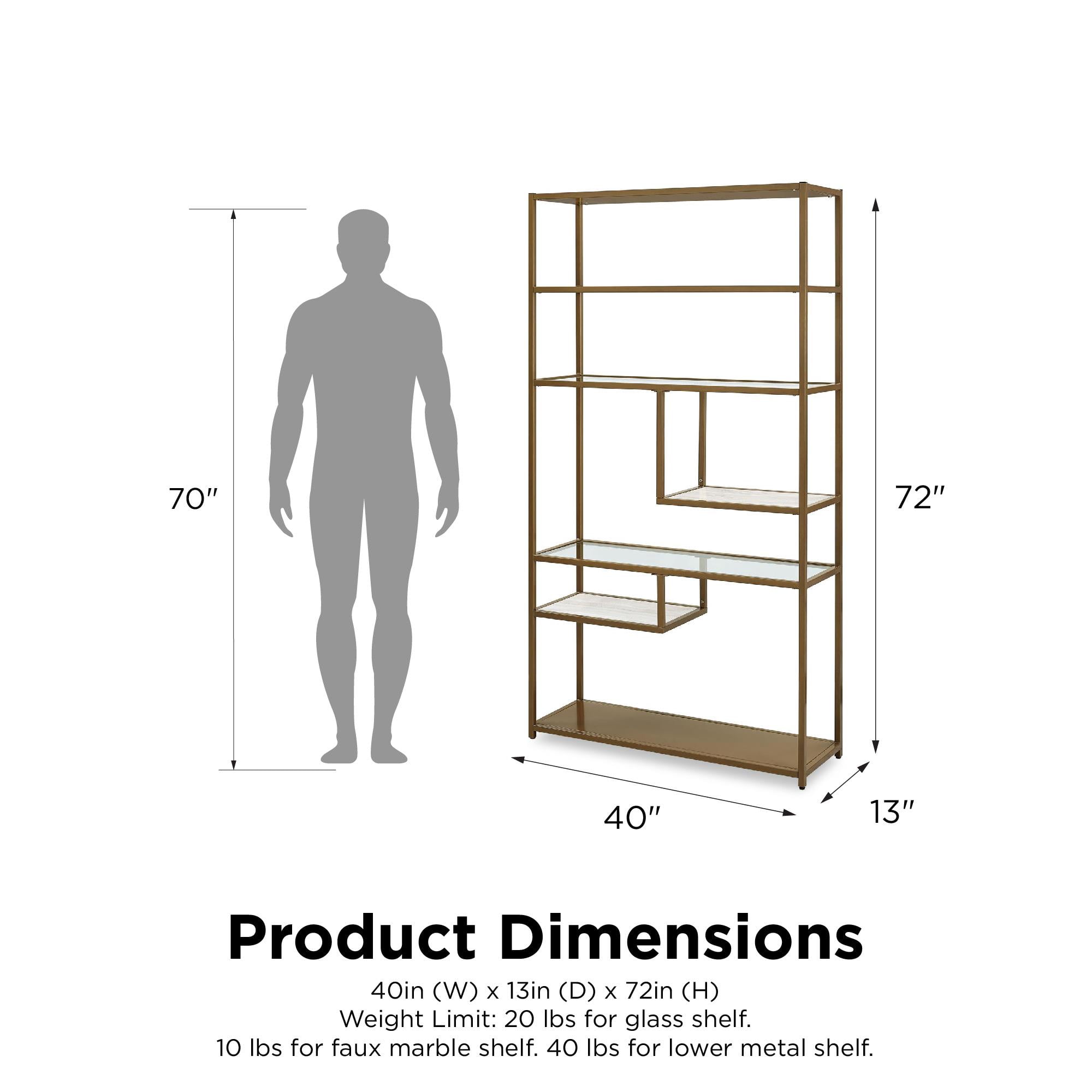 Modern bookcase etagere with geometric design. Perfect addition to your living room, bedroom or home office. This bookcase has plenty of storage space to keep all your office essentials such as your laptop computer, files, writing supplies, etc… Durable and stylish tubular metal design with a warm brass finish. Includes 3 tempered glass shelves, 2 faux marble shelves and 1 lower metal shelf. Great for small space living. Ships in one box. Assembly required, hardware included. 1-year limited warranty. Safety wall strap included. Product dimensions: 40″L x 13″W x 72″H. Weight limit: 20 lbs for glass shelf. 10 lbs for faux marble shelf. 40 lbs for lower metal shelf. Net weight: 71.94 lbs. Shipping dimensions: 82.25″L x 17.25″W x 6″H. Gross weight: 82.72 lbs.