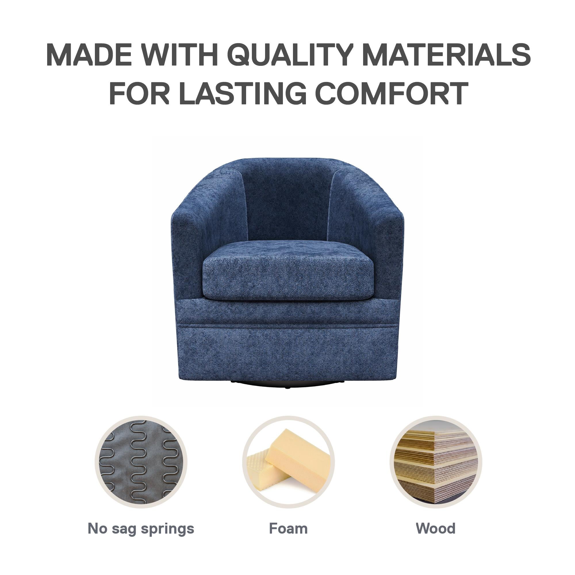 Armchair Flair: Our upholstered swivel accent chair with arms reveals a stylish silhouette with a curved back, rounded shape, and downward sloping armrests, perfect for adding modern chair sophistication to living rooms, bedrooms, and offices of any size Enjoyable Seating: Our small accent chair for living room leisure includes smooth textured upholstery fabric and a plush foam cushioned seat for relaxed moments of ergonomic sitting, complementing various interior styles and ensuring contemporary comfort Fluid 360-Degree Motion: The 360-degree swivel capability makes our barrel chair a space-saving choice for small space apartments, offering you compact seating and allowing you seamless front to back and side to side movement to catch every conversation Care to Detail: Featuring a removable seat cushion and an easy to spot clean material for low upkeep, our lounge chair has a robust metal base, wooden frame, and steel spring foundation for sturdy support, delivering continuous durability and practicality