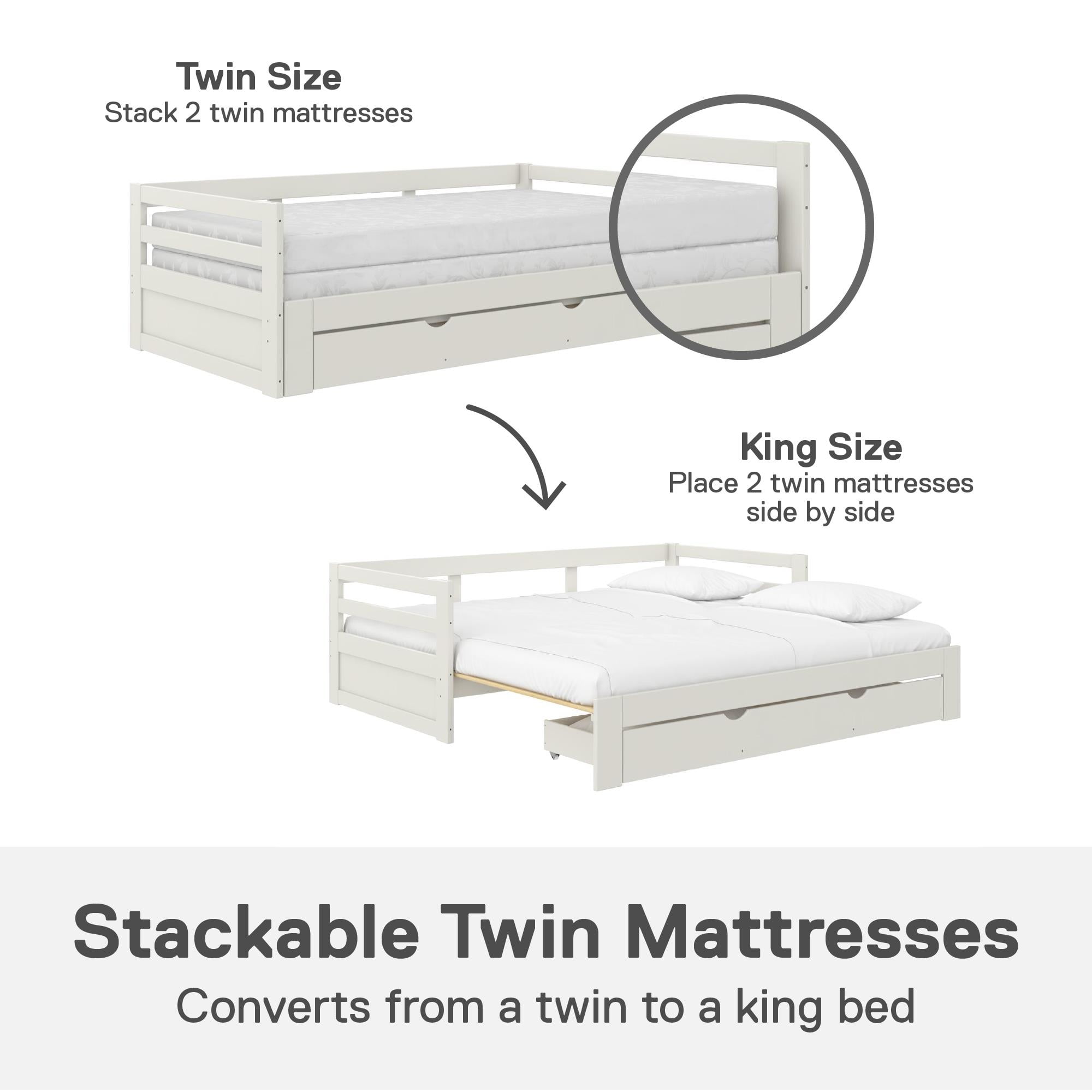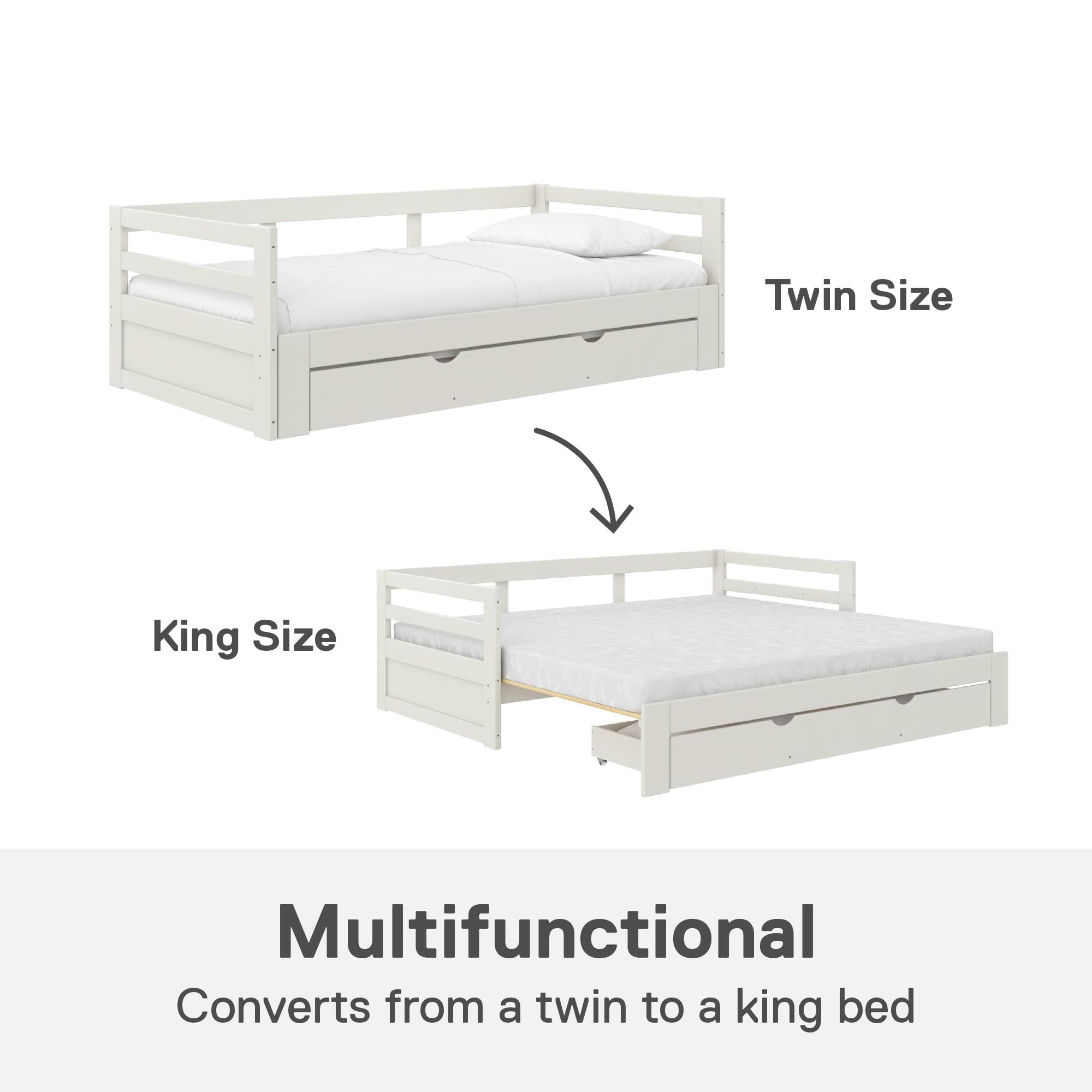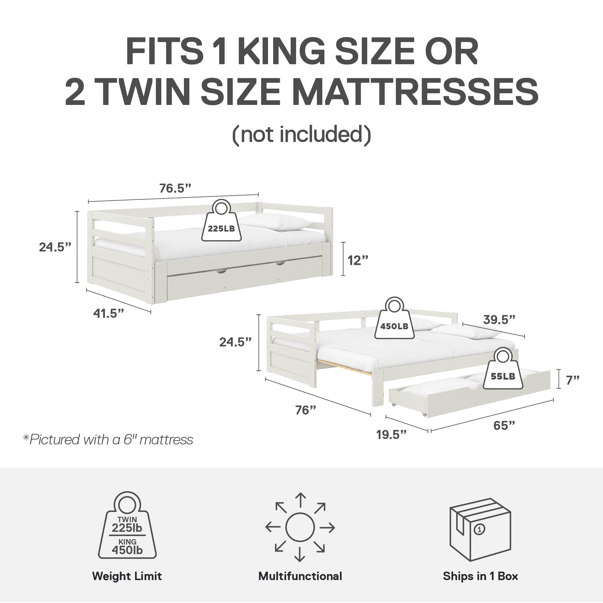 TRENDY TRANSFORMATION: The adaptable twin to king trundle bed effortlessly shifts from a relaxed twin daybed sofa (76.5″L x 41.5″D x 24.5″H) to a spacious king platform bed frame (76.5″L x 76″D x 24.5″H), perfect for a small bedroom, guestroom, or cottage POSITIVELY PINE: The sturdy solid wood build of our painted daybed with trundle bed easily holds up to 225 lbs. or 450 lbs. moving from the twin to king size bed option, giving comfort in the living room and beyond when used as either a couch or guest bed INTEGRATED STORAGE: Improve your organization skills with the convenient pull-out storage drawer on caster wheels (65″L x 19.5″W x 7″H) found under the bed, ideal for storing up to 55 lbs. worth of extra bedding or essentials for space-saving satisfaction NO BOX SPRING REQUIRED: Our multifunctional daybed and twin bed that converts to king layout comes equipped with durable MDF slats, eliminating the need for a foundation, and providing a reinforced surface for your 2 twin size mattresses (sold separately)