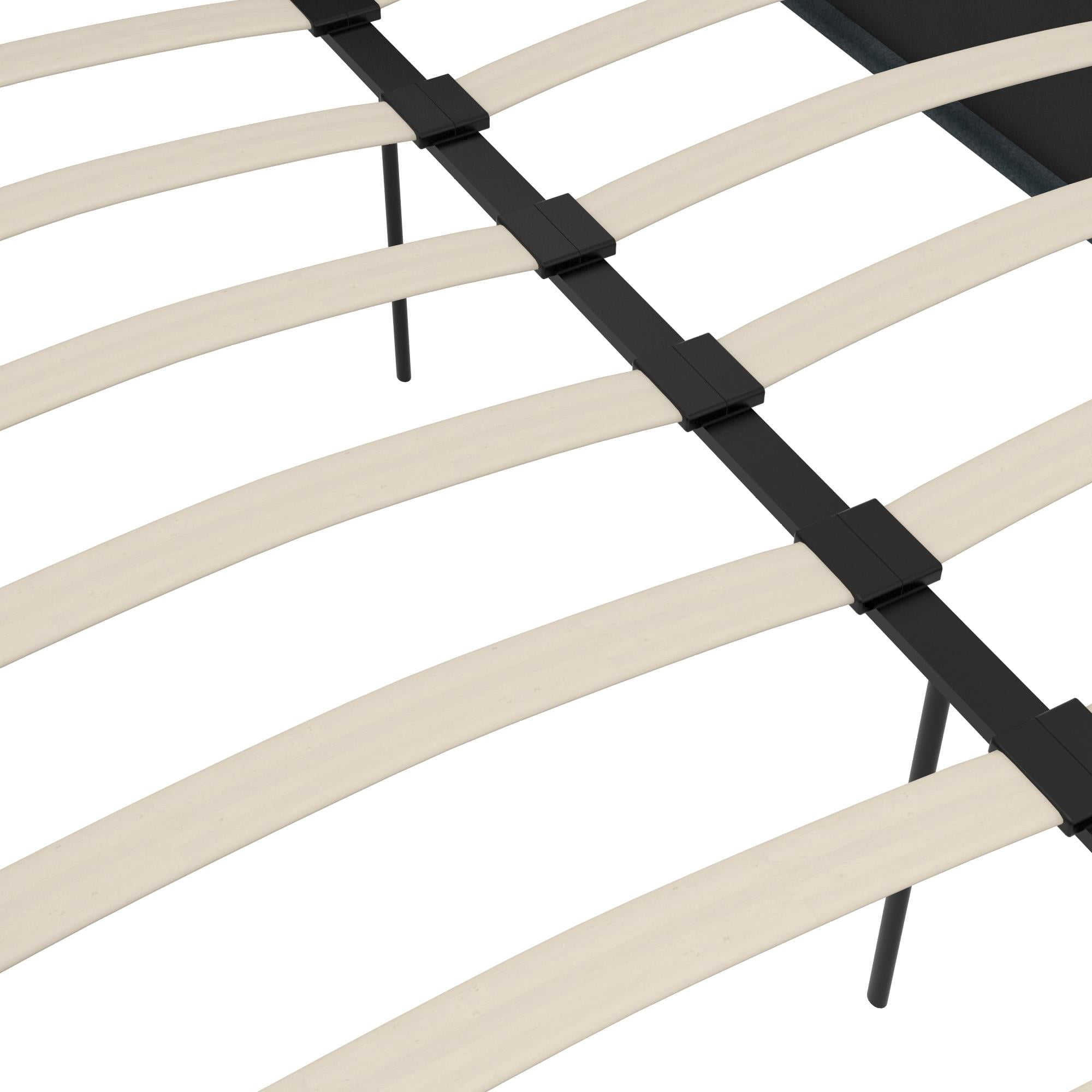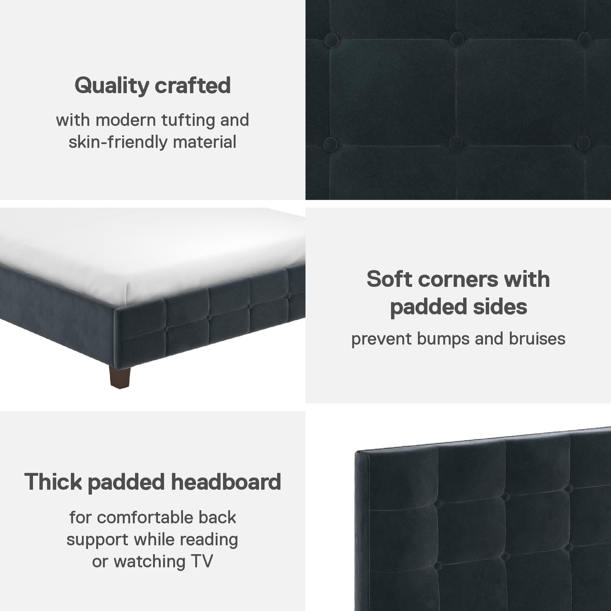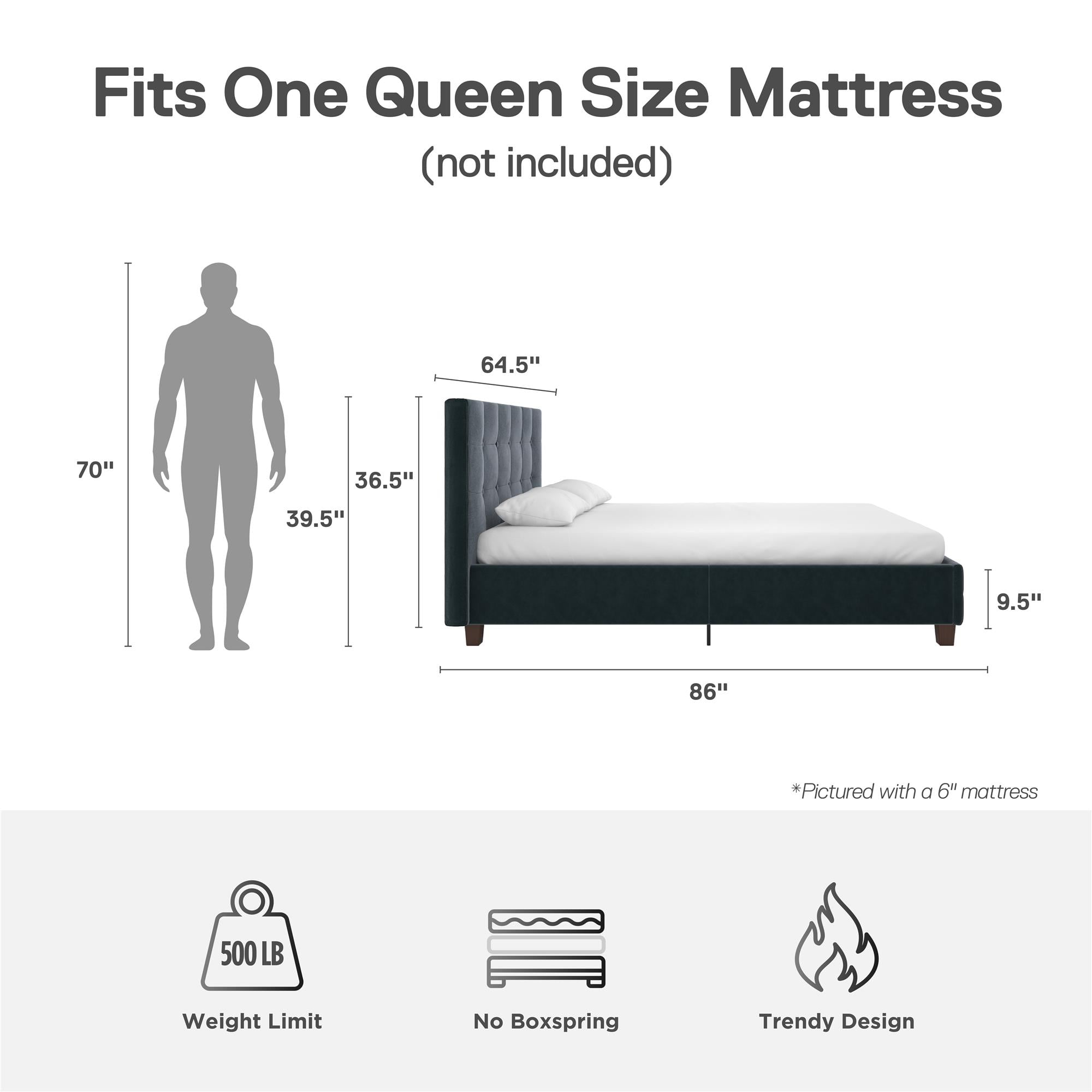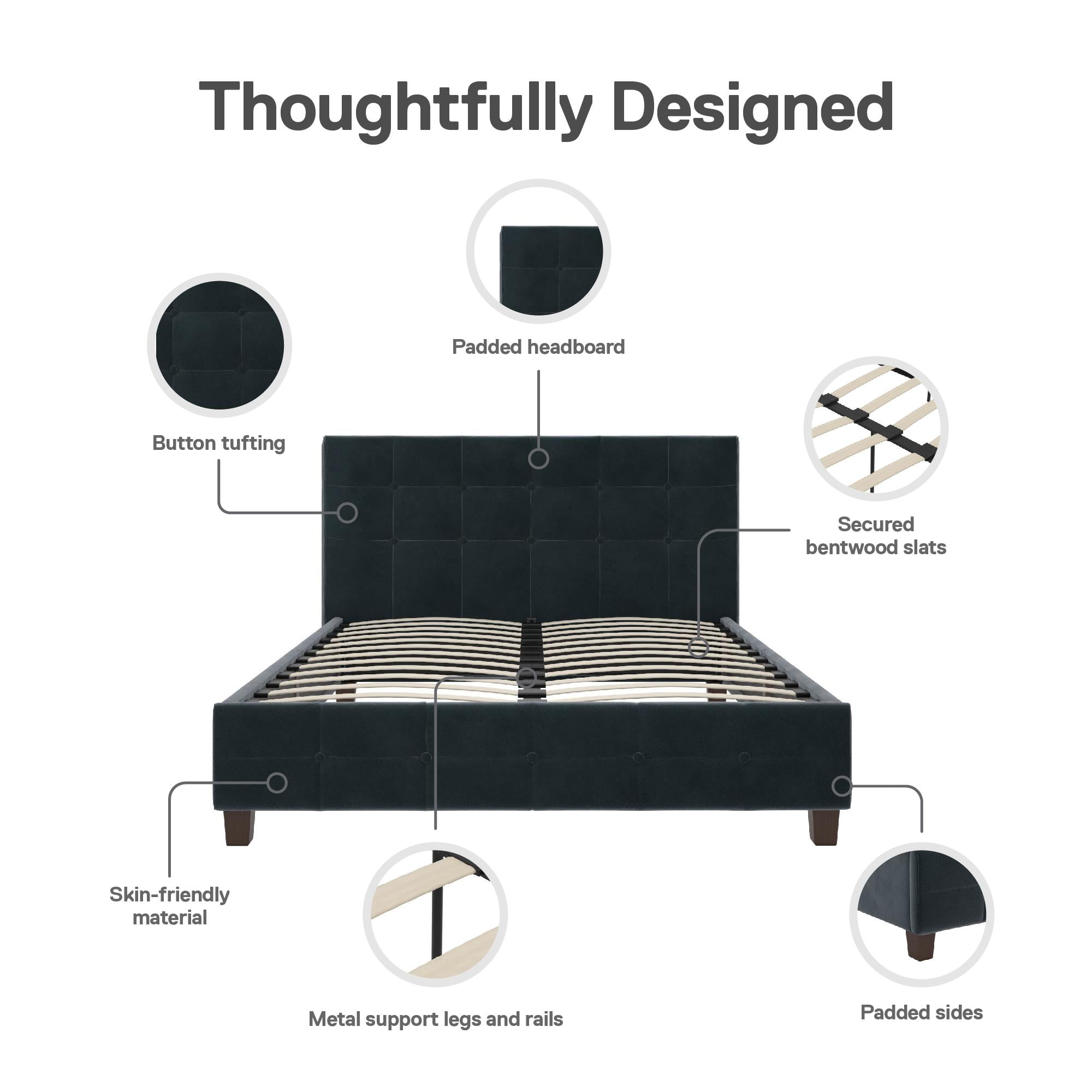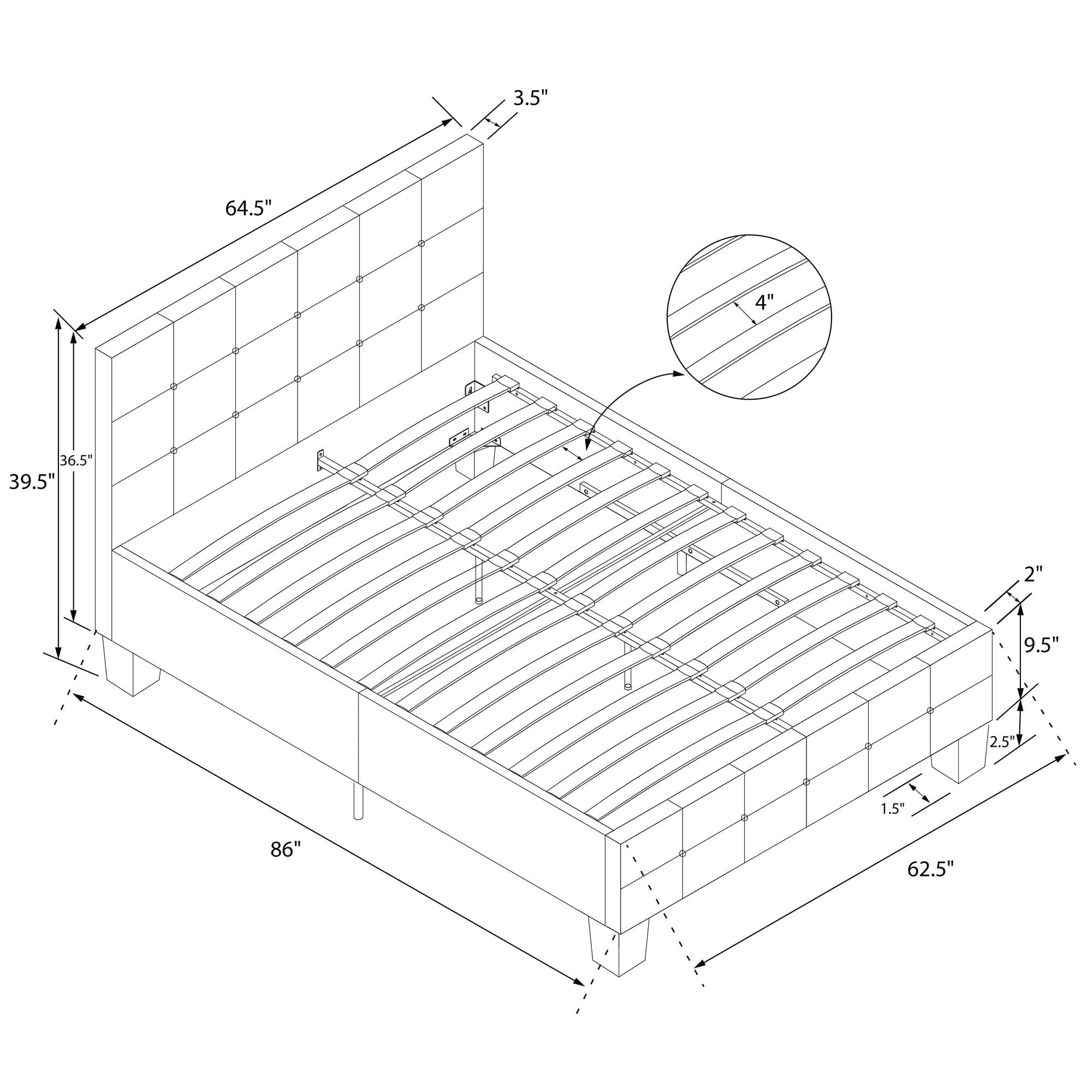 Space Saving: Designed to maximize bedroom space, this modern low profile upholstered bed rests on faux wood legs and features an elegant square button tufted headboard and bottom side board. Dimensions: 86″L x 64.5″W x 39.5″H. Max weight limit: 500 lbs Stylishly Comfortable: Enjoy a cozy place to rest your head and back thanks to the foam padded headboard extending all the way down to the slats for full back support and no pesky gaps. The raised edges keeps your mattress in place to prevent sliding Sturdy construction: Interior structure made from durable metal and wood create a stable frame supported by center legs and a metal bar for additional strength and reliability. All sides are foam padded for softness and all around protective comfort No Box Spring Needed: Sprung wood slats enhance your mattress’ comfort and longevity by providing optimal support. The replaceable bentwood slats are clipped in place to stay put and offer an excellent foundation for spring, hybrid or foam mattresses Stress-free Assembly: All tools and instructions are included and easy to follow. Get answers to all your questions with customer support 7 days a week by phone, email or chat. Easily order parts online or by phone. Enjoy a 1 year limited warranty